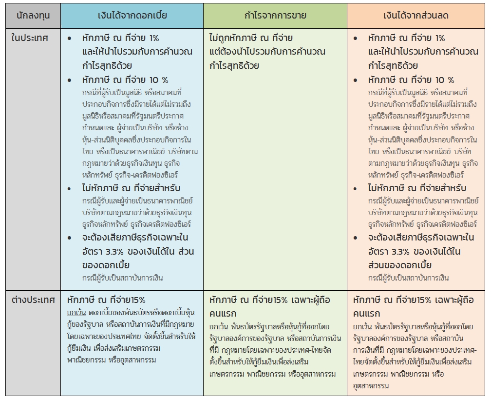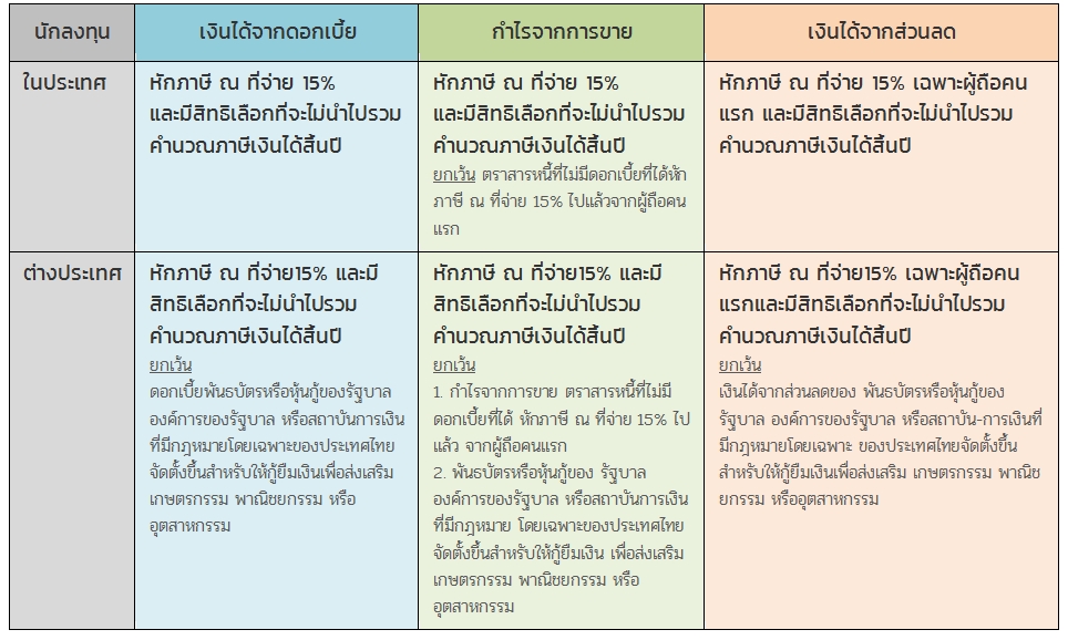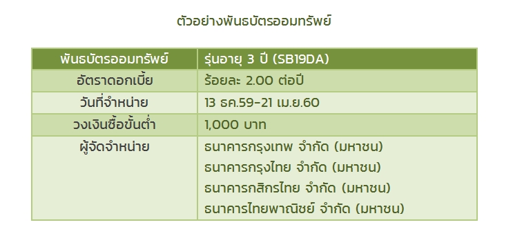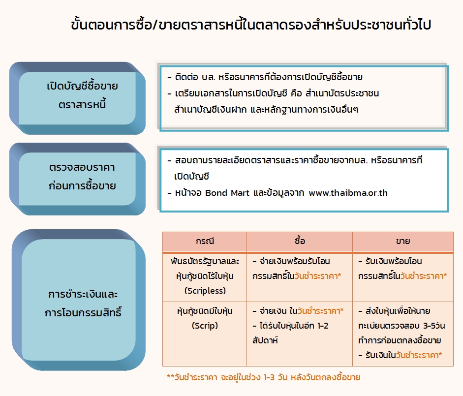 เริ่มต้นเรียนรู้ตราสารหนี้ 1. รู้จักตราสารหนี้ 2. เริ่มลงทุน 3. ความเสี่ยงจากการลงทุน 4. คำนวณราคา • มารู้จักกับพันธบัตร ตราสารหนี้ หุ้นกู้ นักลงทุนส่วนใหญ่มักจะคุ้นเคยกับตราสารทุน หรือ หุ้น เนื่องจากเป็นตราสารหนี้ที่เข้าใจง่าย ไม่มีความซับซ้อน แต่หากกล่าวถึงตราสารหนี้ หลายท่านก็มักจะเริ่มทำหน้าสงสัย แต่เมื่อกล่าวถึงพันธบัตรออมทรัพย์ หุ้นกู้ และตั๋วแลกเงิน ก็จะเริ่มถึงบางอ้อ บางท่านก็อาจจะเคยลงทุนบ้างแต่ก็มักจะไม่ทราบว่าทั้งหมดนี้เรียกโดยรวมว่า ตราสารหนี้ และไม่ทราบว่าตราสารหนี้เหล่านี้แตกต่างกันอย่างไร ทำไมถึงต้องมีชื่อเรียกที่แตกต่างกัน บทความนี้จึงเป็นการแนะนำให้ทุกท่านรู้จักกับตราสารหนี้มากขึ้น โดยจะขอนำเสนอด้วยแผนภาพ ดังต่อไปนี้ ตราสารหนี้ โดยหลัก ๆ แล้ว ออกโดย 3 กลุ่มหลัก ได้แก่ 1. รัฐบาล / หน่วยงานภาครัฐ ซึ่งจะประกอบไปด้วย 3 องค์กรย่อย ได้แก่ 1.1 รัฐบาล(Government) • ตั๋วเงินคลัง (Treasury bill): เป็นตราสารหนี้ระยะสั้น มีอายุไม่เกิน 365 วัน • พันธบัตรรัฐบาล (Loan bond): เป็นตราสารหนี้ระยะยาว มีอายุตั้งแต่ 365 วัน 1.2 ธนาคารแห่งประเทศ (Bank of Thailand) • ตั๋วเงินธนาคารแห่งประเทศไทย (Central bank bill): เป็นตราสารหนี้ระยะสั้น มีอายุไม่เกิน 365 วัน • พันธบัตรธนาคารแห่งประเทศไทย (Bank of Thailand bond): เป็นตราสารหนี้ระยะยาวมีอายุตั้งแต่ 365 วัน 1.3 รัฐวิสาหกิจ (State-owned-enterprise) • พันธบัตรรัฐวิสาหกิจ (State-owned-enterprise bond): เป็นตราสารหนี้ระยะยาว มีอายุมากกว่า 365 วัน 2. บริษัทเอกชน (Corporate company) ตราสารหนี้ที่ออกโดยกลุ่มนี้จะเรียกโดยรวมว่า หุ้นกู้ (Corporate bond)ทั้งนี้ สามารถเลือกออกเป็นระยะสั้น ซึ่งมีอายุไม่เกิน 270 วัน หรือ ระยะยาว ซึ่งมีอายุตั้งแต่ 270 วัน ก็ได้ 3. องค์กรต่างประเทศ (Foreign) ตราสารหนี้ที่ออกโดยกลุ่มนี้จะเรียกว่า ตราสารหนี้ต่างประเทศ (Foreign bond) โดยอาจจะเป็นบริษัทต่างชาติ หรือ หน่วยงานภาครัฐต่างชาติก็ได้ ส่วนใหญ่มักออกเป็นตราสารหนี้ระยะยาว • หุ้นกับหุ้นกู้ต่างกันอย่างไร “หุ้นกู้” จัดเป็นตราสารหนี้ ผู้ถือตราสารหรือนักลงทุน “มีสถานะเป็นเจ้าหนี้” ผลตอบแทนที่ได้จะมีความสม่ำเสมอและแน่นอนโดยอยู่ในรูปของดอกเบี้ย (Interest) ตลอดอายุตามเงื่อนไขที่ระบุไว้ โดยความเสี่ยงจะขึ้นอยู่กับอันดับความน่าเชื่อถือของผู้ออกตราสารหนี้ (Credit rating) ว่าบริษัทนั้นมีความแข็งแกร่งเพียงใด มีความสามารถในการชำระดอกเบี้ยและเงินต้นหรือไม่ “หุ้น” จัดเป็นตราสารทุน ผู้ถือตราสารหรือนักลงทุน“มีสถานะเป็นผู้ถือหุ้นหรือเป็นเจ้าของร่วมในบริษัท” ผลตอบแทนที่ได้จะไม่แน่นอน โดยจะมีทั้งส่วนต่างราคาหุ้น (Capital gain) ซึ่งมีความเสี่ยงจากการเปลี่ยนแ