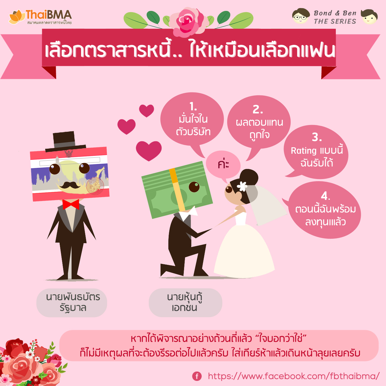 Posted by:ThaiBMA Posted on: October 01, 2017 Share this post with เลือกตราสารหนี้ให้เหมือนเลือกแฟน จะว่าไปแล้ว การเลือกลงทุนตราสารหนี้ก็เหมือนกับการเลือกคบแฟนสักคนนะครับคือเราไม่ควรดูเฉพาะภาพลักษณ์ภายนอกเพียงอย่างเดียว แต่ควรพิจารณานิสัยใจคอ ทัศนคติ หรือรูปแบบการใช้ชีวิตด้วย สำหรับการเลือกตราสารหนี้เพื่อลงทุนก็เช่นกันเราจะดูที่ผลตอบแทนที่สูงๆ เพียงอย่างเดียวไม่ได้หากต้องการลงทุนแล้วยังสามารถนอนหลับได้อย่างสบายใจเราต้องพิจารณาปัจจัยต่าง ๆ ด้วยเพื่อลดความเสียหายที่อาจเกิดขึ้นโดยมี 5 ขั้นตอนหลักๆ ในการเลือกแฟนซึ่งสามารถนำมาประยุกต์ใช้กับการเลือกตราสารหนี้ได้ดังนี้ 1. ตอบตัวเองให้ได้ว่ามีสเป็คในใจแบบไหน : เราทุกคนมีสเป็คเป็นของตัวเองว่าเราสนใจหรือชอบคนที่มีนิสัยและรูปร่างหน้าตาแบบใด ในการเลือกตราสารหนี้นั้นเมื่อเรารู้แล้วว่าตราสารหนี้หลัก ๆ มีประเภทใดบ้าง ก็จะทำให้เราจำกัดขอบเขตประเภทของตราสารหนี้ที่เราสนใจได้ไม่ยาก เช่น คนที่ชอบความมั่นคงมาก ๆ ก็อาจจะมุ่งเน้นไปที่พันธบัตรออมทรัพย์หรือหุ้นกู้ที่เรตติ้งสูง ๆ ขณะที่คนที่เน้นดอกเบี้ยสูง ๆ และรับความเสี่ยงได้ก็อาจจะพิจารณาหุ้นกู้ที่มีเรตติ้งไม่สูงนัก หรือที่เรียกว่า High Yield Bondเป็นต้น 2. ใช้เวลาศึกษาและทำความรู้จัก :เวลาที่เรารู้สึกถูกใจใครสักคน เราไม่ควรรีบร้อนตกลงปลงใจที่จะพัฒนาความสัมพันธ์ในทันทีเพราะเรายังไม่ได้รู้จักอีกฝ่ายมากพอ จึงต้องใช้เวลาในการพูดคุยและทำความรู้จักนิสัย ทัศนคติ และในมุมอื่น ๆ ซึ่งกันและกันมากขึ้น การเลือกตราสารหนี้ก็เช่นกันครับ ก่อนที่เราจะตัดสินใจลงทุนตราสารหนี้ใด ๆ เราก็ต้องศึกษาให้เข้าใจว่าตราสารหนี้ที่เราจะลงทุนว่ามีลักษณะอย่างไรบ้าง เช่น บริษัทที่ออกมีความมั่นคงมากน้อยเพียงใด ความเสี่ยงมีอะไรบ้าง มีสิทธิแฝงหรือไม่ เป็นต้น ซึ่งเราสามารถหาอ่านข้อมูลเหล่านี้ได้จากหนังสือชี้ชวนที่ได้บอกรายละเอียดไว้อย่างครบถ้วน 3. พิจารณาข้อดีข้อเสียเพื่อชั่งน้ำหนักว่าจะไปกันได้หรือไม่ :เมื่อเราได้เรียนรู้และศึกษากันระดับหนึ่งก็จะเริ่มเห็นถึงข้อดีข้อด้อยของอีกฝ่าย เราก็พอจะตอบตัวเองได้แล้วว่าเราสามารถที่จะพัฒนาความสัมพันธ์เพื่อไปต่อได้หรือไม่ เมื่อเทียบกับการเลือกตราสารหนี้ หลังจากที่เราได้ศึกษาข้อมูลจากหนังสือชี้ชวนก็จะทำให้เราพอจะประเมินความเหมาะสมและความเสี่ยงของตราสารหนี้ที่เราสนใจจะลงทุนได้ว่าตราสารหนี้นี้เหมาะกับเราหรือไม่ 4. สำรวจความพร้อมของตัวเอง :หลังจากที่ได้ศึกษาและพิจารณากันมาสักระยะแล้ว ก็ถึงเวล