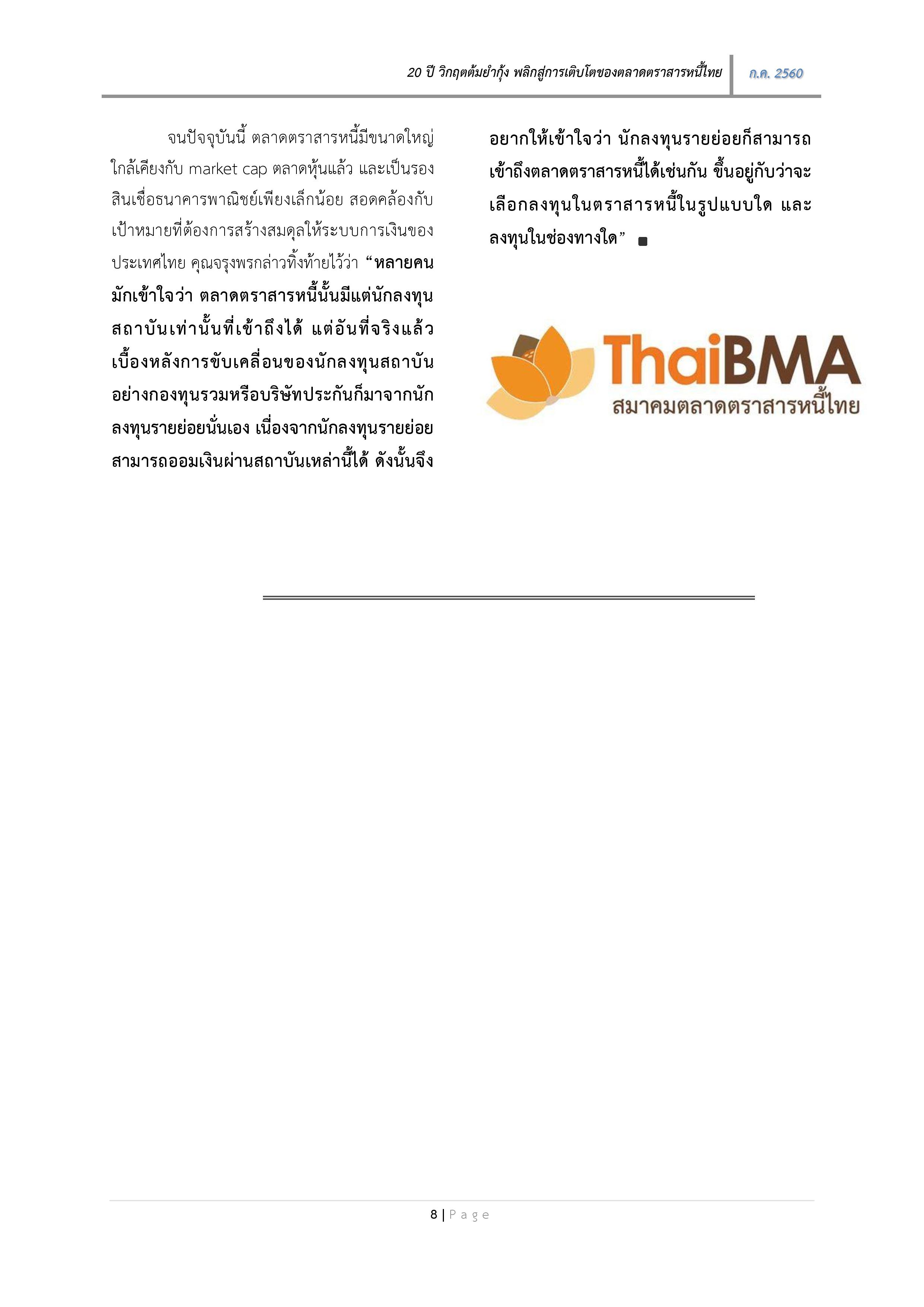 Bond Blogs Posted by:ThaiBMA Posted on: July 04, 2017 Share this post with All Blogs 2025 การศึกษาสภาพคล่องตราสารหนี้ไทยด้วยตัวชี้วัดสภาพคล่องเชิงปริมาณ เริ่มต้นอย่างไรกับ ESG Bond? ตลาด ESG bond โลกในปี 2024 ตลาดรองตราสารหนี้ไทย ช่องทางการซื้อหรือขายตราสารหนี้ Credit Guarantee Investment Facility (CGIF) ในฐานะองค์กรค้ำประกันหุ้นกู้ ค่าใช้จ่ายในการออกและเสนอขายหุ้นกู้ในประเทศไทย 2024 ตราสารหนี้เพื่อการอนุรักษ์เสือโคร่ง (Tiger ecosystem bond) 30 ปี ThaiBMA เส้นทางการพัฒนาตลาดตราสารหนี้ไทย CAT Bond ตราสารหนี้ภัยพิบัติ แนวโน้มหุ้นกู้ครบกำหนดอายุ Highlight ตลาดตราสารหนี้ไทยปี 2023 2023 สาระสำคัญจากงานสัมมนา “Enable ESG Bond Issuance: Global Dynamic & Thailand Framework Development” การถือครองตราสารหนี้ไทยของนักลงทุนต่างชาติ Facts: หุ้นกู้ครบกำหนดในปีหน้า (2024) Par Value คืออะไร พัฒนาการของตลาด ESG Bonds ของไทยเปรียบเทียบกับยุโรป 5 ปีผ่านไป ตลาดหุ้นกู้เปลี่ยนไปขนาดไหน ถ้าผู้ออกหุ้นกู้ถูกฟ้องล้มละลาย ผู้ถือหุ้นกู้ต้องทำอย่างไร ลงทุนในหุ้นกู้ต้องรู้จักอันดับเครดิต Highlight Q2 2023 "ESG bonds ในอาเซียน+3 ข้อดี-ข้อเสีย ของการลงทุนในตราสารหนี้...มีอะไรบ้าง 5 สิ่งควรรู้ก่อนลงทุนตราสารหนี้ การออก ESG Bond ของไทย Transition bond ตราสารหนี้เปลี่ยนผ่านสู่ความยั่งยืน IC Bond ตราสารหนี้เพื่อนับเป็นเงินกองทุนของบริษัทประกันภัย สิ่งที่ควรรู้เกี่ยวกับเส้นอัตราผลตอบแทน (Yield curve) Basis Points คืออะไร - ต่างจากเปอร์เซ็นต์อย่างไร? ลงทุนตราสารหนี้ต้องจ่ายภาษีไหม อยากรู้ว่าหุ้นกู้มีการซื้อขายบ้างไหม ราคาซื้อขายเป็นยังไง จะดูได้ที่ไหน 2022 เช็กราคาซื้อขายล่าสุด หรือราคา mark to market ของหุ้นกู้ได้ที่ไหน การซื้อขายหุ้นกู้ในตลาดรอง คำนวณราคายังไง ทำไมหุ้นกู้คราวด์ฟันดิงถึงให้ผลตอบแทนสูง ต่างจากหุ้นกู้ปกติอย่างไร สัญลักษณ์ตราสารหนี้...อ่านอย่างไรและบอกอะไรบ้าง Breakeven Inflation คืออะไร? และ บอกอะไร? BOND INFO แหล่งรวมข้อมูลตราสารหนี้ไทย ตอน รู้จักหุ้นกู้กับเมนู “Issuer Search” รู้จัก Basel III Bond หุ้นกู้เพื่อนับเป็นเงินกองทุนของธนาคารพาณิชย์ Baht bond คืออะไร ต่างจากหุ้นกู้ปกติไหม? ทางเลือกการลงทุนในยุคเงินเฟ้อสูง...พันธบัตรชดเชยเงินเฟ้อ (Inflation Linked Bond) ตราสารหนี้ผลตอบแทนติดลบกำลังจะ “สูญพันธุ์” หุ้นกู้ที่เสนอขาย HNW จะขายต่อในตลาดรองให้นักลงทุนบุคคลทั่วไปได้ไหม? Prize Bond ตราสารหนี้ลุ้นรับโชค อัพเดต! นิยามใหม่ “ผู้ลงทุนรายใหญ่ (High Net Worth)” มีผลบังคับใช้ 1 ต.ค. 2565 นี้ รัฐบาลอินเดียเตรียมออกพันธบัตรสีเขียวครั้งแรกเพื่อมุ่งสู่สังคมคาร์บอนต่ำอย่างยั่งยืน รัฐบาลแคนาดาร่วมขบวนรักษ์โลก...ออกพันธบัตรสีเขียวครั้งแรก Blue bond...ตราสารหนี้สีฟ้า..รักษ์ทะเล ESG bonds ของไทยใช้เงินหลากหลายและน่าสนใจแค่ไหน? Highlight 2021 "ESG bonds ในอาเซียน+3" 2021 ADB ออก Blue Bond ครั้ง