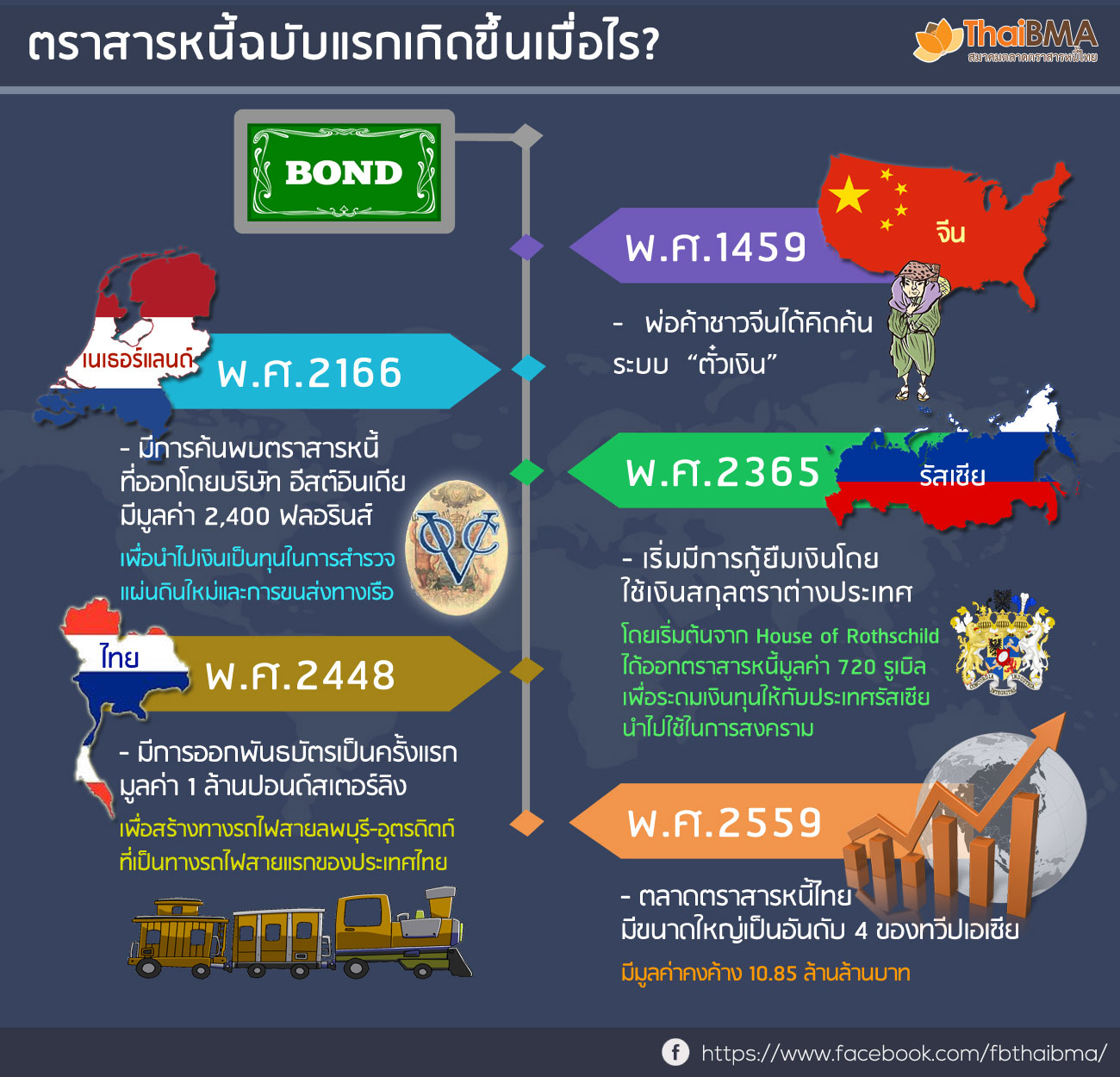 Posted by:ThaiBMA Posted on: June 07, 2017 Share this post with ตราสารหนี้ฉบับแรกเกิดขึ้นเมื่อไร? ปัจจุบันตราสารหนี้ถูกนำมาใช้เป็นเครื่องมือทางการเงินหนึ่งที่ใช้กันอย่างแพร่หลาย สำหรับประเทศไทย ตลาดตราสารหนี้มีการเติบโตอย่างต่อเนื่อง ในช่วง 10 ปีที่ผ่านมา มูลค่าคงค้าง (Outstanding Value) เพิ่มขึ้นเฉลี่ยกว่า 10% ต่อปี จาก 4.32 ล้านล้านบาทในปี 2549 เป็น 10.85 ล้านล้านบาทในปี 2559 มีขนาดใหญ่เป็นอันดับ 4 ของทวีปเอเซีย เป็นรองก็เพียงประเทศญี่ปุ่น จีน และ เกาหลี เท่านั้นแล้วตราสารหนี้กำเนิดเกิดขึ้นมาได้อย่างไร ใครเป็นคนคิดค้นนะ? ย้อนกลับไปในปีพ.ศ.1459-1668 พ่อค้าชาวจีนได้คิดค้นระบบ ”ตั๋วเงิน” ขึ้น โดยนำเหรียญทองแดงไปฝากไว้กับเจ้าหน้าที่รัฐและนำใบรับฝากมาถือไว้กับตนเอง ตั๋วเงินดังกล่าวสามารถนำไปแลกเปลี่ยนกับผู้อื่นได้ คุณลักษณะของตั๋วเงินดังกล่าวเป็นเพียงเอกสารรับฝากทรัพย์สินเท่านั้นยังไม่ถือเป็นตราสารหนี้ จนกระทั่งในปี 2166 ได้มีการค้นพบตราสารหนี้ที่ออกโดยบริษัท อีสต์อินเดีย เป็นบริษัทการค้าของประเทศเนเธอร์แลนด์ มีมูลค่า 2400 ฟลอรินส์ (เงินสกุลเนเธอร์แลนด์) เพื่อนำไปเงินเป็นทุนในการสำรวจแผ่นดินใหม่และการขนส่งทางเรือการออกตราสารหนี้ฉบับนี้เป็นการเพิ่มช่องการลงทุนครั้งแรก จากเดิมที่จะสามารถกู้ยืมกับภาครัฐเท่านั้นซึ่งถือได้ว่าเป็นตราสารหนี้ที่เก่าแก่ที่สุดเท่าที่เคยค้นพบ ทำให้พออนุมานได้ว่าการกู้ยืมโดยใช้ตราสารหนี้เป็นเครื่องมือได้มีมานานไม่ต่ำกว่า 400 ปีมาแล้ว เมื่อเวลาผ่านไป การกู้ยืมโดยใช้ตราสารหนี้เริ่มมีการพัฒนามากขึ้นจนเริ่มมีการกู้ยืมเงินโดยใช้เงินตราต่างประเทศ ซึ่งปัจจุบันเป็นที่รู้จักกันดี ในชื่อ ตราสารหนี้เงินตราต่างประเทศ (Foreign currency denominated bonds) โดยเริ่มต้นจาก House of Rothschild ได้ออกตราสารหนี้มูลค่า 720 รูเบิล (เงินสกุลรัสเซีย) ในปี 2365 เพื่อระดมเงินทุนให้กับประเทศรัสเซียนำไปใช้ในการเข้าร่วมสงครามที่ต้องการโค่นล้มจักรพรรดินโปเลียนของฝรั่งเศสโดยลักษณะเด่นของตราสารหนี้ฉบับนี้ คือผู้ถือครองตราสารหนี้สามารถไถ่ถอนเงินได้ที่ House of Rothschild ในลอนดอน แฟรงค์เฟิร์ต ปารีส และเวียนนา เนื่องจากในขณะนั้นการขอรับเงินคืนจำเป็นต้องไปยังสถานที่ออกตราสารหนี้เท่านั้น จะเห็นว่า ตราสารหนี้ฉบับแรกของโลกนั้นเกิดขึ้นมาตั้งแต่ปี พ.ศ. 2166 หรือกว่า 400 ปีที่แล้ว อ้าว แล้วมีคนสงสัยไหมว่า แล้วตราสารหนี้ฉบับแรกของประเทศไทยเกิดขึ้นตั้งแต่เมื่อไร ในรัชสมัยอะไร ออกมาเพื่ออะไร และมีความสำคัญต่อการพัฒนาเศรษฐกิจและสังคมของประเทศไทยอย่างไร ในครั้งหน้าเราจะนำคำตอบเหล่านี้มาเล่าให้แ