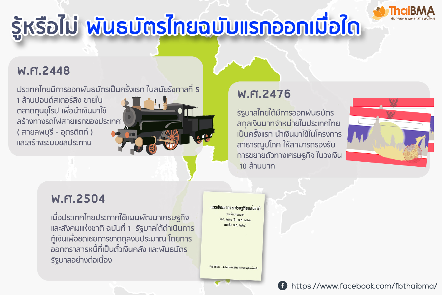 Posted by:ThaiBMA Posted on: August 07, 2017 Share this post with รู้หรือไม่ พันธบัตรไทยฉบับแรกออกมาเมื่อใด จากบทความ “ตราสารหนี้ฉบับแรกเกิดขึ้นเมื่อไร?” ก่อนหน้านี้ ได้กล่าวถึงการออกตราสารหนี้ฉบับแรกของโลก เพื่อระดมเงินทุนสำหรับการสำรวจแผ่นดินใหม่และการขนส่งทางเรือในช่วงปี พ.ศ.2166 หรือเมื่อ 400 ปีก่อนแล้วสำหรับประเทศไทยท่านทราบหรือไม่ว่าการออกตราสารหนี้ฉบับแรกเกิดขึ้นเมื่อไร และเงินที่ได้นำมาใช้พัฒนาโครงการใดของประเทศ การออกตราสารหนี้ครั้งแรกของประเทศไทยเกิดขึ้นเมื่อประมาณ 100 กว่าปีก่อนในรัชสมัยของพระบาทสมเด็จพระจุลจอมเกล้าเจ้าอยู่หัว รัชกาลที่ 5 แห่งราชวงศ์จักรีซึ่งเป็นยุคสมัยของการพัฒนาประเทศให้เท่าทันอารยประเทศ แต่ลำพังเพียงรายได้ของประเทศที่มาจากสินค้าเกษตรเป็นหลักยังไม่เพียงพอที่จะพัฒนาโครงสร้างพื้นฐานของประเทศได้ รัฐบาลจึงจำเป็นต้องออกพันธบัตรเพื่อระดมเงินทุน ตราสารหนี้รุ่นแรกของประเทศไทย ตราสารหนี้ฉบับแรกในประวัติศาสตร์ของประเทศไทยได้กำเนิดขึ้นเมื่อวันที่ 15 มีนาคม2448 เป็นการออกพันธบัตรรัฐบาลในสกุลเงินต่างประเทศจำหน่ายแก่นักลงทุนในยุโรป โดยออกในลอนดอนและปารีส ด้วยวงเงินรวม 1 ล้านปอนด์สเตอร์ลิง อัตราดอกเบี้ยร้อยละ 4.5 ต่อปี อายุ 40 ปี โดยมี Call option คือผู้ออกสามารถชำระหนี้ทั้งจำนวนหรือบางส่วนก่อนครบกำหนดอายุได้ตั้งแต่ปีที่ 10 เงินที่ได้จากพันธบัตรนำไปใช้สร้างทางรถไฟสายลพบุรี-อุตรดิตถ์ ซึ่งเป็นทางรถไฟสายแรกของประเทศไทย และส่วนหนึ่งใช้สร้างระบบชลประทาน และสาธารณประโยชน์อื่นๆรวมถึงเป็นเงินคงคลัง รัฐวิสาหกิจไทยแห่งแรกที่ออกตราสารหนี้ หลังจากนั้นรัฐบาลไทยได้ออกพันธบัตรรัฐบาลในตลาดทุนยุโรปอีกหลายครั้ง และในปี พ.ศ. 2452 กรมรถไฟได้ออกพันธบัตรเพื่อกู้เงินจากรัฐบาลสหพันธรัฐมลายู เพื่อนำมาสร้างทางรถไฟสายใต้ จำนวน 4.6 ล้านปอนด์สเตอร์ลิง อัตราดอกเบี้ยร้อยละ 4 ต่อปี อายุ 40 ปี กรมการรถไฟหรือการรถไฟแห่งประเทศไทยจึงถือเป็นรัฐวิสาหกิจแห่งแรกของไทยที่ทำการออกตราสารหนี้ ตราสารหนี้สกุลเงินบาทรุ่นแรก หลังจากการออกพันธบัตรรัฐบาลฉบับแรกที่เป็นสกุลเงินต่างประเทศเกือบ 30 ปีเมื่อพ.ศ.2476 หรือเกือบ 90ปีที่แล้วกระทรวงการคลังได้เริ่มออกพันธบัตรรัฐบาลในสกุลเงินบาทเป็นครั้งแรกในวงเงิน 10 ล้านบาท จำหน่ายให้แก่ประชาชนทั่วไปโดยมีอัตราดอกเบี้ยร้อยละ 4.5 ต่อปี อายุ 10 ปี โดยมีวัตถุประสงค์เพื่อนำเงินมาใช้ลงทุนในโครงการสาธารณูปโภคต่างๆเพื่อรองรับการขยายตัวทางเศรษฐกิจของประเทศ จากนั้นรัฐบาลไทยได้ดำเนินการออกพันธบัตรอย่างต่อเนื่อ