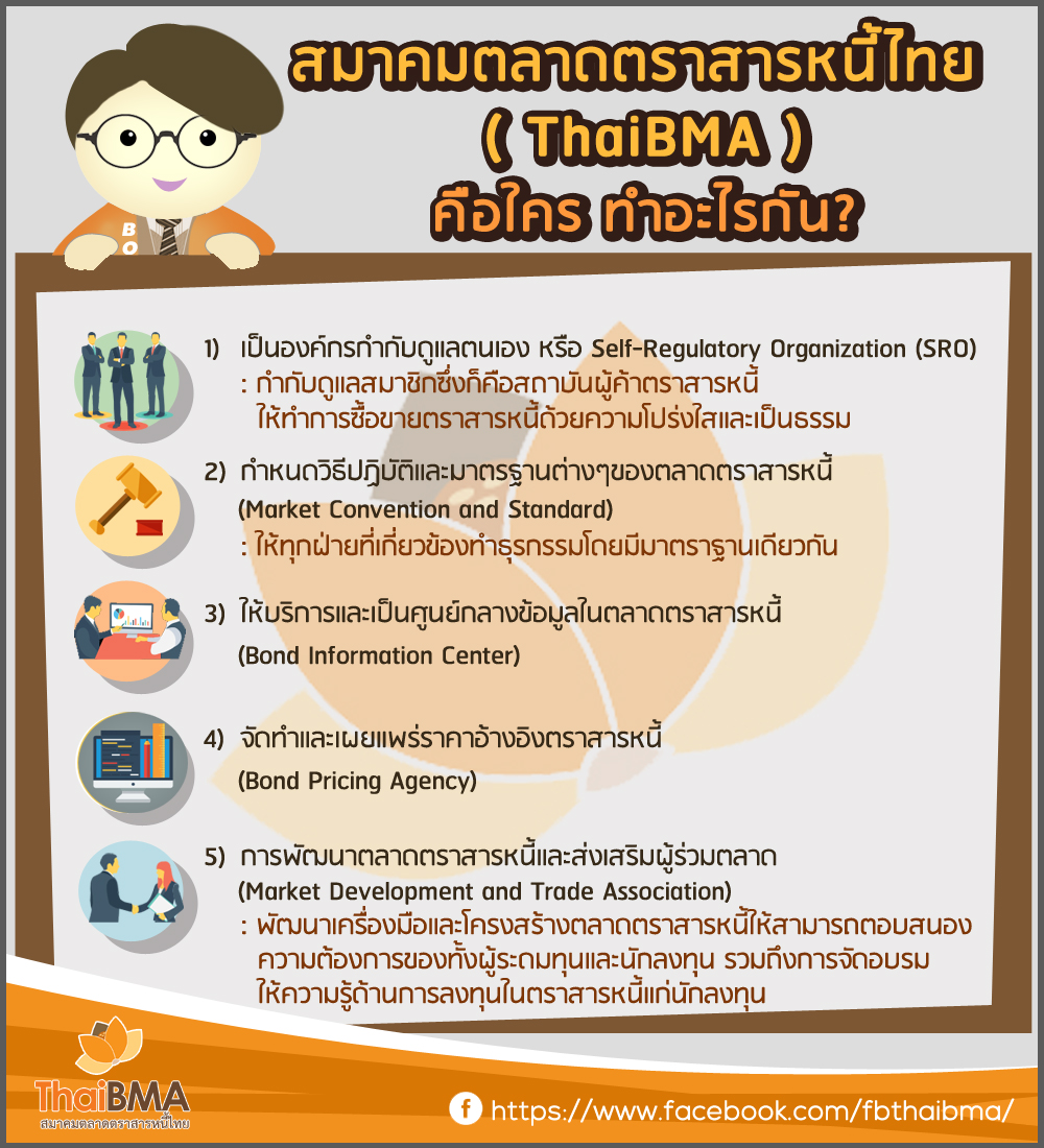 Posted by:ThaiBMA Posted on: Nov. 07, 2017 Share this post with สมาคมตลาดตราสารหนี้ไทย (ThaiBMA)คือใคร ทำอะไรกัน? “สมาคมตลาดตราสารหนี้ไทย” หรือ “ThaiBond Market Association” เรียกย่อๆ ว่าThaiBMAนักลงทุนน่าจะเคยผ่านหูผ่านตาชื่อนี้กันมาบ้าง แต่เชื่อว่าหลายๆ ท่านยังงงๆ ว่าThaiBMA เป็นหน่วยงานประเภทไหน มีหน้าที่เกี่ยวกับอะไร วันนี้เราขอแนะนำตัวกันอีกสักที ThaiBMAจัดตั้งขึ้นมาตั้งแต่ปี 2537 จนถึงปัจจุบันก็มีอายุ 23 ปีแล้ว โดยมีวัตถุประสงค์หลักที่ได้รับมอบหมายจากสำนักงาน ก.ล.ต. ให้กำกับดูแลสมาชิกในการประกอบธุรกรรมการค้าตราสารหนี้ ทั้งนี้บทบาทหน้าที่ของ ThaiBMA ได้มีการปรับให้สอดคล้องกับพัฒนาการของตลาดตราสารหนี้ที่ผ่านมา จนในปัจจุบัน เรามีบทบาทหน้าที่หลัก 5 ด้านด้วยกันตรงกับ 5 กลีบของดอกไม้ที่เป็นโลโก้ของเรา 1) การเป็นองค์กรกำกับดูแลตนเอง หรือ Self-Regulatory Organization (SRO) ทำหน้าที่กำกับดูแลสมาชิกเพื่อให้การประกอบธุรกรรมการค้าตราสารหนี้เป็นไปอย่างโปร่งใสเป็นธรรม และสร้างความเชื่อมั่นให้แก่นักลงทุน ด้วยการกำหนดกฎระเบียบ จรรยาบรรณมาตรฐานการปฏิบัติในตลาดรองตราสารหนี้ รวมถึงการตรวจสอบพิจารณาความผิดและกำหนดบทลงโทษผู้ค้าตราสารหนี้ที่ไม่ปฏิบัติตามกฎเกณฑ์ที่เกี่ยวข้องให้ไม่เกิดการเอาเปรียบกันภายในตลาด หรือการกระทำที่ไม่เป็นธรรมต่อลูกค้า 2) การกำหนดวิธีปฏิบัติและมาตรฐานต่างๆของตลาดตราสารหนี้ (Market Convention and Standard)เพื่อให้สมาชิกและทุกฝ่ายที่เกี่ยวข้องดำเนินธุรกรรมโดยมีมาตรฐานเดียวกัน เช่น การกำหนดสัญลักษณ์มาตรฐานให้รู้ถึงวันครบกำหนดของตราสารหนี้นั้นๆ การกำหนดมาตรฐานการคำนวณราคาตราสารหนี้ประเภทต่างๆเพื่อให้ผู้ร่วมตลาดได้รับราคาที่ยุติธรรมที่สุด รวมถึงการกำหนดมาตรฐานด้านงานทะเบียนตราสารหนี้ 3) การให้บริการและเป็นศูนย์กลางข้อมูลในตลาดตราสารหนี้ (Bond Information and Service Center)ในการรวบรวมและเผยแพร่ข้อมูลต่างๆของตราสารหนี้ทั้งภาครัฐและเอกชน ประกอบด้วยข้อมูลการซื้อขายในตลาดรอง ข้อมูลพื้นฐานของตราสารหนี้แต่ละรุ่น (Bond Features) ข้อมูลราคาอ้างอิงต่างๆ (Reference yield) ตลอดจนข่าวสารต่างๆที่เกี่ยวข้องกับการลงทุนผ่านทาง www.thaibma.or.th และ Fanpage Facebook ThaiBMA 4) จัดทำและเผยแพร่ราคาอ้างอิงตราสารหนี้(Bond Pricing Agency)บทบาทการให้บริการด้านข้อมูลที่สำคัญอีกประการหนึ่ง คือ การทำหน้าที่ “Bond Pricing Agency”เพื่อเผยแพร่ราคาอ้างอิงสำหรับการ mark-to-market ของผู้ลงทุนโดยเฉพาะกองทุนรวมต่างๆ ทั้งนี้ เพื่อกำหนดราคายุติธรรมสำหรับตราสารหนี้ 5) การพัฒนาตลาดตราสารหนี้และส่งเสริมผู้ร่วมตลาด (Market Development and Trade Association)มีบทบาทในการขับเคลื่อนการพัฒนาตลาดตราสารหนี้ในมิติต่างๆรวมถึงการพัฒน