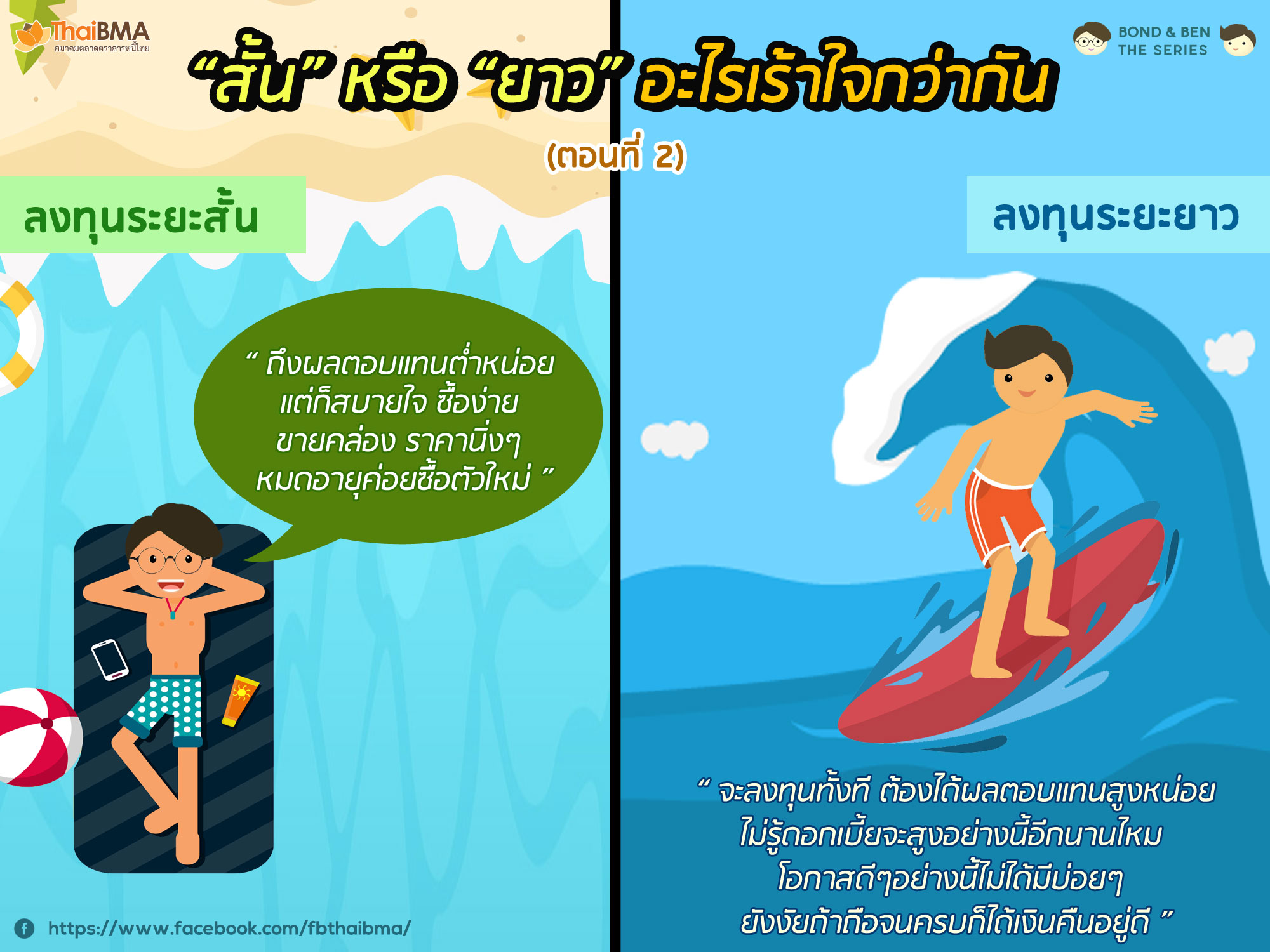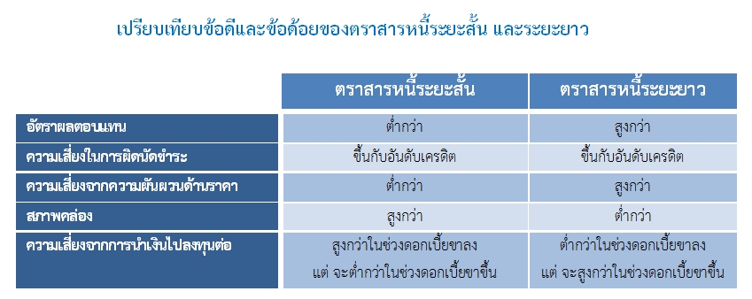Posted by:ThaiBMA Posted on: September 16, 2017 Share this post with “สั้น” หรือ “ยาว” อะไรเร้าใจกว่ากัน (ตอนที่ 2) อย่างที่ได้กล่าวไว้ในครั้งที่แล้วว่า การลงทุนในตราสารหนี้ระยะสั้น หรือระยะยาว ไม่ได้มีกำหนดระยะเวลาที่เป็นมาตรฐานสากลว่านานแค่ไหนคือระยะสั้น หรือระยะยาว แต่ส่วนใหญ่จะเข้าใจว่าการลงทุนระยะยาวคือ ลงทุนในตราสารหนี้ที่อายุมากกว่า 1 ปีขึ้นไป (>1ปี) และการลงทุนระยะสั้นคือ น้อยกว่าหรือเท่ากับ 1 ปี (≤1ปี) โดยเมื่อเวลาผ่านไป ตราสารหนี้จะมีอายุคงเหลือน้อยลงเรื่อยๆ จากที่เคยเป็นตราสารหนี้ระยะยาวเมื่อตอนที่ออก ก็จะกลายเป็นตราสารหนี้ระยะสั้น ที่มีอายุคงเหลือน้อยลงๆ จนครบกำหนดและถูกไถ่ถอนไป ซึ่งเป็นลักษณะเฉพาะที่สำคัญที่ทำให้ตราสารหนี้แตกต่างจากหุ้นในหลายๆ มิติ หากสามารถเลือกลงทุนได้ตรงตามเงื่อนไขและความต้องการของเราแล้ว ไม่ว่าจะลงทุนในตราสารหนี้ระยะสั้นหรือระยะยาวก็เร้าใจได้ไม่แพ้กัน ทีนี้แล้วการลงทุนในตราสารหนี้ระยะสั้นและระยะยาวมีจุดเด่นหรือจุดด้อยอย่างไร มาติดตามกัน o อัตราคูปอง หรือผลตอบแทน หากเปรียบเทียบตราสารหนี้ที่มีคุณลักษณะเหมือนๆ กัน ต่างกันเพียงระยะเวลาการกู้ยืม ตราสารหนี้ระยะสั้นจะให้คูปองหรือผลตอบแทนต่ำกว่าตราสารหนี้ระยะยาว (ติดตามอ่านเพิ่มเติมได้จาก “Yield curve ตัวช่วยการลงทุนตราสารหนี้) o ความเสี่ยงในการผิดนัดชำระตามความรู้สึกของนักลงทุนส่วนใหญ่มักจะเข้าใจกันว่าซื้อตราสารหนี้ระยะสั้นอายุ 3 เดือนปลอดภัยกว่าซื้อตราสารหนี้ระยะยาวอายุ 3 ปีที่ออกโดยบริษัทเดียวกันเนื่องจากคิดว่าภายในระยะเวลา 3 เดือน ผู้ออกจะมีฐานะทางการเงินเปลี่ยนแปลงไปจากที่มั่นคงเป็นย่ำแย่น่าจะมีโอกาสเป็นไปได้ต่ำกว่าในระยะเวลา 3 ปี แต่ในทางทฤษฎีแล้วความเสี่ยงในการผิดนัดชำระไม่ได้ขึ้นอยู่กับระยะเวลาการกู้ยืม แต่ขึ้นอยู่กับความน่าเชื่อถือของผู้กู้ที่ดูได้จากการจัดอันดับเครดิต เพราะการผิดนัดชำระในระยะสั้นหรือระยะยาวมีสาเหตุที่แตกต่างกัน เปรียบเสมือนนักวิ่งมาราธอนอาจไม่ได้วิ่งเร็วที่สุดถ้าให้มาแข่งขันวิ่ง 100 เมตรดังนั้นแล้วความเสี่ยงในการผิดนัดชำระจึงไม่ขึ้นอยู่กับระยะเวลาการกู้ยืม แต่ขึ้นกับปัจจัยที่แตกต่างกันซึ่งสามารถสะท้อนผ่านทางอันดับเครดิต โดยอันดับเครดิตจะแบ่งเป็น อันดับเครดิตองค์กร และอันดับเครดิตรายตราสารทั้งตราสารหนี้ระยะสั้นหรือระยะยาวซึ่งผู้ออกตราสารหนี้ของไทยมักจะจัดอันดับเครดิตตราสารหนี้ระยะยาวตามกฎเกณฑ์ของสำนักงาน กลต. o ความเสี่ยงจากความผันผวนด้านราคาต่ำ ราคาตราสารหนี้จะเปลี่ยนแปลงในทิ