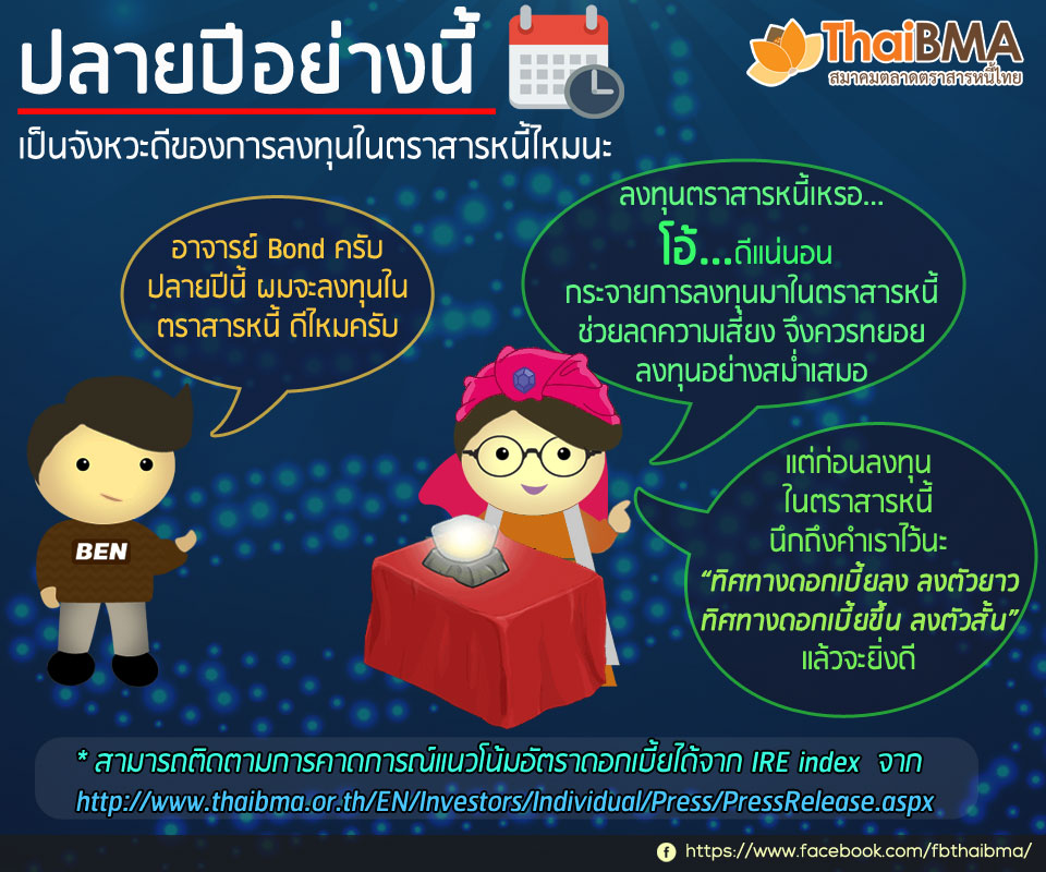 Bond Blogs Posted by:ThaiBMA Posted on: Dec. 22, 2017 Share this post with ปลายปีอย่างนี้ เป็นจังหวะดีของการลงทุนในตราสารหนี้ไหมนะ คำถามที่มักจะถูกถามอยู่บ่อยๆ คือ ตอนนี้เป็นจังหวะที่ดีของการลงทุนในตราสารหนี้ไหม? เนื่องจากนักลงทุนเชื่อว่าจังหวะในการเข้าซื้อมีความสำคัญอย่างมากในการลงทุนจากความคุ้นเคยกับการลงทุนในตลาดหุ้นซึ่งผลตอบแทนส่วนใหญ่มาจากส่วนต่างราคาซื้อขาย (Capital gain)จนมีคำกล่าวที่ว่า “ตกรถไฟดีกว่าขึ้นรถไฟผิดขบวน”คือพลาดจังหวะที่ดีของการซื้อหุ้นยังดีเสียกว่าซื้อหุ้นผิดจังหวะ ซึ่งเมื่อนักลงทุนต้องการลงทุนในตราสารหนี้ จึงตั้งคำถามในลักษณะเดียวกันคือ ช่วงนี้เป็นจังหวะที่ดีในการเข้าซื้อหรือยัง? จากคุณลักษณะของตราสารหนี้ที่ต่างจากหุ้น จึงทำให้การลงทุนในตราสารหนี้แตกต่างจากการลงทุนในหุ้น ลักษณะที่สำคัญของตราสารหนี้ซึ่งมีกำหนดเวลาไถ่ถอนที่แน่นอน และมีกำหนดการจ่ายคูปองที่ชัดเจน ส่งผลให้จังหวะการเข้าซื้อมีความสำคัญในลักษณะที่ต่างจากหุ้นอย่างมาก ดังนี้ การลงทุนในตราสารหนี้เราต้องการให้ได้รับดอกเบี้ยให้มากที่สุดในระดับความเสี่ยงที่ยอมรับได้ดังนั้นจังหวะการลงทุนจึงขึ้นกับแนวโน้มอัตราดอกเบี้ย ถ้าดอกเบี้ยในตลาดมีแนวโน้มลดลง นักลงทุนควรจะลงทุนในตราสารหนี้ระยะยาวเพื่อที่จะได้ดอกเบี้ยสูงๆ(อัตราดอกเบี้ยในปัจจุบัน)ไปนานๆ เพราะคาดว่าถ้าตราสารหนี้หมดอายุ แล้วนำเงินไปลงทุนตราสารหนี้รุ่นใหม่จะได้ดอกเบี้ยน้อยลง ในทางตรงกันข้ามหากดอกเบี้ยมีแนวโน้มเป็นขาขึ้น นักลงทุนควรจะลงทุนในตราสารหนี้ระยะสั้น เพราะเมื่อตราสารหนี้ครบอายุก็จะสามารถนำเงินไปลงทุนใหม่ในอัตราดอกเบี้ยที่สูงขึ้นนั่นเอง นอกจากนี้ราคาของตราสารหนี้จะผกผันกับอัตราดอกเบี้ย เมื่อดอกเบี้ยปรับขึ้นราคาตราสารหนี้จะลดลง โดยยิ่งตราสารหนี้อายุคงเหลือมากราคาก็จะยิ่งลดลงมาก ในทางกลับกันเมื่ออัตราดอกเบี้ยลดลง ราคาตราสารหนี้จะสูงขึ้น โดยตราสารหนี้อายุคงเหลือยิ่งยาว ราคาก็จะยิ่งเพิ่มขึ้นมากดังนั้น นักลงทุนจึงควรลงทุนในระยะสั้นในช่วงดอกเบี้ยขาขึ้นเพื่อลดโอกาสขาดทุนกรณีที่ต้องการขายก่อนครบกำหนด และลงทุนในตราสารหนี้ระยะยาวในช่วงดอกเบี้ยขาลงเพราะจะได้กำไรจากราคาที่ปรับตัวสูงขึ้นนั่นเอง โดยสรุปก็คือ การลงทุนในตราสารหนี้เหมาะกับการลงทุนในทุกช่วงเวลาเพียงแค่ว่าช่วงไหนเหมาะกับการลงทุนในตราสารหนี้ระยะสั้นช่วงไหนเหมาะแก่การลงทุนในตราสารหนี้ระยะยาวเท่านั้นเอง ส่วนแนวโน้มอัตราดอกเบี้ยสามารถติดตามการคาดการณ์ได้จากข้อมูล IRE index ซึ่งจะมีกา