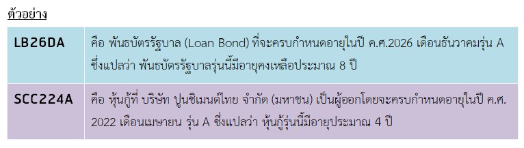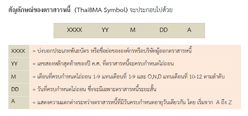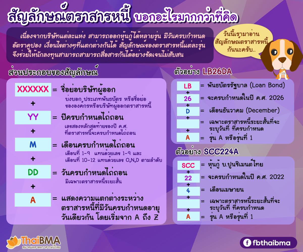 Posted by:ThaiBMA Posted on: Jun. 01, 2018 Share this post with สัญลักษณ์ตราสารหนี้บอกอะไรมากกว่าที่คิด นักลงทุนในตลาดหุ้นน่าจะคุ้นเคยกับชื่อย่อของหุ้นต่างๆกันอยู่แล้ว เช่น PTT หมายถึง บริษัท ปตท. จำกัด (มหาชน)หรือ CPALL หมายถึง บริษัท ซีพี ออลล์ จำกัด (มหาชน)แล้วเคยสงสัยกันไหมครับว่าบริษัทเหล่านี้เวลาออกหุ้นกู้จะใช้ชื่อย่อของตราสารหนี้เหมือนหรือแตกต่างจากหุ้นสามัญอย่างไร เนื่องจากบริษัท 1 แห่ง เวลาออกหุ้นสามัญไม่ว่าจะในการเสนอขายครั้งแรกหรือการเพิ่มทุนครั้งต่อๆมา หุ้นสามัญนั้นก็จะมีลักษณะเหมือนกันทุกประการดังนั้นจึงใช้ชื่อย่อเดียวกัน แต่สำหรับตราสารหนี้แล้ว บริษัท 1 แห่งสามารถออกหุ้นกู้ได้หลายรุ่นที่มีลักษณะแตกต่างกันได้ เช่น อายุสั้นยาวไม่เท่ากัน มีวันครบกำหนดอายุต่างกันหรือมีอัตราดอกเบี้ยไม่เท่ากัน ดังนั้นจึงจำเป็นต้องใช้ชื่อย่อตราสารหนี้ที่ต่างกันออกไปในแต่ละครั้ง การที่เราสามารถอ่านและเข้าใจในชื่อย่อตราสารหนี้ จะทำให้เราสามารถทราบถึงคุณลักษณะคร่าวๆของตราสารหนี้หรือหุ้นกู้นั้นได้ โดยไม่จำเป็นต้องไล่เปิดอ่านหนังสือชี้ชวน เห็นไหมครับว่าถ้าเรารู้จักสัญลักษณ์ หรือชื่อย่อของตราสารหนี้เหล่านี้แล้ว ก็จะช่วยให้สามารถระบุหรือติดตามตราสารหนี้รุ่นที่ต้องการได้อย่างถูกต้อง และรวดเร็ว มากขึ้นนะครับ