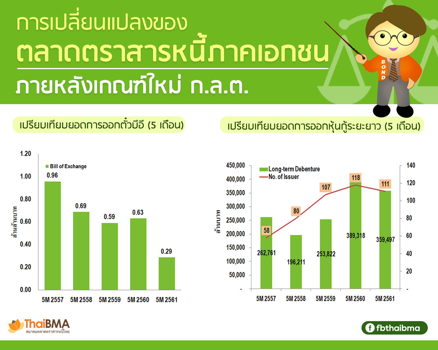 Posted by:ThaiBMA Posted on: Jul. 01, 2018 Share this post with “การเปลี่ยนแปลงของตลาดตราสารหนี้ภาคเอกชนภายหลังเกณฑ์ใหม่ ก.ล.ต.” การผิดนัดชำระหนี้ตั๋วบีอีและหุ้นกู้ของบริษัทบางแห่งที่เกิดขึ้นในปีที่แล้ว แม้จะคิดเป็นมูลค่าค่อนข้างน้อยหากเทียบกับตลาดหุ้นกู้โดยรวม แต่ก็ส่งผลกระทบต่อนักลงทุนและสั่นคลอนความเชื่อมั่นในตลาดตั๋วบีอีอย่างมาก ทำให้หน่วยงานกำกับดูแลต้องทบทวนแก้ไขหลักเกณฑ์การขออนุญาตการเสนอขายตราสารหนี้ในประเด็นหลักๆ ดังนี้ ตั๋วบีอีจะถูกจำกัดให้เสนอขายได้เฉพาะในวงแคบไม่เกิน 10 รายและนักลงทุนสถาบันเท่านั้น กรณีเสนอขายวงแคบไม่เกิน 10 ราย (PP10) ผู้ลงทุนต้องมีความสัมพันธ์กับกิจการ (Related party) เช่น เป็นกรรมการ หรือ ผู้ถือหุ้นรายใหญ่ แต่ถ้าบริษัทอยากจะขายให้บุคคลอื่นที่ไม่ใช่ Related party บุคคลดังกล่าวจะต้องเป็น“นักลงทุนรายใหญ่” (High net worth investors: HNW) และต้องเสนอขายผ่านตัวกลางเท่านั้น เพื่อให้สถาบันการเงินที่เป็นตัวกลางช่วยทำหน้าที่กลั่นกรอง หุ้นกู้ หากเสนอขายให้กับ“นักลงทุนรายใหญ่” (HNW) จะต้องจัดให้มีผู้แทนผู้ถือหุ้นกู้ เพื่อทำหน้าที่ดูแลสิทธิประโยชน์ของผู้ลงทุนและติดตามให้ผู้ออกห้นกู้ปฏิบัติตามเงื่อนไขข้อกำหนดสิทธิต่างๆ หลักเกณฑ์ใหม่ของ ก.ล.ต. นี้มีผลตั้งแต่วันที่ 1 เมษายน 2561 เป็นต้นมา ส่งผลให้ตลาดตั๋วบีอีมีการเปลี่ยนแปลงโดยบริษัทเอกชนที่ต้องการระดมเงินทุนจากนักลงทุนรายใหญ่ (HNW) เกิน 10 รายต้องเปลี่ยนมาออกตราสารหนี้ในรูปแบบของหุ้นกู้จากเดิมที่บริษัทสามารถออกตั๋วบีอีขายตรงให้แก่ HNW จำนวนมากได้แบบง่ายและรวดเร็ว สำหรับนักลงทุน หุ้นกู้มีข้อดีเหนือกว่าตั๋วบีอีในแง่การปกป้องนักลงทุน เพราะหุ้นกู้จะมีข้อกำหนดให้ผู้ออกต้องเปิดเผยข้อมูลที่เป็นสาระสำคัญอันอาจส่งผลกระทบต่อผู้ถือหุ้นกู้ (Material Event) และต้องปฏิบัติตามหน้าที่ของผู้ออกตามข้อกำหนดสิทธิหุ้นกู้ในหนังสือชี้ชวน เช่น การดำรงอัตราส่วนหนี้สินต่อทุน เป็นต้น จากวันที่เกณฑ์ใหม่ ก.ล.ต. มีผลบังคับใช้ พบว่า การออกตั๋วบีอีรอบ 5 เดือน (ม.ค.-พ.ค.) ของปีนี้ลดลงถึง 54% เมื่อเทียบกับช่วงเดียวกันของปีก่อน โดยส่วนใหญ่เป็นการเสนอขายแก่นักลงทุนสถาบัน (II) แต่ยังพบว่าผู้ออกที่มีอันดับเครดิตสูงยังมีการออกตั๋วบีอีขายให้แก่นักลงทุนรายใหญ่ (HNW) แบบวงแคบไม่เกิน 10 ราย (PP10) ได้อยู่ ในขณะเดียวกัน พบว่า ผู้ออกหลายรายที่เคยออกตั๋วบีอีหันมาระดมทุนผ่านการออกหุ้นกู้ระยะยาวมากขึ้น ทำให้ยอดการออกหุ้นกู้รอบ 5 เดือน (ม.ค.-พ.ค.) อยู่ในระดับสูงคือเฉลี่ยเดือนละกว่า 70,000 ล้านบาท ใกล้เคียงกับช่วงเดียวกันของปีก่อน นอกจากนั้นผู้ออ