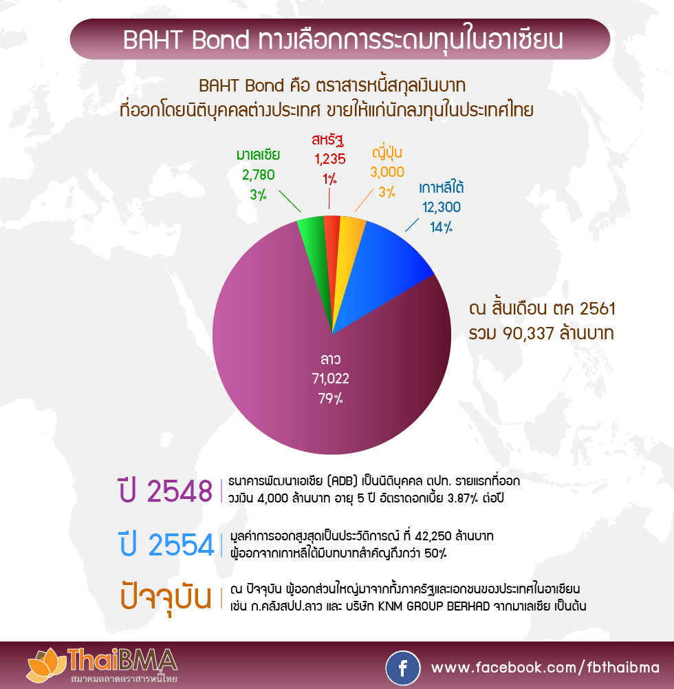 Posted by:ThaiBMA Posted on: Dec 13, 2018 Share this post with BAHT Bond ทางเลือกการระดมทุนในอาเซียน บาทบอนด์ (Baht bond) คือตราสารหนี้สกุลเงินบาทที่ออกโดยนิติบุคคลต่างประเทศขายให้แก่นักลงทุนในประเทศไทยโดยในช่วง 5 ปีที่ผ่านมา มีมูลค่าการออกเฉลี่ยปีละประมาณ 20,000 ล้านบาท ซึ่งถือว่าไม่น้อยทีเดียว ดังนั้นวันนี้เราจะมารู้จักบาทบอนด์กันให้มากขึ้นครับ นิติบุคคลต่างประเทศได้รับอนุญาตให้ระดมทุนผ่านการออกบาทบอนด์ในประเทศไทยเป็นครั้งแรกในปี 2548 โดยในช่วงแรกผู้ออกส่วนใหญ่เป็นองค์กรและสถาบันการเงินระหว่างประเทศ เช่น ADB Citigroup โดยกว่า 80% มาจากประเทศในกลุ่มยุโรปและสหรัฐอเมริกา ต่อมาในช่วงปี 2553-2556 ผู้ออกจากเกาหลีใต้เข้ามามีบทบาทในการออกบาทบอนด์เพิ่มขึ้นอย่างมากโดยส่วนใหญ่จะเป็นสถาบันการเงิน อาทิ Korea EXIM Bank Korea Development Bank และ HANA Bank เป็นต้น ตั้งแต่ปี 2556 เป็นต้นมา สปป. ลาวเป็นประเทศที่เข้ามาระดมทุนผ่านการออกบาทบอนด์ในไทยมากขึ้นอย่างต่อเนื่อง โดยผู้ออกมีทั้งภาครัฐคือกระทรวงการคลัง และภาคเอกชน ได้แก่ บริษัท อีดีแอล-เจนเนอเรชั่น (EDL-GEN) และบริษัทผลิตไฟฟ้าน้ำงึม 2 เป็นต้น เพื่อนำเงินที่ได้ไปใช้ลงทุนโครงสร้างพื้นฐาน โดยเฉพาะการลงทุนในโครงการผลิตไฟฟ้าพลังน้ำจากเขื่อนต่างๆ ซึ่งมีการไฟฟ้าฝ่ายผลิตของประเทศไทยเป็นผู้รับซื้อกระแสไฟฟ้ารายใหญ่ ปัจจุบันยอดคงค้างบาทบอนด์ล่าสุด ณ สิ้นเดือนตุลาคม 2561 อยู่ที่ 90,337 ล้านบาท ประกอบด้วยผู้ออกจากเอเชียเป็นหลัก ได้แก่ 79% จาก สปป.ลาว 14% จากเกาหลีใต้ 3% จากทั้งญี่ปุ่นและมาเลเซีย และประเทศนอกเอเชียอย่างสหรัฐอเมริกาอีก 1% นอกจากนี้มีหลายประเทศในกลุ่มอาเซียน เช่น กัมพูชา เมียนมา ก็ให้ความสนใจในการออกบาทบอนด์เช่นเดียวกัน ทำให้ตลาดบาทบอนด์มีโอกาสขยายตัวสูงขึ้นตามแนวโน้มการเติบโตทางเศรษฐกิจของประเทศเพื่อนบ้านที่ต้องการการลงทุนในโครงสร้างพื้นฐาน ซึ่งท้ายที่สุดแล้วนักลงทุนในประเทศก็จะได้ประโยชน์จากทางเลือกในการลงทุนตราสารหนี้ที่มีมากขึ้น