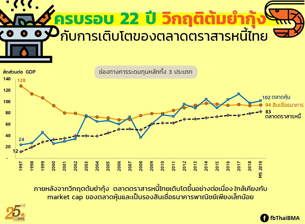 Posted by:ThaiBMA Posted on: Jul. 01, 2019 Share this post with ครบรอบ 22 ปี วิกฤติต้มยำกุ้ง กับการเติบโตของตลาดตราสารหนี้ไทย 22 ปีแล้วนับจากวันที่ประกาศลอยตัวค่าเงินบาทเมื่อ 2 ก.ค. 2540 ที่กลายเป็นจุดเริ่มต้นของ “วิกฤติต้มยำกุ้ง” ซึ่งทำให้ประเทศไทยและต้มยำกุ้งเป็นที่รู้จักไปทั่วโลก สาเหตุหนึ่งของการเกิดวิกฤติเศรษฐกิจในครั้งนั้นมาจากการกู้เงินต่างประเทศจำนวนมากโดยไม่มีการป้องกันความเสี่ยงจากค่าเงินในขณะที่ทางการอนุญาตให้มีการเคลื่อนย้ายเงินทุนอย่างเสรีผ่านกิจการวิเทศธนกิจภายใต้ระบบอัตราแลกเปลี่ยนแบบคงที่ แล้วทำไมจึงมีการกู้เงินจากต่างประเทศจำนวนมหาศาล?...ส่วนหนึ่งก็เพราะดอกเบี้ยต่ำกว่าการกู้ในประเทศ และช่องทางการระดมทุนของเศรษฐกิจไทยยังมีจำกัด ภาคธุรกิจส่วนใหญ่จะระดมทุนผ่านการกู้จากธนาคารและสถาบันการเงิน สัดส่วนของเงินกู้ธนาคารทั้งหมดเทียบกับ GDP สูงถึง 128% ในขณะที่การระดมทุนผ่านตลาดหุ้นมีสัดส่วน 24% ต่อ GDP และผ่านตลาดตราสารหนี้มีเพียง 12% ต่อ GDP เปรียบเสมือนขาเก้าอี้ที่ความยาวต่างกันมาก ขาดความสมดุลจึงพร้อมที่จะล้มได้เสมอ หลังจากเกิดวิกฤต ภาครัฐจึงได้ตระหนักถึงความสำคัญของการพัฒนาตลาดตราสารหนี้เพื่อให้เป็นอีกหนึ่งเครื่องยนต์หลักในการขับเคลื่อนระบบเศรษฐกิจของประเทศ นอกเหนือจากการพึ่งพาเงินกู้จากธนาคาร นับจากวิกฤตในวันนั้น ตลาดตราสารหนี้ไทยเติบโตขึ้นอย่างต่อเนื่อง มีขนาดใหญ่ขึ้นกว่า 25 เท่า ใกล้เคียงกับ market cap ของตลาดหุ้นและเป็นรองสินเชื่อธนาคารพาณิชย์เพียงเล็กน้อย 3 เสาหลักที่เป็นช่องทางการระดมเงินทุนเพื่อขับเคลื่อนเศรษฐกิจมีความสมดุลกันมากขึ้น เศรษฐกิจไทยจึงมีความแข็งแกร่ง และกลายเป็นหนึ่ง ใน Safe haven ในสายตาของนักลงทุนต่างชาติในปัจจุบัน