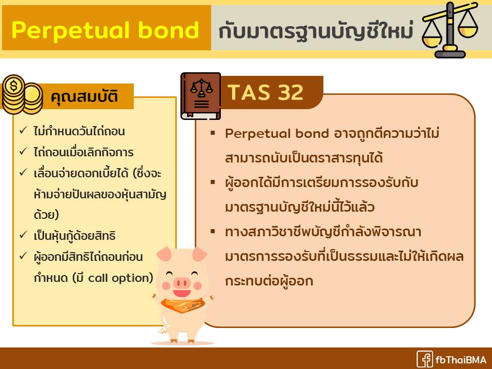Posted by:ThaiBMA Posted on: Nov. 01, 2019 Share this post with Perpetual bond กับมาตรฐานบัญชีใหม่ การออกหุ้นกู้ด้อยสิทธิคล้ายทุนไม่กำหนดอายุ หรือ perpetual bond ในช่วงที่ผ่านมาค่อนข้างคึกคัก และได้รับความสนใจจากนักลงทุน แต่จากการที่จะนำมาตรฐานการบัญชีฉบับที่ 32 เรื่อง การแสดงรายการเครื่องมือทางการเงิน (TAS 32) มาใช้ในปีหน้านี้ ทำให้มีการตีความในประเด็นของการจัดประเภทตราสารว่าเป็นสินทรัพย์ หนี้สิน หรือ ทุน กันใหม่ และอาจทำให้ Perpetual bond ซึ่งเดิมบันทึกบัญชีเป็น “ทุน” ของผู้ออก ถูกจัดเป็น “หนี้สิน” แทน ซึ่งทำให้ผู้ออกและนักลงทุนเกิดความกังวลเพราะจะมีผลให้อัตราส่วนหนี้สินต่อทุนของหลายบริษัทที่ออก Perpetual bond เพิ่มขึ้น จริงๆ แล้วน่ากังวลแบบนั้นไหม TAS 32 ใหม่ระบุว่า ในกรณีที่การชำระคืนเงินต้นเกิดขึ้นจากเหตุการณ์ในอนาคตที่มีความไม่แน่นอน และอยู่นอกเหนือการควบคุมของผู้ออกตราสารนั้นจะต้องบันทึกบัญชีเป็น “หนี้สิน” กิจการจะบันทึกบัญชีเป็น “ทุน” ได้กรณีที่การชำระคืนเงินต้นเกิดจากการชำระบัญชีเพื่อเลิกกิจการของผู้ออกเท่านั้น ในขณะที่ Perpetual bond ที่ออกมาก่อนหน้านี้มีการระบุเงื่อนไขการชำระคืนเงินต้นให้รวมไปถึงกรณีที่ผู้ออกล้มละลาย เข้าสู่แผนฟื้นฟูกิจการ หรือถูกพิทักษ์ทรัพย์ เหตุการณ์เหล่านี้อาจถูกผู้สอบบัญชีมองว่าเป็นเหตุการณ์ที่อยู่นอกเหนือการควบคุม และจะทำให้ผู้ออกหุ้นกู้ประเภทนี้ต้องบันทึกบัญชีเป็น “หนี้สิน” จากเดิมที่บันทึกไว้เป็น “ทุน” แต่จากการติดตามการออก Perpetual bond หลายรายที่กำลังเสนอขายในช่วงนี้ พบว่า ผู้ออกได้มีการเตรียมการรองรับมาตรฐานบัญชีใหม่นี้ไว้แล้วเช่น กำหนดเงื่อนไขชำระคืนเงินต้นให้สอดคล้องกับเงื่อนไขการบันทึกบัญชีเป็น “ทุน” ตามมาตรฐานการบัญชีใหม่ฉบับที่ 32 นี้ ดังนั้น จึงไม่มีประเด็นที่จะทำให้ต้องถูกจัดประเภทใหม่เป็น “หนี้สิน” แต่อย่างใด สำหรับ Perpetual bond ที่มีการออกมาแล้วก่อนหน้านี้ สภาวิชาชีพบัญชีอยู่ระหว่างพิจารณามาตรการผ่อนผันการบังคับใช้ เพื่อให้มีเวลาในการแก้ไขข้อกำหนดสิทธิ หรือ ออกตราสารรุ่นใหม่ที่เป็นไปตามเกณฑ์บัญชีใหม่ ดังนั้น จึงไม่น่าจะเกิดผลกระทบที่ทำให้ ผู้ออก Perpetual bond รายก่อนๆ มีอัตราส่วนหนี้สินต่อทุนเพิ่มขึ้นในทันที อย่างไรก็ดี การลงทุนใน Perpetual bond หรือ หุ้นกู้ไม่มีกำหนดอายุ หรือ หุ้นกู้ชั่วนิรันดร์ ก็ถือว่ามีความเสี่ยงและมีความซับซ้อนมากกว่าหุ้นกู้ทั่วไป ซึ่งนักลงทุนควรศึกษาทำความเข้าใจลักษณะและความเสี่ยงของ Perpetual bond (บทความ “Perpetual bond คึกคักส่งท้ายปี 62”) ก่อนตัดสินใจลงทุน