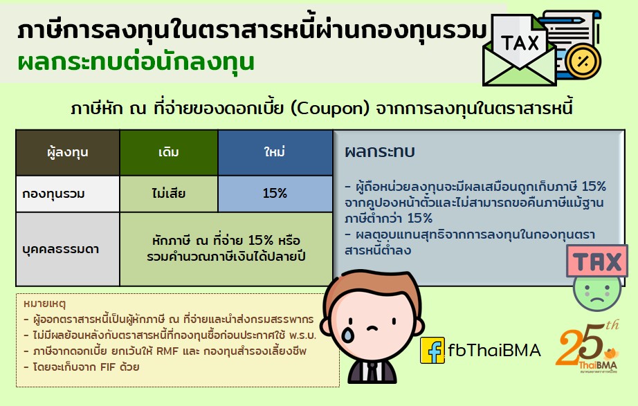 Posted by:ThaiBMA Posted on: Apr. 02, 2019 Share this post with ภาษีการลงทุนในตราสารหนี้ผ่านกองทุนรวม ผลกระทบต่อนักลงทุน ในที่สุด ฝัน (ร้าย) ก็ใกล้จะเป็นจริงนักลงทุนตราสารหนี้กำลังจะถูกจัดเก็บภาษีจากดอกเบี้ยอย่างเท่าเทียมไม่ว่าจะลงทุนตราสารหนี้โดยตรงหรือลงทุนทางอ้อมผ่านกองทุนรวมตราสารหนี้ซึ่งเดิมทีไม่ต้องเสียภาษี โดยพรบ.แก้ไขเพิ่มเติมประมวลรัษฎากรฉบับที่ให้มีการจัดเก็บภาษีดังกล่าวผ่านความเห็นชอบจากสภานิติบัญญัติแห่งชาติแล้ว และจะมีผลใช้บังคับภายใน 90 วันหลังจากประกาศในราชกิจจานุเบกษา ซึ่งคาดว่าน่าจะเป็นช่วงกลางปีนี้ หลักใหญ่ใจความของพรบ. ฉบับนี้และกฎหมายลำดับรองอื่นๆ ที่จะใช้ประกอบกันสรุปเป็นประเด็นได้ดังต่อไปนี้ ● กำหนดให้กองทุนรวมเป็นนิติบุคคลที่ต้องเสียภาษีเงินได้จากดอกเบี้ยหน้าตั๋ว (คูปอง) และส่วนลดจากการลงทุนในตราสารหนี้ ● ผู้ออกตราสารหนี้มีหน้าที่หักภาษี ณ ที่จ่ายร้อยละ 15 ทุกงวดการจ่ายดอกเบี้ย และนำส่งกรมสรรพากรโดยกองทุนรวมไม่ต้องยื่นแบบแสดงรายการภาษีอีก ● ใช้บังคับกับกองทุนรวมทุกกองทุนที่ลงทุนในตราสารหนี้ รวมถึงกองทุนรวมที่ลงทุนตราสารหนี้ในต่างประเทศ (FIF) โดยจะยกเว้นให้สำหรับกองทุนรวมเพื่อการเลี้ยงชีพ (RMF) และกองทุนสำรองเลี้ยงชีพ (PVD) ● ผู้ถือหน่วยลงทุนในกองทุนรวมตราสารหนี้ได้รับยกเว้นภาษีกำไรจากส่วนต่างราคาซื้อขาย (Capital Gain) และภาษีเงินได้จากเงินปันผล ● ตราสารหนี้ที่กองทุนรวมถืออยู่ก่อนที่ พ.ร.บ. นี้จะใช้บังคับจะได้รับยกเว้นภาษีดังกล่าว แล้วการจัดเก็บภาษีเงินได้จากคูปองที่ได้รับจากการลงทุนในตราสารหนี้ผ่านกองทุนรวมนี้จะมีผลกระทบต่อนักลงทุนอย่างไร ● ผู้ถือหน่วยลงทุนไม่ว่าจะเป็นบุคคลธรรมดาหรือนิติบุคคล จะมีผลเสมือนว่าถูกเก็บภาษีในอัตราร้อยละ 15 จากรายได้ดอกเบี้ยตราสารหนี้ ● เนื่องจากเป็นภาษีที่กองทุนรวมมีหน้าที่ต้องเสียภาษี ดังนั้นผู้ถือหน่วยลงทุนไม่ว่าจะเป็นบุคคลธรรมดา หรือนิติบุคคลจึงไม่สามารถทำการขอคืนภาษีได้แม้ว่าฐานภาษีจะต่ำกว่าร้อยละ 15 ก็ตาม ● การลงทุนในกองทุนรวมตราสารหนี้จะมีผลตอบแทนสุทธิต่ำลงจากการที่กองทุนถูกหักภาษีดอกเบี้ยที่ได้รับจากตราสารหนี้ ทั้งนี้ รวมไปถึงกองทุนสำรองเลี้ยงชีพ (PVD) ด้วย หาก PVD นั้นลงทุนผ่านกองทุนรวม อย่างไรก็ตาม จะมีการยกเว้นภาษีให้กองทุนรวมที่เสนอขายเฉพาะสำหรับกองทุนสำรองเลี้ยงชีพซึ่งจะมีการจัดตั้งต่อไป ● เนื่องจากภาษีจะเก็บในอัตราร้อยละ 15 ของดอกเบี้ยหน้าตั๋ว(Coupon)ดังนั้น หากกองทุนลงทุนในตราสารหนี้ที่มีอัตราดอกเบี้ยคูปองสูงกว่าผลตอบแทนที่ได้รั