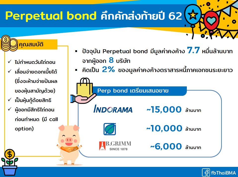 Bond Blogs Posted by:ThaiBMA Posted on: Oct. 8, 2019 Share this post with Perpetual bond คึกคักส่งท้ายปี 62 Perpetual bond หรือหุ้นกู้ชั่วนิรันดร์คึกคักมากในช่วงนี้ด้วยมีการเสนอขายจากผู้ออกกว่า 3 รายในช่วงต้นเดือนที่ผ่านมา ซึ่ง 1 ในนั้นจะเป็นผู้ออกที่ Perpetual bond รุ่นเดิมจะสามารถใช้สิทธิไถ่ถอนก่อนกำหนด (First call date) เป็นรุ่นแรกในสิ้นเดือนตุลาคมนี้ ถามกันมามากว่า Perpetual bond น่าลงทุนไหม อันนี้ก็ต้องแล้วแต่นักลงทุนแต่ละรายจะพิจารณากันเองแต่อย่างน้อยนักลงทุนควรเข้าใจลักษณะและความเสี่ยงของ Perpetual bond ก่อน ดังนี้ ● ไม่มีอายุหรือไม่มีกำหนดวันไถ่ถอน ผู้ลงทุนจะได้ดอกเบี้ยไปเรื่อยๆ ตราบใดที่บริษัทนั้นยังไม่เลิกกิจการไป แต่หากผู้ลงทุนต้องการเงินคืนจะทำได้เพียงการขายออกในตลาดรองเท่านั้น ซึ่งในปัจจุบันต้องยอมรับว่าอาจไม่มีสภาพคล่องมากนัก ราคาขายอาจสูงหรือต่ำกว่าราคาต้นทุนที่ซื้อมา ● เป็นหุ้นกู้ด้อยสิทธิ หากบริษัทที่ออกล้มละลาย นักลงทุนที่ถือหุ้นกู้ประเภทนี้จะมีสิทธิได้รับชำระหนี้คืนเป็นลำดับที่ 3 หลังเจ้าหนี้มีประกัน และเจ้าหนี้สามัญอื่นๆ ซึ่งอาจได้รับชำระหนี้คืนเต็มจำนวนหรือบางส่วนตามจำนวนเงินที่เหลือจากการชำระเจ้าหนี้ลำดับก่อนหน้า ● เลื่อนจ่ายดอกเบี้ยได้ ผู้ออกสามารถเลื่อนการจ่ายดอกเบี้ยออกไปได้โดยไม่มีเงื่อนไขแม้ว่าบริษัทจะมีกำไรก็ตาม โดยจะสะสมดอกเบี้ยจ่ายไปชำระในวันใดก็ได้แต่ในระหว่างนั้นจะห้ามจ่ายปันผลไม่ว่าจะเป็นเงินหรือหุ้นปันผลให้แก่ผู้ถือหุ้น แม้สุดท้ายผู้ออกอาจต้องจ่ายดอกเบี้ยที่ค้างไว้ตามที่กำหนดก็ตาม แต่เงินที่ได้รับวันนี้กับได้รับในอนาคตย่อมมีมูลค่าปัจจุบันไม่เท่ากัน ดังนั้นอัตราผลตอบแทนที่นักลงทุนจะได้รับจริงย่อมลดลงตามระยะเวลาการจ่ายดอกเบี้ยที่ถูกเลื่อนออกไป และที่สำคัญนักลงทุนต้องเตรียมการรองรับไว้ด้วยว่าอาจจะไม่ได้รับกระแสเงินสดจากดอกเบี้ยทุกงวดเหมือนการลงทุนในหุ้นกู้ปกติ อย่างไรก็ตาม เท่าที่ผ่านมายังไม่มีผู้ออกรายใดเลื่อนการจ่ายดอกเบี้ย และผู้ออกไม่น่าจะเลื่อนการจ่ายดอกเบี้ยได้ตามอำเภอใจโดยไม่มีเหตุอันสมควร เพราะจะส่งผลกระทบต่อผู้ถือหุ้นรายใหญ่ของบริษัทจากการงดจ่ายปันผล และมีผลต่อการขายหุ้นกู้ของบริษัทในอนาคต เนื่องจากนักลงทุนจะมองว่าการเลื่อนจ่ายดอกเบี้ยเป็นสัญญาณบอกว่าบริษัทอาจมีปัญหาทางการเงินจนไม่สามารถชำระหนี้คืนได้ ● มี Call option คือ บริษัทผู้ออกมีสิทธิเรียกไถ่ถอนได้ก่อนกำหนดโดยมักจะกำหนดให้เริ่มใช้สิทธิไถ่ถอนได้ตั้งแต่ปีที่ 5 ทั้งนี้ โดยหลักการของบริษัทจัดอันดับความน่าเชื่อถือจะนับตราสารประ