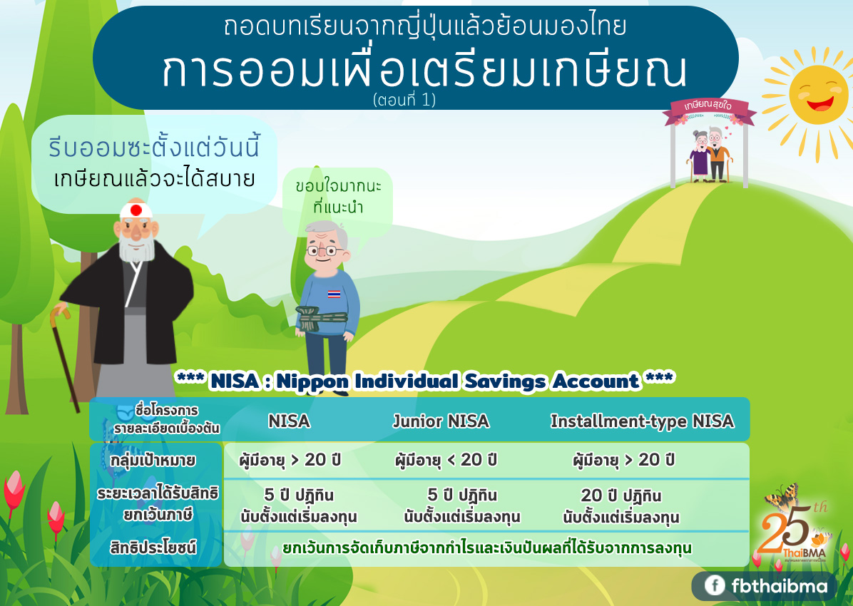 Posted by:ThaiBMA Posted on: Mar. 12, 2019 Share this post with ถอดบทเรียนจากญี่ปุ่นแล้วย้อนมองไทยการออมเพื่อเตรียมเกษียณ (ตอนที่ 1) คำกล่าวที่ว่า การเป็นคนอายุยืนถือว่าเป็นคนมีบุญ อาจไม่เพียงพอเสียแล้ว โดยเฉพาะหากต้องอาศัยอยู่ในประเทศที่มีค่าครองชีพสูง ตัวอย่างที่เห็นได้ชัดคือ ผู้สูงอายุในประเทศญี่ปุ่นเพราะค่าครองชีพที่สูงประกอบกับพฤติกรรมการออมและการลงทุนสไตล์ญี่ปุ่นทำให้ได้รับผลตอบแทนไม่สอดคล้องกับค่าใช้จ่าย โดยทั่วไปคนญี่ปุ่นไม่นิยมลงทุนในสินทรัพย์เสี่ยงเกือบ 60% ของสินทรัพย์ทั้งหมดอยู่ในรูปเงินสดและเงินฝากซึ่งให้ผลตอบแทนต่ำมากทำให้เงินออมเติบโตไม่เพียงพอกับที่ต้องการใช้ รัฐบาลจึงต้องจัดงบประมาณอุดหนุนเงินให้แก่ผู้สูงอายุซึ่งงบประมาณที่ใช้มีแนวโน้มเพิ่มมากขึ้นทุกปีเนื่องจากโครงสร้างประชากรญี่ปุ่นที่เป็นพีระมิดกลับหัวอัตราการเกิดที่ต่ำลงทำให้กลุ่มคนวัยทำงานที่นำส่งภาษีมีจำนวนน้อยลงสวนทางกับกลุ่มคนวัยเกษียณที่มีมากขึ้น ซึ่งในอนาคตผู้สูงอายุก็อาจได้รับเงินอุดหนุนในจำนวนที่ลดลงด้วย เพราะเหตุนี้จึงเป็นที่มาของโครงการ NISA หรือNippon Individual Savings Account เมื่อต้นปี 2557 โดยมีวัตถุประสงค์เพื่อส่งเสริมให้ประชาชนออมเงินผ่านการลงทุนในสินทรัพย์ทุนเพื่อเพิ่มผลตอบแทนในระยะยาว โครงการ NISAจะยกเว้นการจัดเก็บภาษีจากกำไรและเงินปันผลที่ได้รับจากการลงทุนภายใต้เงื่อนไขที่กำหนดโดย ผู้มีสิทธิ์จะต้องเป็นบุคคลธรรมดาที่มีอายุ 20 ปีขึ้นไปวงเงินลงทุนต่อปีไม่เกิน 1.2 ล้านเยนและสูงสุดตลอดทั้งโครงการไม่เกิน 6 ล้านเยน (คิดเป็นเงินไทยราวๆ 1.7 ล้านบาท) โดยระยะเวลาที่ได้รับสิทธิยกเว้นภาษี อยู่ที่ 5 ปีปฎิทินนับตั้งแต่เริ่มลงทุน ขณะที่สินทรัพย์ลงทุนตามเงื่อนไขของโครงการคือ หุ้น กองทุนรวมหุ้น ETFs และREITs เป็นต้น ตัวอย่างเช่นลงทุนผ่านโครงการ NISA ในปี 2561 ด้วยเงินลงทุน 1.2 ล้านเยน ผลตอบแทนต่างๆ ที่ได้รับจากการลงทุนภายในเวลา 5 ปีนับจากวันลงทุนจะได้รับยกเว้นภาษี ภายหลังจาก 5 ปี หากยังถือการลงทุนอยู่ ผลตอบแทนที่ได้รับจะถูกหักภาษีในอัตราปกติที่ 20%อย่างไรก็ตาม หากลงทุน 1.2 ล้านเยนและขายทำกำไรภายในปีนั้นแล้วนำเงินมาลงทุนใหม่ภายในปีเดียวกัน ผลตอบแทนที่ได้รับจากเงินลงทุนก้อนใหม่นี้จะไม่ได้รับการยกเว้นภาษีเพราะเกินจำนวนเงินลงทุนสูงสุดต่อปีแล้ว อย่างไรก็ตามโครงการ NISA มีข้อจำกัดหลายประการ ได้แก่ระยะเวลาการลงทุนค่อนข้างสั้นจำนวนเงินลงทุนที่ต่ำเมื่อเทียบกับค่าครองชีพของประเทศอีกทั้งเงื่อนไขการได้รับยกเว้นภาษียังไม่ค่อยยืดหยุ่นทำให้โครงการไม่เป็นที