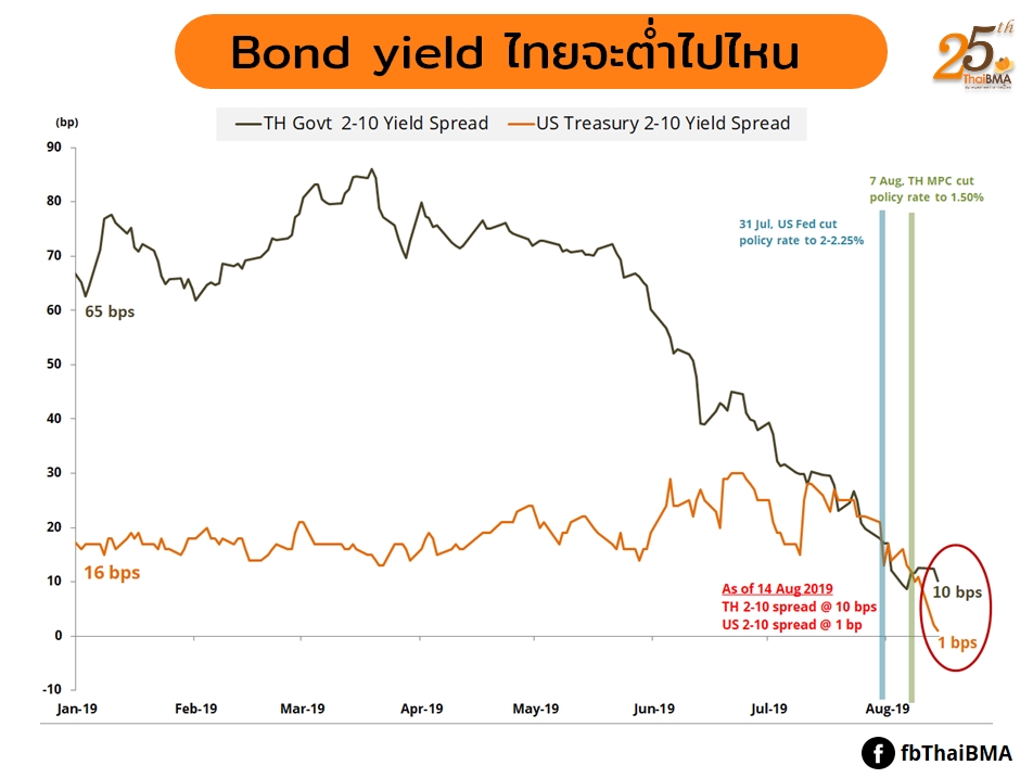 Posted by:ThaiBMA Posted on: Aug. 16, 2019 Share this post with Bond yield ไทยจะต่ำไปไหน การลงทุนในสินทรัพย์อะไรก็ตาม นักลงทุนย่อมต้องการได้รับผลตอบแทน แต่ขณะนี้พันธบัตรรัฐบาลของหลายประเทศให้ผลตอบแทนที่ติดลบ หมายความว่าถ้านักลงทุนถือจนครบกำหนดอายุ นอกจากจะไม่ได้รับผลตอบแทนแล้วในส่วนของเงินต้นก็จะได้รับคืนไม่เต็มจำนวนด้วย แล้วใครจะไปซื้อพันธบัตรรัฐบาลที่มีผลตอบแทนติดลบกัน? Bond yield ติดลบเกิดจากธนาคารกลางลดอัตราดอกเบี้ยนโยบายลงจนเป็นศูนย์หรือติดลบ เพื่อต้องการกระตุ้นเศรษฐกิจในประเทศโดยลดแรงจูงใจไม่ให้ออมเงินแต่ให้นำเงินไปลงทุนจับจ่ายใช้สอยให้เศรษฐกิจมีการขยายตัว แต่สถานการณ์อาจไม่ได้เอื้อให้เกิดการลงทุนและจับจ่ายใช้สอยเท่าใดนัก จึงเกิด Bond Yield ติดลบขึ้น โดยปัจจุบันอัตราผลตอบแทนพันธบัตรรัฐบาลรุ่นอายุ 10 ปีของกว่า 13 ประเทศที่ติดลบ มากที่สุดคือประเทศสวิตเซอร์แลนด์ถึง -1.01% รองลงมาคือเยอรมัน -0.65% ตราสารหนี้ที่มีผลตอบแทนติดลบทั่วโลกมีมูลค่าสูงถึง 15 ล้านล้าน USD (ข้อมูลจาก Bloomberg วันที่ 5 ส.ค. 62) แม้พันธบัตรรัฐบาลจะมีอัตราผลตอบแทนติดลบก็ยังมีนักลงทุนซื้อพันธบัตรรัฐบาลอยู่ด้วยหลายเหตุผล เช่น บางกองทุนตราสารหนี้มีนโยบายการลงทุนแบบ passive ดังนั้นจึงต้องลงทุนให้ได้ผลตอบแทนใกล้เคียงกับ Government bond index ให้มากที่สุด ทำให้ยังต้องซื้อพันธบัตรรัฐบาลแม้ Bond Yield จะติดลบ นักลงทุนบางส่วนคิดว่า Bond Yield ยังติดลบได้อีกจึงเข้าซื้อเพื่อหวังจะได้ Capital gain หรือ นักลงทุนคาดว่า เศรษฐกิจในอนาคตจะหดตัว จึงต้องการลงทุนในสินทรัพย์ที่มีความเสี่ยงต่ำและมีสภาพคล่องสูงอย่างพันธบัตรรัฐบาล เมื่อมีคนได้ประโยชน์ก็ย่อมต้องมีคนเสียประโยชน์จาก Bond Yield ติดลบ โดยเฉพาะกลุ่มกองทุนเพื่อการเกษียน และกลุ่มประกัน หากเข้าซื้อในช่วงนี้ก็จะทำให้ได้รับผลตอบแทนติดลบ และมีความเสี่ยงที่จะขาดทุนจาก Capital loss ได้หาก Bond Yield ปรับตัวสูงขึ้นในอนาคต ส่วน Bond Yield ไทยและสหรัฐฯ แม้ว่าจะยังไม่ติดลบแต่ก็ปรับตัวต่ำลงมามากภายหลังจากที่มีการปรับลดดอกเบี้ยนโยบายลง นับตั้งแต่วันที่ปรับลดดอกเบี้ยนโยบายจนถึงวันที่ 14 ส.ค. 62 Bond yield 10 ปีของสหรัฐฯ ลดลง 43 bps มาอยู่ที่ 1.59% และ Bond yield 10 ปีของไทยลดลง 19 bps มาอยู่ที่ 1.52% ยังห่างไกลจาก Bond yield ติดลบมากอยู่แต่เป็นระดับที่ต่ำที่สุดในรอบกว่า 20 ปีที่ผ่านมา แม้จะยังไม่ติดลบแต่ตลาดก็มีความกังวลอีกอย่างในเรื่องของ Inverted Yield Curve ที่ส่วนต่างระหว่างรุ่น 10 ปีและ 2 ปี (2-10 spread) มีค่าติดลบ โดย 2-10 spread ของสหรัฐฯ ในระหว่างวันที่ 14 ส.ค. มีค่าคิดลบแต่ปิดตลาดที่ 1 bps ส่วนของไทยค่า 2-10 spread ก็ลดต่ำลงมากมีค่าอยู่ที่ 10 bps ซึ่งค่าต่ำสุดจะอยู่ที่ 1 bps ในช่ว