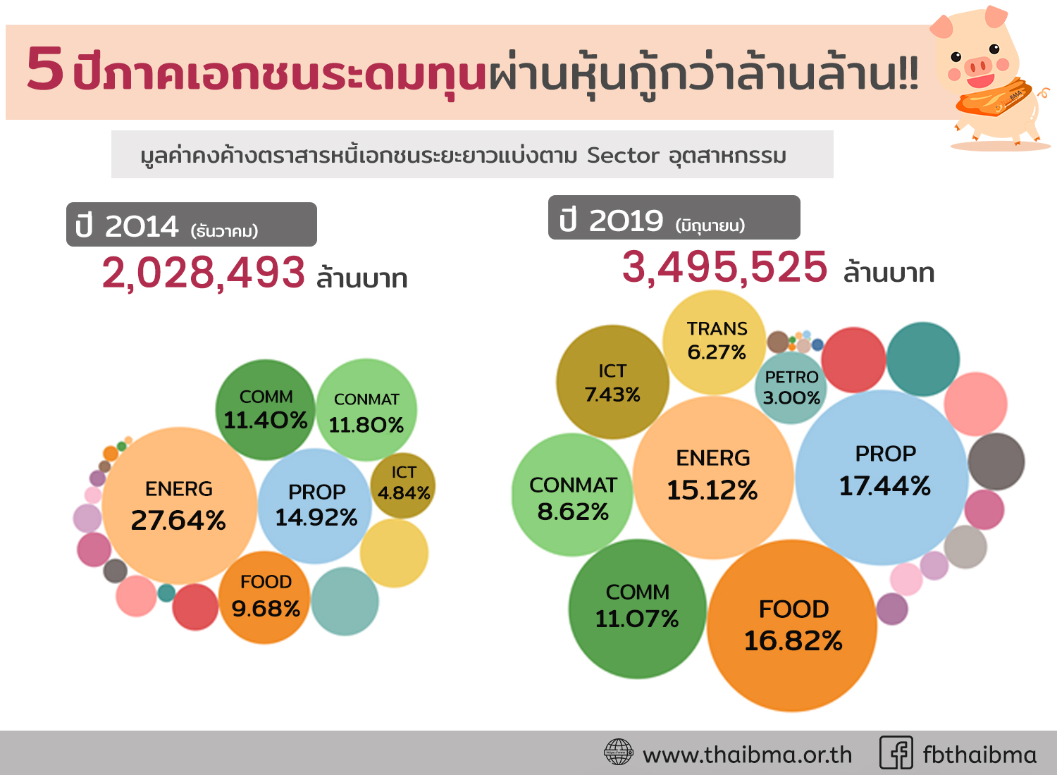 Posted by:ThaiBMA Posted on: Oct. 16, 2019 Share this post with 5 ปี ภาคเอกชนระดมทุนผ่านหุ้นกู้กว่าล้านล้าน!! การออกตราสารหนี้ระยะยาวมักเป็นหนึ่งในทางเลือกในการระดมทุนเมื่อบริษัทต้องการขยายกิจการ รู้หรือไม่ว่าในช่วง 5 ปีที่ผ่านมา ตลาดตราสารหนี้ภาคเอกชนมีขนาดใหญ่ขึ้นซึ่งดูได้จากยอดคงค้างของตราสารหนี้ภาคเอกชนที่สูงขึ้นเกือบ 1.43 ล้านล้านบาท หรือขยายตัวถึง 1.5 เท่า นั่นย่อมแสดงให้เห็นว่าภาคเอกชนของไทยใช้ประโยชน์จากตลาดตราสารหนี้ในการเป็นแหล่งระดมเงินทุนเพิ่มขึ้นอย่างต่อเนื่อง ในปี 2014 หรือ 5 ปีที่แล้วหุ้นกู้ภาคเอกชน* มีมูลค่าคงค้างประมาณ 2 ล้านล้านบาท โดย Energy sector มีสัดส่วนสูงที่สุดถึง 27.64% จากยอดคงค้างทั้งหมด แต่ในปัจจุบัน ณ ครึ่งปีแรกของ 2019 ยอดคงค้างหุ้นกู้เอกชนเพิ่มขึ้นถึง 1.5 เท่า เป็น 3.49 ล้านล้านบาท แต่ Property sector กลายเป็นกลุ่มที่มีสัดส่วนสูงที่สุดแทน โดยมียอดคงค้างคิดเป็นสัดส่วน 17.44% ของยอดคงค้างทั้งหมด เมื่อดูเป็นราย sector พบว่า sector ที่มียอดคงค้างสูงขึ้นมากที่สุด 3 อันดับแรก คือ Food, ICT และ Property sector ซึ่งเติบโตขึ้น 230%, 202% และ 105% ตามลำดับ แล้วเหตุใด อะไรที่ทำให้ sector เหล่านี้มียอดคงค้างของหุ้นกู้สูงขึ้นมากในรอบ 5 ปีที่ผ่านมา? Food sector มียอดคงค้างหุ้นกู้ ณ ครึ่งปีแรกของ 2019 ถึง 454,000 ล้านบาท เพิ่มขึ้น 316,000 ล้านบาท จากปี 2014 ที่มียอดคงค้างเพียง 137,000 ล้านบาท สาเหตุของการเพิ่มหลักๆมาจากบริษัทใน sector นี้มีการระดมทุนจากตลาดตราสารหนี้เพื่อนำไปขยายกิจการโดยซื้อกิจการทั้งในและต่างประเทศ ดีลการซื้อกิจการที่สำคัญๆในช่วง 5 ปีที่ผ่านมาของบริษัทใน sector นี้ เช่น การเข้าซื้อหุ้นในบริษัทผลิตเบียร์ของเวียดนาม การซื้อแฟรนไชส์ร้านอาหาร KFC ในไทย และซื้อหุ้นในบริษัท Spice of Asia ผู้ดำเนินธุรกิจเชนร้านอาหารไทยของ ThaiBev และ การลงทุนในร้านอาหาร Red Lobster ซึ่งเป็นหนึ่งในเชนร้านอาหารทะเลที่ใหญ่ที่สุดในโลกของกลุ่มไทยยูเนี่ยน เป็นต้น ICT sector มียอดคงค้างหุ้นกู้ ณ ครึ่งปีแรกของ 2019 ถึง 208,000 ล้านบาท เพิ่มขึ้น 140,000 ล้านบาท จากปี 2014 ที่มียอดคงค้างเพียง 68,000 ล้านบาท โดยในช่วง 5 ปีที่ผ่านมาถือว่าเป็นยุคเปลี่ยนผ่านจาก 3G สู่ 4G และจะเข้าสู่ 5G ในอนาคตทำให้มีการประมูลคลื่นความถี่โทรคมนาคมหลายครั้งคิดเป็นจำนวนเงินที่รัฐได้จากการประมูลทั้งหมดกว่า 360,000 ล้านบาท นอกจากค่าประมูลคลื่นความถี่แล้วบริษัทที่เป็นผู้ให้บริการเครือข่ายต่างๆ ยังต้องลงทุนในโครงสร้างพื้นฐานและเสาสัญญาณอีกมากจึงมีการระดมทุนบางส่วนจากการออกตราสารหนี้ Property sector มียอดคงค้างหุ้นกู้ณ ครึ่งปีแรกของ 2019 ถึง 436,000 ล้านบาท เพิ่มขึ้น 224,000 ล้านบาท จากปี 2014 ที่มียอดคงค้างเพียง 212,000 ล้านบาท โดย