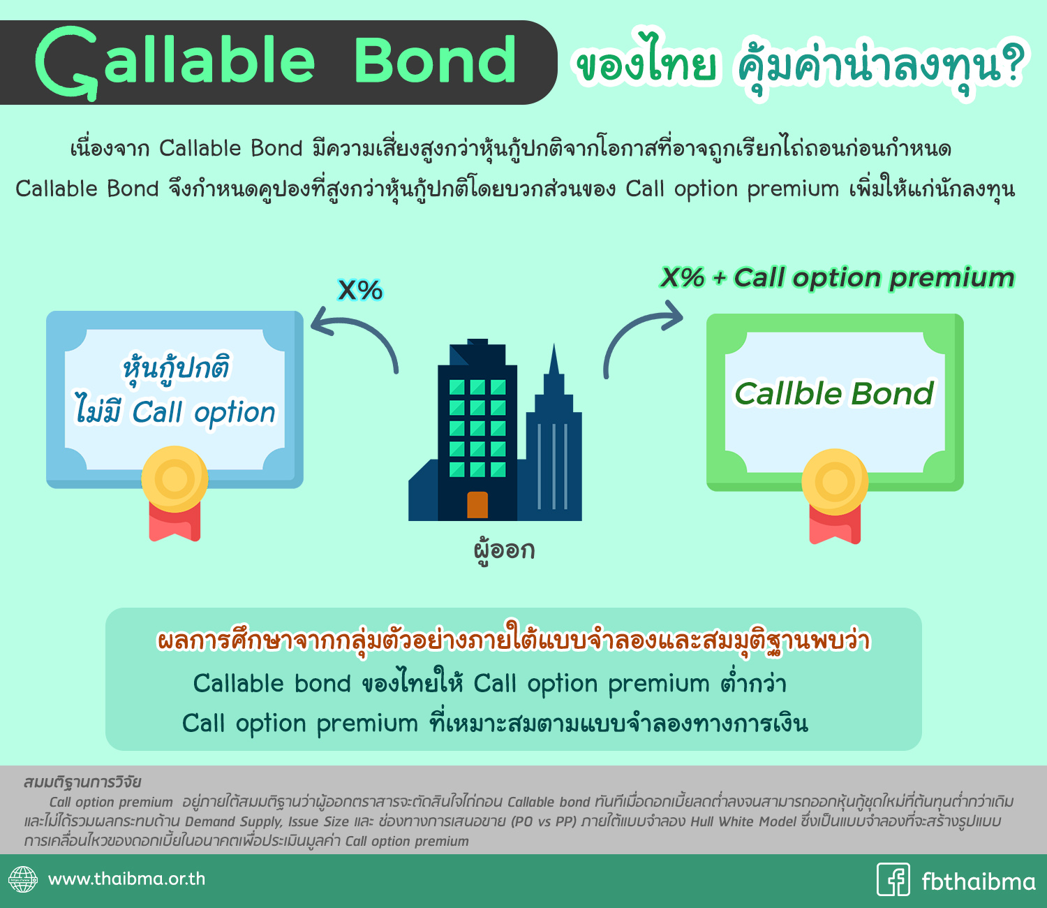 Bond Blogs Posted by:ThaiBMA Posted on: Jun. 18, 2019 Share this post with Callable bonds ของไทย คุ้มค่าน่าลงทุน? Callable bond คือ หุ้นกู้ที่ให้สิทธิผู้ออกในการไถ่ถอน (Call) ก่อนกำหนด ซึ่งในประเทศไทยมีการออกครั้งแรกในปี 2002 และออกเพิ่มขึ้นอย่างต่อเนื่องโดยเฉพาะตั้งแต่ปี 2013 เป็นต้นมา ปริมาณการออก Callable bonds มีความสัมพันธ์กับทิศทางอัตราดอกเบี้ยในตลาด โดยพบว่ามีการออก Callable bonds เพิ่มขึ้นในช่วงที่อัตราดอกเบี้ยนโยบายปรับลดลง ปริมาณการออกลดลงในช่วงที่ดอกเบี้ยนโยบายมีทิศทางสูงขึ้น ซึ่งก็สอดคล้องกับหลักการที่ว่าหากดอกเบี้ยมีแนวโน้มลดลง ผู้ออกย่อมมีแรงจูงใจมากขึ้นที่จะออกตราสารหนี้ในรูปแบบ Callable bond เพื่อจะได้มีสิทธิเรียกไถ่ถอนก่อนกำหนดหากในอนาคตสามารถออกหุ้นกู้รุ่นใหม่ได้ในอัตราดอกเบี้ยต่ำลงนั่นเอง สำหรับนักลงทุน การลงทุนใน Callable bond มีความเสี่ยงมากกว่าหุ้นกู้ปกติที่ไม่มี Call option เพราะมีโอกาสถูกเรียกไถ่ถอนก่อนกำหนด ทำให้นักลงทุนอาจได้รับผลตอบแทนจากการลงทุนใหม่ที่ต่ำกว่าเดิม (Reinvestment risk) ดังนั้น Callable bond จึงควรต้องจ่ายอัตราดอกเบี้ยสูงกว่าหุ้นกู้ปกติ คำถามคือ แล้วผู้ออก Callable bond ได้ชดเชยความเสี่ยงจากการถูกไถ่ถอนก่อนกำหนดให้คุ้มไหม? อัตราดอกเบี้ยหน้าตั๋ว (คูปอง) ของ Callable bond สูงกว่าหุ้นกู้ที่มีคุณลักษณะใกล้เคียงกันแต่ไม่มี Call option ในระดับที่เหมาะสมกับความเสี่ยงที่เพิ่มขึ้นแล้วหรือไม่ Callable bond ของไทยออกมาแล้วทั้งหมด 144 รุ่น มีอายุการออก (Tenor) เฉลี่ยที่ 6 ปี โดยผู้ออกที่มีอันดับเครดิตยิ่งสูงก็จะออก bond ที่มีอายุยาวขึ้น ผู้ออกอันดับเครดิต AAA ออก Callable bond ที่มีอายุเฉลี่ยยาวถึง 15 ปี ในขณะที่ผู้ออก Non-rated มีอายุการออกเฉลี่ยเพียง 2 ปี และจาก Callable bond ทั้งหมดที่ถึงกำหนดที่ผู้ออกสามารถเรียกไถ่ถอน (Call) ได้ มีเพียง 1 ใน 3 ที่ผู้ออกใช้สิทธิ Call น่าสนใจที่ผู้ออกส่วนใหญ่คือ 2 ใน 3 ไม่ได้ใช้สิทธิ Call ทั้งที่อัตราดอกเบี้ยมีแนวโน้มลดลง แล้วทำไมถึงออก Callable bond? อาจเป็นไปได้ว่าผู้ออกมีสภาพคล่องไม่พอที่จะขอไถ่ถอนก่อนกำหนด ดอกเบี้ยไม่ได้ลดลงมากพอ หรืออัตราดอกเบี้ยคูปองที่เพิ่มขึ้นสำหรับการออก Callable bond นั้นไม่ได้แตกต่างมากนักจากหุ้นกู้ที่ไม่มี Call option ซึ่งในแง่ของนักลงทุน ก็เท่ากับว่า Callable bond ให้คูปองที่ต่ำเกินไปเมื่อเทียบกับความเสี่ยง Reinvestment risk ที่เพิ่มขึ้นมา Callable bond ของไทยให้ดอกเบี้ยคูปองต่ำเกินไปจริงหรือ? จากการศึกษาเชิงประจักษ์ในช่วงปี 2002-2018 โดยการเปรียบเทียบ Callable bond กับ หุ้นกู้ปกติที่ไม่มี Call option ของผู้ออกรายเดียวกัน รุ่นอายุใกล้เคียงกัน และเสนอขายในช่วงเวลาไล่เลี่ยกันจำนวน 24 รุ่น พบว่า Callable bond กำหนดดอกเบี้ยคูปองสูงกว่าหุ้นกู้ปกติที่ไม่มี Call option เฉล