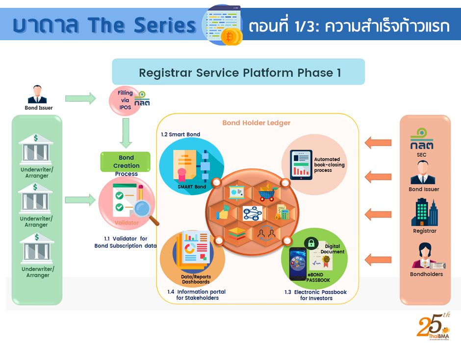 Posted by:ThaiBMA Posted on: Dec. 18, 2019 Share this post with บาดาล The Series ตอนที่ 1/3: ความสำเร็จก้าวแรก เมื่อวันที่ 11 ธันวาคม 2562 ที่ผ่านมา สมาคมตลาดตราสารหนี้ไทย (ThaiBMA) ได้รับความเห็นชอบจากคณะกรรมการ ก.ล.ต. ให้สามารถดำเนินการในฐานะศูนย์รับฝากหลักทรัพย์เพื่อทดสอบการนำระบบ DLT มาใช้กับการออกหุ้นกู้ในตลาดตราสารหนี้ ภายใต้ชื่อ โครงการบาดาล “โครงการบาดาล” หรือ โครงการ DLT Registrar Service Platform เกิดขึ้นเพื่อเป็นโครงสร้างพื้นฐานของระบบงานในตลาดตราสารหนี้ภาคเอกชน โดยการพัฒนาได้เริ่มจากบาดาล Phase 1 ระบบการจัดเก็บข้อมูลผู้ถือครองตราสารหนี้แบบไม่มีศูนย์กลาง ซึ่งประกอบด้วยระบบงานหลัก 4 งาน ได้แก่ 1. ระบบตรวจสอบข้อมูลจองซื้อ (Validator for Bond Subscription data) เพื่อช่วยอำนวยความสะดวกในการตรวจสอบความถูกต้องของข้อมูลการจองซื้อหุ้นกู้ 2. ระบบ Smart Bond ซึ่งจะทำหน้าที่ประมวลผลข้อมูลและเงื่อนไขในข้อกำหนดสิทธิออกมาเป็นสถานะงานต่างๆ ตามหน้าที่ของผู้ร่วมตลาด เช่น ปฏิทินแจ้งเตือนสำหรับวันปิดสมุดทะเบียน และวันจ่ายชำระดอกเบี้ย/เงินต้น เป็นต้น 3. ระบบ eBond Passbook สำหรับนักลงทุนรายย่อยไว้ติดตามข้อมูลการลงทุนของตนเอง โดยสามารถทราบข้อมูลหุ้นกู้ทุกรุ่นที่ตนถือครองแม้จะมีนายทะเบียนที่หลากหลาย พร้อมทั้งข้อมูลข่าวสารเกี่ยวกับหุ้นกู้ กำหนดการวันประชุมผู้ถือหุ้นกู้ วันปิดสมุดทะเบียนและวันจ่ายดอกเบี้ย จำนวนดอกเบี้ยที่จ่าย กำหนดการได้รับคืนเงินต้นจากหุ้นกู้แต่ละรุ่น เป็นต้น 4. ระบบแสดงผลรายงานและวิเคราะห์ข้อมูลผู้ถือครองแยกตามกลุ่มผู้ใช้งาน เพื่อให้ผู้ร่วมตลาดนำไปทำงานได้อย่างมีประสิทธิภาพ บาดาล Phase 1 ได้ถูกนำมาใช้ในการออกหุ้นกู้แบบไร้ใบ (Scripless) ในสภาพแวดล้อมจริงภายใต้โครงการทดสอบและพัฒนานวัตกรรมเพื่อสนับสนุนการให้บริการเกี่ยวกับตลาดทุน (Regulatory Sandbox) ของสำนักงาน ก.ล.ต. ซึ่งเป็นโครงการนำร่องในการนำเทคโนโลยี DLT หรือ Blockchain มาพัฒนาโครงสร้างพื้นฐานของระบบงานในตลาดตราสารหนี้ภาคเอกชนของไทย และน่าจะสามารถใช้เป็นต้นแบบ Master Blueprint for Thai Capital Market เพื่อพัฒนาโครงสร้างพื้นฐานดิจิทัลของตลาดทุนไทยที่สำนักงาน ก.ล.ต. กำลังผลักดัน นอกจากนี้ เรายังจะศึกษาแนวทางเชื่อมโยงบาดาลกับระบบการโอนเงินระหว่างสถาบันการเงินโดยใช้สกุลเงินดิจิทัลหรือโครงการอินทนนท์ของธนาคารแห่งประเทศไทย เพื่อนำไปสู่การชำระราคาและส่งมอบแบบ Real time DVP บาดาล Phase 1 จะเกิดขึ้นไม่ได้หากสมาคมตลาดตราสารหนี้ไทยไม่ได้รับความร่วมมืออย่างดีจากผู้ร่วมตลาดทุกภาคส่วน และหวังว่าจะมีพัฒนาการของบาดาล Phase 2 และ 3 มาอัพเดทให้ได้ฟังกันเร็วๆ นี้ ครั้งหน้าจะมาเล่าถึงที่มาของการพัฒนาโค