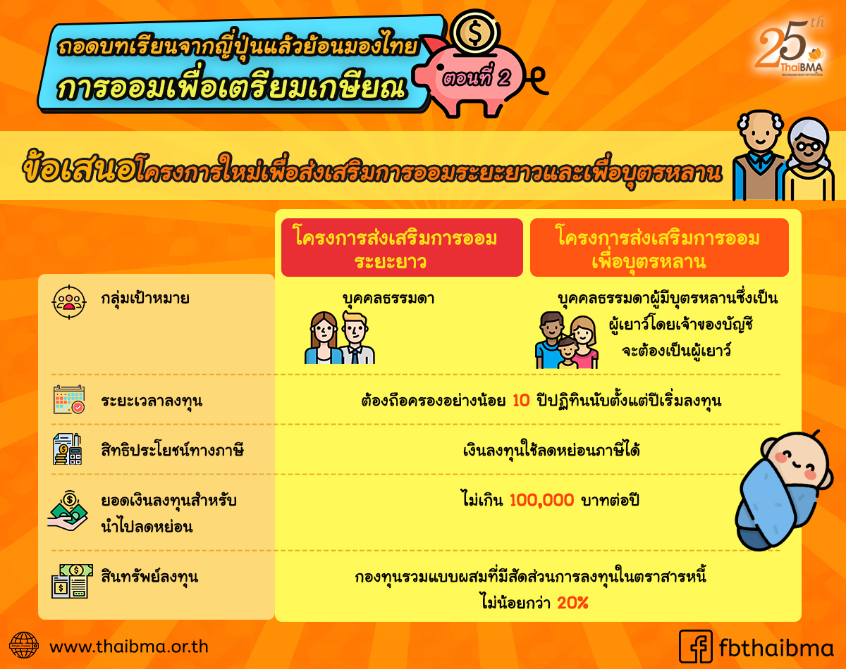 Posted by:ThaiBMA Posted on: Mar. 19, 2019 Share this post with ถอดบทเรียนจากญี่ปุ่นแล้วย้อนมองไทยการออมเพื่อเตรียมเกษียณ (ตอนที่ 2) จากครั้งที่แล้วโครงการ NISA ทั้ง 3 โครงการของรัฐบาลญี่ปุ่นสะท้อนให้เห็นความพยายามในการแก้ไขปัญหาการเพิ่มขึ้นของงบประมาณอุดหนุนผู้สูงอายุในระยะยาว ประเทศไทยเองก็กำลังเผชิญหน้าปัญหาที่คล้ายคลึงกัน คือ จำนวนประชากรผู้สูงอายุสูงขึ้นและเงินออมมีแนวโน้มไม่เพียงพอสำหรับใช้จ่ายยามเกษียณ โดยบทเรียนจากญี่ปุ่นบ่งชี้ว่าการเริ่มต้นออมเริ่มต้นลงทุนในระดับบุคคลเป็นเรื่องเร่งด่วนที่ควรพึงกระทำ เพราะการที่จะหวังพึ่งคนในครอบครัวหรือการอุดหนุนจากรัฐบาล อาจจะไม่เพียงพอและไม่ใช่การแก้ปัญหาที่ยั่งยืน มีการคาดการณ์ว่าประเทศไทยจะก้าวเข้าสู่สังคมผู้สูงอายุโดยสมบูรณ์ภายในปี2564 นอกจากนี้อัตราส่วนการเกื้อหนุนผู้สูงอายุ หรือ จำนวนคนในวัยทำงานต่อการดูแลผู้สูงอายุหนึ่งคน ก็มีแนวโน้มลดลงต่อเนื่อง จากจำนวนคนวัยทำงาน 5.7 คนต่อผู้สูงอายุหนึ่งคนในปี2553 จะลดลงเหลือจำนวนคนวัยทำงานเพียง 2.4 คนต่อผู้สูงอายุหนึ่งคนในปี 2573 ดังนั้นความคิดที่จะหวังพึ่งพาคนในครอบครัวก็อาจจะเป็นเรื่องยากตามโครงสร้างประชากรที่เปลี่ยนไป ด้านสถานการณ์การออมของคนไทยก็อยู่ในระดับที่น่าเป็นห่วง ข้อมูลจากสำนักงานสถิติแห่งชาติระบุว่า ร้อยละ 80 ของผู้มีเงินได้ มีเงินออมไม่พอใช้สำหรับ 6 เดือน นอกจากนี้รูปแบบการถือครองทรัพย์สินของครัวเรือนไทยยังอยู่ในรูปแบบเงินสดและเงินฝากมากถึง 94% ของทรัพย์สินทั้งหมดและมีการลงทุนในผลิตภัณฑ์ทางการเงินต่างๆ เพียง 1% เท่านั้น ดังนั้นการจะเพิ่มพูนเงินออมให้งอกเงยและเพียงพอสำหรับค่าใช้จ่ายในอนาคตช่วงวัยเกษียณจึงเป็นความท้าทายที่สำคัญ จากบทเรียนของประเทศญี่ปุ่น และบริบทของประเทศไทย ชี้ให้เห็นว่าโครงการที่จูงใจให้เกิดการออมเป็นสิ่งที่จำเป็นอย่างไรก็ดี กองทุนรวมหุ้นระยะยาว (LTF) ที่จูงใจให้ลงทุนผ่านการให้สิทธิลดหย่อนภาษีกำลังจะหมดลงในปีนี้ ในขณะที่กองทุนรวมเพื่อการเลี้ยงชีพ (RMF) ไม่ได้รับความนิยมมากนักด้วยเงื่อนไขที่ค่อนข้างจะเข้มงวดโดยเฉพาะกับผู้ที่เพิ่งเริ่มทำงาน ดังนั้นเพื่อส่งเสริมให้เกิดการออมระยะยาวตั้งแต่ช่วงเริ่มต้นชีวิตการทำงานจึงควรมีโครงการส่งเสริมการออมระยะยาวทดแทนกองทุน LTF ที่กำลังจะหมดลง เพื่อรองรับการเข้าสู่สังคมผู้สูงอายุ ดังตัวอย่างของประเทศญี่ปุ่น โครงการส่งเสริมการออมระยะยาวรูปแบบใหม่นี้ อาจให้สิทธิในการลดหย่อนภาษีในลักษณะเดียวกับ LTF แต่กำหนดช่วงเวลาการลงทุนให้นานขึ้น 