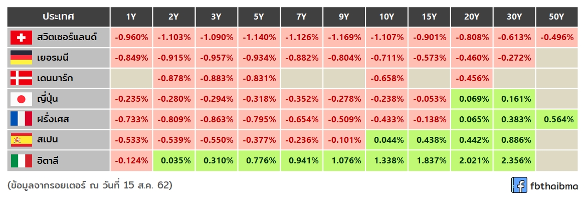 Posted by:ThaiBMA Posted on: Aug. 20, 2019 Share this post with Bond Yield ติดลบกินวงกว้างแค่ไหน ท่ามกลางข่าวสารมากมายเกี่ยวกับอัตราผลตอบแทนพันธบัตรรัฐบาล (Bond Yield) ทั่วโลกที่มีค่าติดลบ เสมือนเป็นกลุ่มเมฆฝนที่ตกกระจายไปทั่ว ถ้าลองนับจำนวนประเทศที่มี Bond Yield Negative ในปัจจุบัน จะพบว่านับนิ้วมือไม่พอแล้ว แถมจำนวนดังกล่าวก็มีแนวโน้มที่จะเพิ่มมากขึ้นด้วย อย่างไรก็ตามในบทความนี้ ประเด็นไม่ใช่จำนวนประเทศ แต่จะมาดูกันว่าเมฆฝนนี้ปกคลุมกินขอบเขตมากน้อยขนาดไหนในกลุ่มประเทศดังกล่าว หรือมี Bond กี่รุ่นอายุแล้วที่ Yield กลายเป็นติดลบ?? จากการศึกษาพบว่า Bond Yield ติดลบ กระจุกตัวอยู่ในกลุ่มประเทศยุโรปเนื่องจากมีความเชื่อมโยงกันค่อนข้างมากผ่านบริบทสหภาพยุโรป (อียู) และจะยิ่งแน่นแฟ้นขึ้นไปอีก หากประเทศนั้นตกลงร่วมใช้ระบบการเงินหรือธนาคารกลางแห่งเดียวกัน ซึ่งก็คือธนาคารกลางยุโรป (อีซีบี) อนึ่ง สำหรับนโยบายการคลังแต่ละประเทศจะมีเสรีในการดำเนินนโยบาย เพียงแต่ต้องปฏิบัติภายใต้กรอบที่ทางอียูกำหนด จึงส่งผลให้รุ่นอายุของ Bond ที่มีในแต่ละประเทศสั้นยาวไม่เท่ากัน ทั้งนี้ ประเทศแรกที่ Bond Yield ติดลบ คือ สวิตเซอร์แลนด์ รุ่นอายุ 10 ปี เมื่อ ม.ค. 2015 และนับตั้งแต่นั้นมาจนถึงปัจจุบัน ก็ได้ขยายวงจนส่งผลให้ Bond Yield ของ สวิตเซอร์แลนด์ ตลอดทุกช่วงอายุถึง 50 ปีกลายเป็นติดลบ ด้านประเทศที่มีขนาดเศรษฐกิจใหญ่ที่สุดในยุโรปอย่างเยอรมนี ก็พบว่า Bond Yield ติดลบตลอดทุกช่วงอายุจนถึง 30 ปี ส่วนกลุ่มประเทศที่มีขนาดเศรษฐกิจลดต่ำตามลงมาอย่างฝรั่งเศส อิตาลี และสเปน ก็มี Bond Yield ติดลบจนถึงช่วงอายุที่ 15 ปี 1 ปี และ 9 ปี ตามลำดับ อีกหนึ่งประเทศอย่างเดนมาร์ก ก็พบ Bond Yield ติดลบเช่นกัน โดยติดลบยาวจนถึงอายุ 20 ปี แต่จุดหนึ่งที่น่าสนใจ คือ เมื่อวันที่ 13 ส.ค. ที่ผ่านมา ธนาคารพาณิชย์แห่งหนึ่งในเดนมาร์ก ได้ส่งผ่านกระแสดอกเบี้ยติดลบมายังสินเชื่อบ้าน ส่งผลให้เกิดดอกเบี้ยกู้ยืมสินเชื่อบ้านติดลบเป็นครั้งแรกของโลก ทั้งนี้ ในทางทฤษฎีก็คือผู้กู้ยืมจะจ่ายเงินคืนน้อยกว่าเงินที่ยืมไปจากธนาคาร แต่อย่างไรก็ตามในทางปฏิบัติเมื่อรวมค่าธรรมเนียมต่างๆ แล้ว ทางผู้กู้ยืมก็มีแนวโน้มที่ยังต้องจ่ายเงินคืนมากกว่าที่กู้ยืมไปอยู่ดี เพียงแต่อาจเป็นมูลค่าที่ไม่สูงนัก นอกเหนือจากยุโรปแล้ว ก็มีประเทศจากเอเชียเพียงหนึ่งเดียวซึ่งก็คือ ญี่ปุ่น ที่มี Bond Yield ติดลบและติดลบจนถึงอายุ 15 ปี โดยสรุปจะเห็นได้ว่ากลุ่มเมฆฝน Bond Yield Negative ได้ปกคลุมไปหลายประเทศแล้ว ส่วนประเด็นที่มาที่ไปของการเกิด Bond Yield ติดลบ รวมถึงมีความเชื่อมโยงกับดอกเบี้ยนโยบายของธนาคารกลางอย่างไร