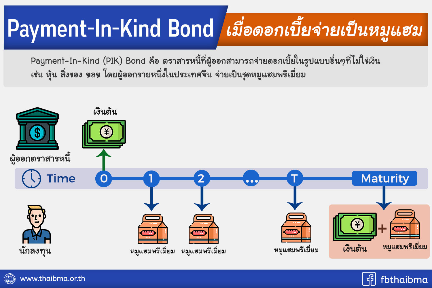 Posted by:ThaiBMA Posted on: May 22, 2019 Share this post with Payment-In-Kind Bond เมื่อดอกเบี้ยจ่ายเป็นหมูแฮม อ่านไม่ผิดครับ นักลงทุนได้รับแจกหมูแฮมแทนการจ่ายดอกเบี้ย โดยปกตินักลงทุนตราสารหนี้จะได้รับการจ่ายดอกเบี้ยในรูปของตัวเงิน แต่เมื่อเร็วๆ นี้ ผู้ออกตราสารหนี้รายหนึ่งในประเทศจีนได้ทำการจ่ายดอกเบี้ยเป็นหมูแฮมแทนการจ่ายเงิน ซื้อ PIK สักหน่วยไหมครับจะได้มีหมูแฮมไว้กินตอนเช้า? การจ่ายดอกเบี้ยในรูปแบบอื่นที่ไม่ใช่ตัวเงินเรียกว่า Payment-In-Kind (PIK) หรือการจ่ายผลตอบแทนที่ไม่อยู่ในรูปตัวเงินแต่จ่ายเป็นสิ่งของ บริการหรือหลักทรัพย์แทน สำหรับนักลงทุนในประเทศไทยอาจไม่ค่อยคุ้นหูนัก แต่ในต่างประเทศ PIK ถือเป็นเครื่องมือทางการเงินหนึ่งที่ผู้ออกตราสารหนี้เลือกใช้ วันนี้เรามาทำความรู้จัก PIK กัน อย่าเขวเป็น BNK!! นะครับ หลักการพื้นฐานของ PIK คือ กลับไปใช้ระบบ Barter System นำสิ่งของมาแลกเปลี่ยนกันแทนการใช้เงิน PIK Bond ตัวแรกเกิดขึ้นในช่วงทศวรรษ 1980 โดยบริษัท Texas International, Inc. (ภายหลังเปลี่ยนชื่อเป็น The Phoenix Resource Companies Inc.) ที่ดำเนินธุรกิจด้านพลังงานของสหรัฐอเมริกา ต้องการก้าวขึ้นเป็นผู้นำในอุตสาหกรรม ดังนั้นเงินทุนจึงถูกนำไปใช้เพื่อขยายธุรกิจ การออก PIK Bond จึงช่วยให้บริษัทสามารถระดมทุนและแปลงภาระการจ่ายดอกเบี้ยจากเงินสดไปเป็นหุ้นสามัญแทน คุณสมบัติของ PIK Bond จะเป็นตราสารหนี้ที่ไม่มีหลักประกัน (Unsecured) โดยมี Call option ที่ให้สิทธิผู้ออกสามารถเรียกไถ่ถอนได้ก่อนครบกำหนด ส่วนใหญ่มีอายุมากกว่า 5 ปี เพราะในช่วงเริ่มต้นกิจการเงินทุนหมุนเวียนอาจต้องนำไปใช้ในการลงทุนมากกว่าการจ่ายคืนให้เจ้าหนี้ จากความเสี่ยงที่นักลงทุนจะได้รับดอกเบี้ยจ่ายในรูปแบบอื่นที่ไม่ใช่ตัวเงิน ทำให้ตราสารหนี้ PIK ถูกมองว่าด้อยสิทธิกว่าตราสารหนี้ทั่วไป ส่งผลให้ PIK Bond ต้องให้อัตราผลตอบแทนที่สูงกว่า รวมไปถึงมูลค่าของดอกเบี้ยในรูปแบบ PIK จะต้องมากกว่าการจ่ายดอกเบี้ยในรูปแบบของเงินสดด้วย เพื่อเป็นการดึงดูดและชดเชยให้แก่นักลงทุน สำหรับลักษณะการจ่ายดอกเบี้ย PIK มี 3 รูปแบบ ดังนี้ 1) True PIK คือ มีการระบุชัดเจนตั้งแต่แรกว่าการจ่ายดอกเบี้ยในรูปแบบ PIK ในช่วงเวลาใดบ้าง เช่น ช่วง 2 ปีแรกจะจ่ายดอกเบี้ยในรูปแบบของ PIK และหลังจากนั้นจนครบกำหนดอายุจะจ่ายดอกเบี้ยในรูปแบบของเงินสด 2) Pay if you can คือ การจ่ายดอกเบี้ยในรูปแบบ PIK ภายใต้เงื่อนไขที่กำหนดไว้ เช่น หากสัดส่วนการถือครองเงินสดอยู่สูงกว่าเกณฑ์ การจ่ายดอกเบี้ยจะต้องอยู่ในรูปแบบของเงินสด แต่ในทางตรงกันข้ามหากอยู่ต่ำกว่าเกณฑ์ จะจ่ายดอกเบี้ยในรูปของ PIK แทน 3) Pay if you want หรือ PIK Toggle คือ การที่ผู้ออกตราสารหนี้สาม