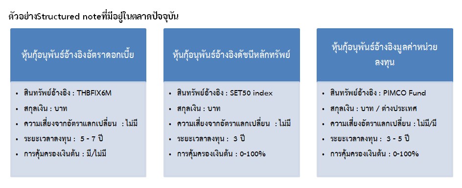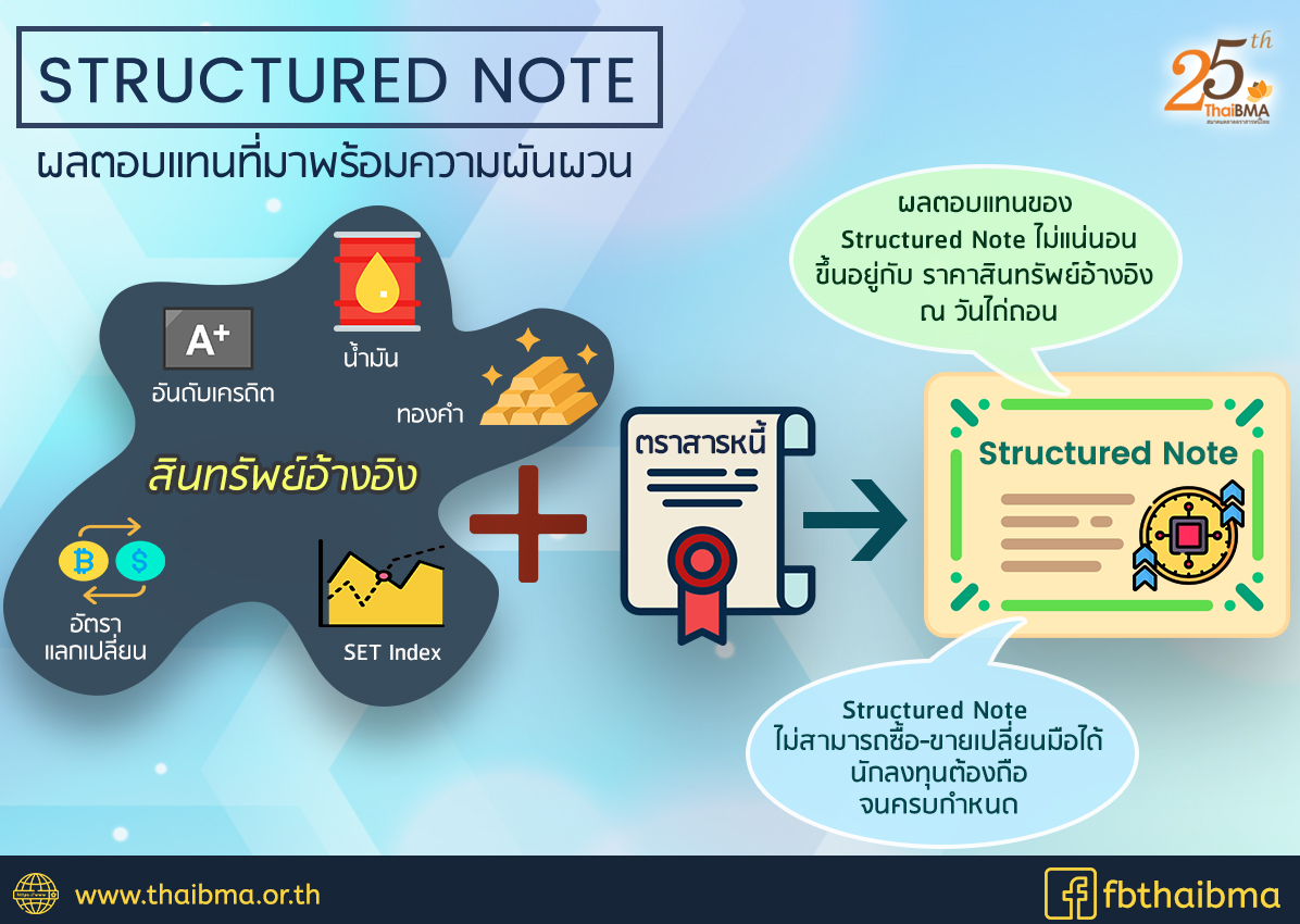 Bond Blogs Posted by:ThaiBMA Posted on: Apr. 23, 2019 Share this post with Structured note ผลตอบแทนที่มาพร้อมความผันผวน อัตราดอกเบี้ยที่อยู่ในระดับต่ำเป็นเวลานานทำให้นักลงทุนแสวงหาผลิตภัณฑ์ทางการเงินใหม่ๆ มาช่วยเพิ่มพูนผลตอบแทน ผลิตภัณฑ์หนึ่งซึ่งเป็นที่จับตามองคือหุ้นกู้อนุพันธ์(Structured note) เพราะให้ผลตอบแทนสูงกว่าเงินฝากและตราสารหนี้ทั่วไปStructured noteมีกลไกอย่างไร ทำไมจึงให้ผลตอบแทนที่ดีกว่า รวมถึงมีความเสี่ยงมากน้อยแค่ไหน มาพิจารณาก่อนตัดสินใจลงทุนกันครับ หุ้นกู้อนุพันธ์หรือ Structured note เป็นผลิตภัณฑ์ทางการเงินที่รวมคุณสมบัติของหุ้นกู้และตราสารอนุพันธ์เข้าไว้ด้วยกันกล่าวคือ เป็นหุ้นกู้ประเภทหนึ่งที่จ่ายผลตอบแทนอ้างอิงกับตัวแปรที่กำหนดเช่นราคาหุ้นรวมถึงดัชนีหุ้น ราคาสินค้าโภคภัณฑ์อัตราแลกเปลี่ยนเงินตราต่างประเทศ อัตราดอกเบี้ยประเภทต่างๆ รวมถึงอันดับความน่าเชื่อถือองค์กร เป็นต้นตัวอย่างของหุ้นกู้อนุพันธ์ที่อ้างอิงกับดัชนีหุ้น เช่น หากภายในสิ้นปี SET index เพิ่มขึ้นถึงระดับ 1,800 จุด นักลงทุนจะได้รับผลตอบแทน 5% แต่หาก SET index ขึ้นไปเพียง 1,700 จุด ณ สิ้นปี นักลงทุนจะได้รับคืนเฉพาะเงินต้นเท่านั้น หรือ อาจได้รับคืนเพียงบางส่วนก็ได้ขึ้นกับเงื่อนไขที่ผู้ออกกำหนดไว้ ซึ่งแปลว่านักลงทุนมีโอกาสขาดทุนจากการลงทุนถ้าหากดัชนี SET50 ไม่ปรับสูงขึ้นเท่าที่คาด หุ้นกู้อนุพันธ์บางรุ่นมีการอ้างอิงกับสินทรัพย์ที่ซับซ้อนมากขึ้น เช่น หุ้นกู้อนุพันธ์ที่อ้างอิงกับหน่วยลงทุนในต่างประเทศ ผลตอบแทนที่ได้ นอกจากอ้างอิงกับมูลค่าหน่วยลงทุนแล้ว ปัจจัยด้านอัตราแลกเปลี่ยนก็ส่งผลเช่นเดียวกัน เช่น ถ้ามูลค่าหน่วยลงทุนเพิ่มขึ้นถึง 13.50 ยูโร ถ้าอัตราแลกเปลี่ยนอยู่ที่ 34.00 36.00 และ 38.00 ยูโรต่อบาท นักลงทุนจะได้รับผลตอบแทน 4.15% 5.30% และ 6.50%ตามลำดับ ซึ่งแปลว่ามูลค่าหน่วยลงทุนเพิ่มขึ้นจนถึงที่กำหนดแล้วแต่ยังมีความเสี่ยงจากอัตรแลกเปลี่ยน กรณีที่ Structured noteไม่ประกันเงินต้นนักลงทุนก็โอกาศขาดทุนจากการลงทุนได้ ทั้งนี้ Structured noteในตลาดมีหลากหลายรูปแบบขึ้นอยู่กับผู้ออกที่ส่วนใหญ่จะเป็นธนาคารพาณิชย์ว่าจะอ้างอิงกับสินทรัพย์ประเภทใด รวมถึงกำหนดเงื่อนไขพิเศษอะไร ซึ่งอาจเหมาะกับผู้ลงทุนที่มีความเข้าใจและมุมมองเกี่ยวกับสินทรัพย์ที่นำมาอ้างอิง และต้องการโอกาสที่จะได้รับผลตอบแทนที่สูงกว่าเงินฝากและตราสารหนี้ทั่วไป ในขณะที่ยังคงต้องการจำกัดความเสี่ยงด้วยการคุ้มครองเงินต้นของการลงทุนไว้ด้วย (ในกรณีที่มีการคุ้มครองเงินต้น 100%)แต่ต้องเข้าใจและตระหนักถึงความเสี่ยงด้วยเช่นกัน ตัวอย่างStructured noteที่มีอยู่ในตลา