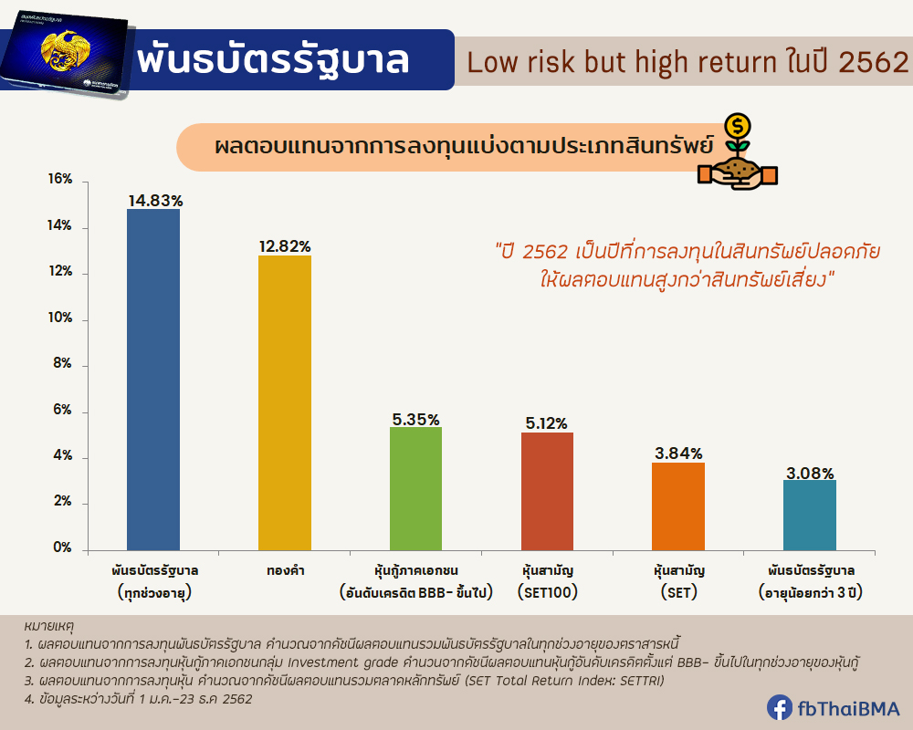 Posted by:ThaiBMA Posted on: Dec. 27, 2019 Share this post with พันธบัตรรัฐบาล Low risk but high return ในปี 2562 สิ้นปีเป็นช่วงเวลาแห่งการเฉลิมฉลอง และการประเมินผลงานประจำปีของหลายบริษัท การลงทุนก็เช่นกัน สินทรัพย์ทางการเงินของไทยแต่ละประเภทมีอัตราผลตอบแทนในปีนี้เป็นอย่างไร? สินทรัพย์ใดให้ผลตอบแทนสูงสุด เราลองมาเปรียบเทียบกัน เริ่มจากกลุ่มสินทรัพย์ปลอดภัย (Safe haven) เป็นสินทรัพย์ที่เสมือนหลุมหลบภัยให้แก่นักลงทุนในช่วงที่ตลาดการเงินมีความผันผวนสูง สินทรัพย์ที่มักจัดอยู่ในกลุ่มนี้ ได้แก่ พันธบัตรรัฐบาล หุ้นกู้เครดิตดี และทองคำ ถ้านับตั้งแต่ต้นปีจนถึงวันที่ 23 ธันวาคม 2562 การลงทุนในพันธบัตรรัฐบาลให้ผลตอบแทนสูงถึง 14.83% (คำนวณจากดัชนีผลตอบแทนรวมพันธบัตรรัฐบาล ทุกช่วงอายุ) เพราะในปีนี้บอนด์ยิลด์ปรับลดลงค่อนข้างมากโดยเฉพาะรุ่นอายุยาวๆ มีผลให้ราคาพันธบัตรเพิ่มขึ้นเนื่องจากราคาตราสารหนี้จะปรับตัวในทิศทางตรงข้ามกันบอนด์ยิลด์ อย่างไรก็ตาม กองทุนรวมตราสารหนี้ส่วนใหญ่ในประเทศไทยมักจะลงทุนในตราสารหนี้ระยะสั้นจึงอาจได้รับประโยชน์จากการปรับลงของบอนด์ยิลด์ไม่มากนักทำให้ผลตอบแทนของกองทุนรวมตราสารหนี้เฉลี่ยอยู่ที่ราว 3.08% ส่วนหุ้นกู้ภาคเอกชนกลุ่ม Investment grade (คำนวนจากดัชนีผลตอบแทนหุ้นกู้อันดับเครดิตตั้งแต่ BBB- ขึ้นไป ทุกช่วงอายุ) ให้ผลตอบแทน 5.35% และทองคำให้ผลตอบแทน 12.82% ข้ามมาที่กลุ่มสินทรัพย์เสี่ยง (Risky asset) การลงทุนในหุ้นสามัญในปีนี้มีความผันผวนมาก โดยครึ่งปีแรก SET Index ปรับตัวเพิ่มขึ้นตลอดจนทำสถิติสูงสุดของปีที่ 1,740.49 จุด ในวันที่ 1 กรกฏาคม 2562 (+178 จุดจากสิ้นปี 2561) แต่หลังจากนั้นเหมือนหนังคนละม้วน SET Index ปรับตัวลดลงอย่างต่อเนื่อง ณ วันที่ 23 ธันวาคม 62 SET Index ปรับตัวเพิ่มขึ้นจากสิ้นปีก่อนเพียง 10 จุด ทำให้ผลตอบแทนจากการลงทุนในหุ้นตั้งแต่ต้นปีจนถึงวันที่ 23 ธันวาคม 2562 อยู่ที่ 3.84% (คำนวณจากดัชนีผลตอบแทนรวม : SET Total Return Index: SETTRI) และถ้าดูเฉพาะกลุ่ม SET100 จะให้ผลตอบแทนที่ 5.12% ปี 2562 ที่กำลังจะผ่านไปนี้ จึงเป็นปีที่การลงทุนในกลุ่มสินทรัพย์ปลอดภัยอย่างพันธบัตรรัฐบาลให้ผลตอบแทนสูงกว่าการลงทุนในหุ้นที่เป็นสินทรัพย์เสี่ยง อย่างไรก็ตาม หากนักลงทุนมีการกระจายการลงทุนในสินทรัพย์ต่างๆ อย่างเหมาะสมตามความเสี่ยงที่รับได้ ไม่ว่าปีหน้าอัตราดอกเบี้ยจะต่ำลงไปกว่านี้ หรือ ปรับตัวเพิ่มขึ้น พอร์ตการลงทุนของเราก็จะยังสามารถสร้างผลตอบแทนได้อย่างสม่ำเสมอ