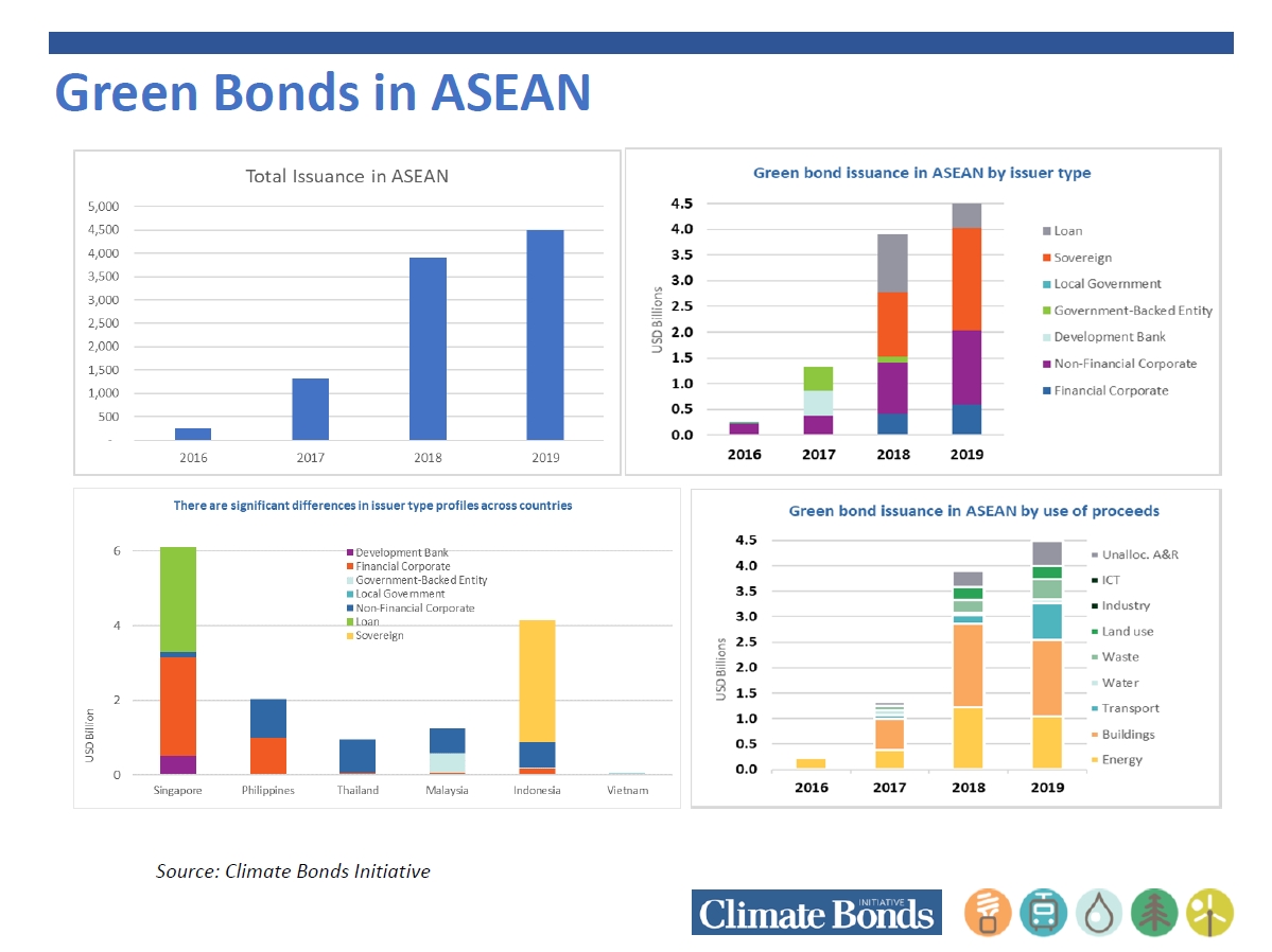 Posted by:ThaiBMA Posted on: Feb. 18, 2020 Share this post with Green bond ในอาเซียน ปัญหาโลกร้อนและมลภาวะ ทำให้เกิดการตื่นตัวถึงการอนุรักษ์สิ่งแวดล้อม และทำให้การลงทุนและระดมทุนในโครงการเพื่อการอนุรักษ์สิ่งแวดล้อมผ่านตราสารหนี้สีเขียว หรือ green bond เติบโตขึ้นอย่างมากทั่วโลก แล้วประเทศในกลุ่มอาเซียนได้ก้าวทันกระแสการเติบโตของตลาด green bond หรือไม่ และหน่วยงานที่เกี่ยวข้องมีมาตรการสนับสนุนอย่างไรบ้าง ประเทศในกลุ่มอาเซียนเริ่มมีการออก green bond ในช่วงไม่กี่ปีที่ผ่านมา อินโดนีเซียถือเป็นประเทศที่มีมูลค่ารวมของการออก green bond สูงที่สุดในกลุ่มอาเซียน (ไม่นับสิงคโปร์) เพราะมีรัฐบาลเป็นผู้นำร่องในการออกตราสารหนี้อิสลามสีเขียว หรือ Green sukuk มูลค่ารวมสูงถึง 1.25 พันล้านดอลล่าร์สหรัฐ เพื่อระดมทุนไปใช้ลงทุนในโครงการอนุรักษ์พลังงานต่างๆ อาทิ พลังงานทดแทน การบริหารจัดการขยะ การคมนาคมสะอาด เป็นต้น และตามมาด้วยการออก Green bond จากผู้ออกรัฐวิสาหกิจ คือ PTSMI ซึ่งระดมทุนในสกุลรูปีอินโดนีเซียมูลค่ารวม IDR 3 ล้านล้านในปีที่ผ่านมาเพื่อนำไปปล่อยกู้ให้โครงการอนุรักษ์พลังงาน ฟิลิปปินส์ ถือเป็นประเทศแรกในกลุ่มอาเซียนที่มีการออก green bond ภายใต้มาตรฐาน ASEAN green bond standard ซึ่งส่วนใหญ่เป็นการออกจากภาคการเงิน ในปี 2019 ธนาคารพาณิชย์รายใหญ่ของฟิลิปปินส์คือ Bank of Philippines Islands (BPI) ออก green bond ในตลาดยุโรปเป็นสกุลสวิสฟรังค์อายุ 2 ปี มูลค่า CHF 100 ล้านจ่ายดอกเบี้ยในอัตราติดลบ -0.02% เป็นครั้งแรก ทั้งนี้ ฟิลิปปินส์มีการออก green bond หลายรุ่นตั้งแต่ปี 2016 จากกลุ่มธุรกิจพลังงานทางเลือก สำหรับสิงคโปร์ การออก green bond ส่วนใหญ่จะมาจากกลุ่มธนาคาร เช่น ICBC, DBS, HSBC ซึ่งจะนำเงินที่ได้ไปปล่อยสินเชื่อให้ธุรกิจสีเขียว ในรูปของ green loan มาเลเซีย เริ่มมีการออก Green sukuk มาตั้งแต่ปี 2017 โดยรุ่นแรกเป็นการออกเพื่อใช้ก่อสร้างโรงงานผลิตไฟฟ้าจากพลังงานแสงอาทิตย์ จากนั้นก็มีการออก Green sukuk อีกหลายรุ่นส่วนใหญ่เพื่อนำไปใช้สร้างโรงไฟฟ้าพลังงานแสงอาทิตย์ และล่าสุดในปี 2019 มีการออก Hydro green sukuk เป็นครั้งแรกมูลค่า MYR 470 ล้าน เพื่อใช้ก่อสร้างโรงไฟฟ้าพลังน้ำ โดยหุ้นกู้นี้มีอายุยาวถึง18ปี สำหรับประเทศไทยก็ถือว่าไม่น้อยหน้าประเทศอื่นในอาเซียน เพราะมีการออก green bond หลายรุ่นในปี 2019 อาทิ บมจ.บีทีเอส (BTS) ออก green bond มูลค่ารวม 1.3 หมื่นล้านบาท สำหรับการก่อสร้างรถไฟฟ้า บมจ. พลังงานบริสุทธิ์ (EA) ออก green bond มูลค่ารวม 1 หมื่นล้านบาทเพื่อใช้ในโครงการผลิตไฟฟ้าจากพลังงานลม รวมถึง บมจ.บีกริมพาวเวอร์ฯ มูลค่า3พันล้านบาทเพื่อใช้ในโครงการผลิตไฟฟ้าจากพลังงานแสงอาทิตย์ เวทีการประชุมตลาดตราสารหนี้อาเซียน ASEAN bond market forum(ABMF) ที่กร