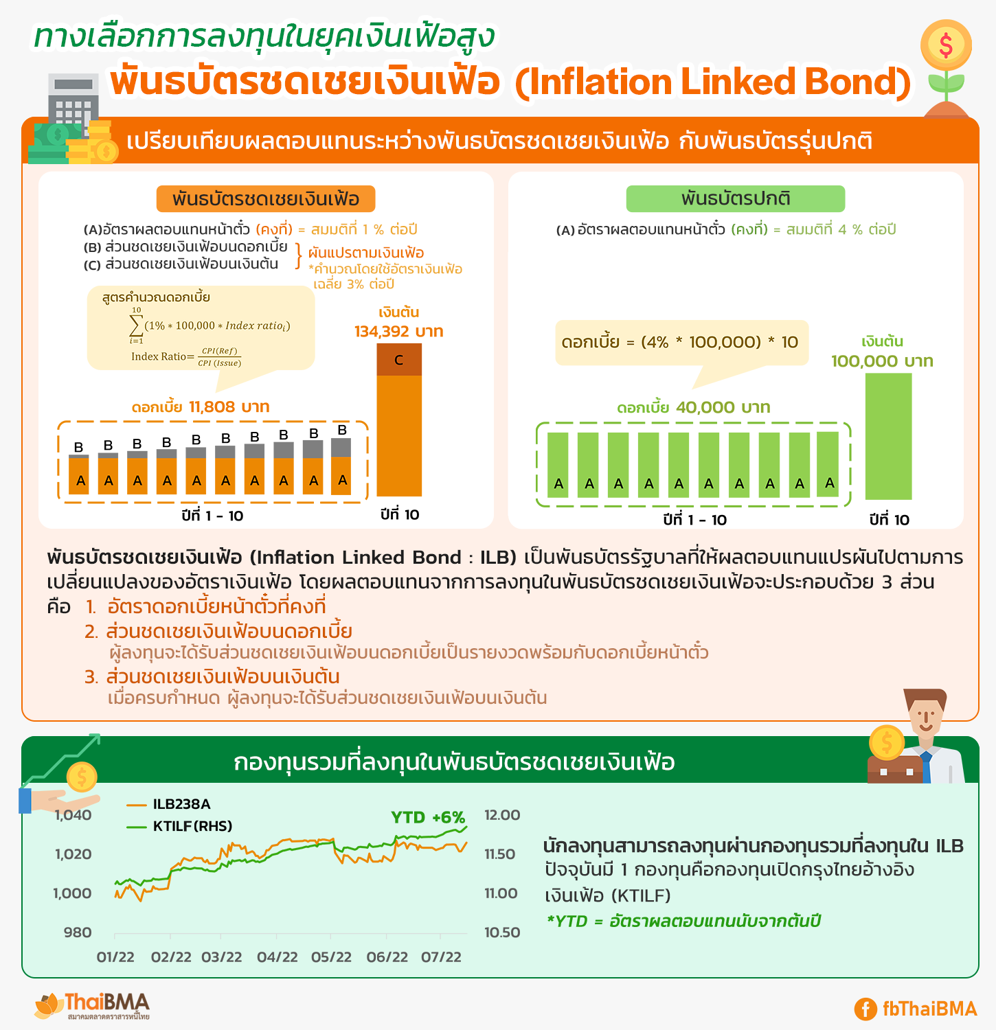 Posted by:ThaiBMA Posted on: Aug. 15, 2022 Share this post with ทางเลือกการลงทุนในยุคเงินเฟ้อสูง...พันธบัตรชดเชยเงินเฟ้อ (Inflation Linked Bond) นับจากจากต้นปี 2565 เงินเฟ้อของไทยเริ่มพุ่งตัวสูงขึ้นอย่างต่อเนื่องจากปัจจัยราคาอาหารและพลังงานที่ปรับตัวสูงขึ้นอันเป็นผลสืบเนื่องจากสงครามระหว่างรัสเซียกับยูเครน และมาตรการ Zero Covid ของจีน ก่อให้เกิดปัญหาคอขวดของห่วงโซ่อุปทาน ซึ่งหลายประเทศทั่วโลกได้ประสบภาวะเงินเฟ้อสูงเช่นเดียวกันกับประเทศไทย เงินเฟ้อไทยในเดือน มิ.ย. 2565 อยู่ที่ 7.66% สูงสุดรอบ 13 ปี เงินเฟ้อไทยในเดือน มิ.ย. 2565 ที่ 7.66% เมื่อเทียบช่วงเดียวกันของปีก่อน เป็นการปรับตัวสูงขึ้นต่อเนื่องจากเดือน พ.ค. 2565 ที่ 7.10% โดยนักเศรษฐศาสตร์คาดว่าในปี 2565 อัตราเงินเฟ้อของไทยเฉลี่ยทั้งปีจะอยู่ที่ 5.9% สูงสุดในรอบ 24 ปี เงินเฟ้อที่สูงขึ้นส่งผลให้อำนาจซื้อของผู้บริโภคลดลง แล้วนักลงทุนควรลงทุนในสินทรัพย์อะไรเพื่อรักษาอำนาจการซื้อไม่ให้ลดลง เมื่อเงินเฟ้อสูง ก็มักจะพูดถึงพันธบัตรชดเชยเงินเฟ้อ (Inflation Linked Bond) พันธบัตรชดเชยเงินเฟ้อ (Inflation Linked Bond) เป็นพันธบัตรรัฐบาลที่ให้ผลตอบแทนแปรผันไปตามการเปลี่ยนแปลงของดัชนีอัตราเงินเฟ้อ โดยผลตอบแทนจากการลงทุนในพันธบัตรชดเชยเงินเฟ้อจะประกอบด้วย 3 ส่วน คือ 1.อัตราดอกเบี้ยหน้าตั๋ว 2.ส่วนชดเชยเงินเฟ้อบนดอกเบี้ย ผู้ลงทุนจะได้รับเป็นรายงวดพร้อมกับดอกเบี้ยหน้าตั๋ว และ 3.ส่วนชดเชยเงินเฟ้อบนเงินต้น เมื่อพันธบัตรชดเชยเงินเฟ้อครบกำหนดไถ่ถอน กรณีเงินเฟ้อปรับตัวเพิ่มขึ้นผู้ลงทุนจะได้รับเงินต้นและบวกด้วยส่วนชดเชยเงินเฟ้อ แต่ถ้าเงินเฟ้อมีการปรับตัวลดลง นักลงทุนจะได้รับเงินต้นคืนตามมูลค่าหน้าตั๋วโดยไม่หักลดกับอัตราเงินเฟ้อที่ติดลบ ดังนั้นการลงทุนในพันธบัตรชดเชยเงินเฟ้อ นักลงทุนจะได้รับการปกป้องจากเงินเฟ้อรักษาอำนาจซื้อให้ไม่ลดลง ที่ผ่านมา ประเทศไทยมีการออกพันธบัตรชดเชยเงินเฟ้อ ทั้งสิ้น 2 รุ่นมูลค่ารวม 2.17 แสนล้านบาท โดย ณ วันที่ 12 ก.ค. 2565 มีพันธบัตรชดเชยเงินเฟ้อคงเหลือ 1 รุ่น (ILB283A ครบกำหนด 12 มี.ค. 2571) อีกรุ่นหนึ่งครบกำหนดอายุไปแล้ว ทำให้มีมูลค่าคงค้างที่ 1.07 แสนล้านบาทคิดเป็น 1.5% ของมูลค่าคงค้างพันธบัตรของไทย ซึ่งน้อยมากเมื่อเทียบกับประเทศสหรัฐอเมริกาที่มีสัดส่วนพันธบัตรชดเชยเงินเฟ้อ 7.5% ของมูลค่าคงค้างพันธบัตรรัฐบาล (ณ สิ้น เม.ย. 2565) อย่างไรก็ตาม พันธบัตรชดเชยเงินเฟ้อไทยเป็นตราสารหนี้ประเภทหนึ่งที่น่าสนใจในช่วงที่เงินเฟ้อสูง จะหาซื้อพันธบัตรชดเชยเงินเฟ้อ (Inflation Linked Bond) ได้จากที่ไหน การซื้อพันธบัตรชดเชยเงินเฟ้อโดยตรงเป็นไปได้ยาก เพราะมีการซื้อขายเปลี่ยน
