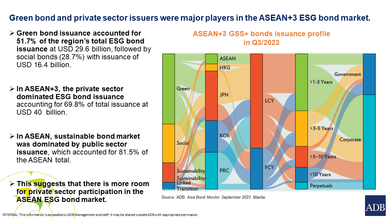 Posted by:ThaiBMA Posted on:Dec. 7, 2023 Share this post with สาระสำคัญจากงานสัมมนา “Enable ESG Bond Issuance: Global Dynamic & Thailand Framework Development” เมื่อวันที่ 22 พฤศจิกายน 2566 สมาคมตลาดตราสารหนี้ไทย (ThaiBMA) ร่วมกับกองทุนส่งเสริมการพัฒนาตลาดทุน (CMDF) จัดงานสัมมนา “Enable ESG Bond Issuance: Global Dynamic & Thailand Framework Development” โดยงานสัมมนาได้รับความสนใจจากผู้แทนจากองค์กรต่างๆ ทั้งภาครัฐและเอกชนเข้าร่วมงาน ณ สถานที่จัดงานและผ่านออนไลน์รวมกว่า 300 ท่าน ซึ่งสาระสำคัญจากงานสัมมนาสามารถสรุปได้ 3 ส่วนด้วยกัน ส่วนที่หนึ่ง: ความสำคัญของการพัฒนาอย่างยั่งยืน และ Global Dynamic ที่มีผลกระทบต่อการดำเนินการด้านความยั่งยืนของประเทศไทย โดย ดร.สมจินต์ ศรไพศาล กรรมการผู้จัดการ สมาคมตลาดตราสารหนี้ไทย ได้กล่าวถึงการพัฒนาอย่างยั่งยืนควรครอบคลุม E: Environment สภาพแวดล้อม ที่เหมาะสมต่อการอยู่อาศัย S: Social ใส่ใจสังคมโดยรวม G: Governance องค์กรและผู้บริหารมีธรรมาภิบาลในการปฏิบัติหน้าที่เพื่อนำพาทุกองคาพยพไปสู่ความยั่งยืน จำเป็นต้องใช้เงินทุนมหาศาลในการปรับปรุงและดำเนินกิจกรรมเพื่อให้เกิดการเปลี่ยนผ่าน ซึ่งตลาดทุนโดยเฉพาะตลาดตราสารหนี้จะมีบทบาทมากขึ้น ในการเป็นแหล่งระดมทุนที่สำคัญในการช่วยรักษาโลกผ่านเครื่องมือทางการเงินที่เรียกว่าตราสารหนี้กลุ่มความยั่งยืน หรือ ESG Bond ESG Bond ประกอบด้วยตราสารหนี้เพื่ออนุรักษ์สิ่งแวดล้อม (Green Bond) ตราสารหนี้เพื่อพัฒนาสังคม (Social Bond) ตราสารหนี้เพื่อความยั่งยืน (Sustainability Bond) ซึ่งจัดเป็นกลุ่ม Use of Proceeds Bond หรือตราสารหนี้ที่มีการระบุวัตถุประสงค์การใช้เงินกับโครงการเพื่อสิ่งแวดล้อมและสังคม ส่วนตราสารหนี้ส่งเสริมความยั่งยืน (Sustainability-Linked Bond: SLB) จะมีการระบุให้ผลตอบแทนขึ้นอยู่กับตัวชี้วัดหรือเป้าหมายด้านความยั่งยืนโดยรวมของบริษัท และ ตราสารหนี้เปลี่ยนผ่านสู่ความยั่งยืน (Transition Bond) สำหรับผู้ออกที่ยังจำเป็นต้องปล่อยก๊าซเรือนกระจกสูงแต่ต้องการปรับเปลี่ยนธุรกิจสู่การเป็นมิตรกับสิ่งแวดล้อม (ซึ่งสำนักงาน ก.ล.ต. ร่วมกับหน่วยงานที่เกี่ยวข้องอยู่ระหว่างศึกษาการจัดทำคู่มือการออกและเสนอขาย Transition Bond) การเปลี่ยนแปลงสภาพภูมิอากาศที่ทวีความรุนแรงขึ้นที่ผ่านมา ได้ส่งสัญญาณให้ประเทศต่างๆ ตื่นตัวและร่วมมือกันในระดับสากลเป็น “ความตกลงปารีส (Paris Agreement)” ตามกรอบอนุสัญญาสหประชาชาติว่าด้วยการเปลี่ยนแปลงสภาพภูมิอากาศ (United Nations Framework Convention on Climate Change-UNFCCC) เพื่อรับมือกับภาวะโลกร้อนที่ 196 ประเทศทั่วโลกมีเป้าหมายร่วมกันในการปล่อยก๊าซเรือนกระจกสุทธิเป็นศูนย์ (Net Zero Emission) ให้ได้ภายในปี ค.ศ. 2050 ในระดับภูมิภาค เช่น สหภาพยุโรปได้ออกมาตรการปรับราคาคาร์บอนก่อนข้ามพรมแดน หรือ CBAM (Carbon Border Adjustment Mechanism) 