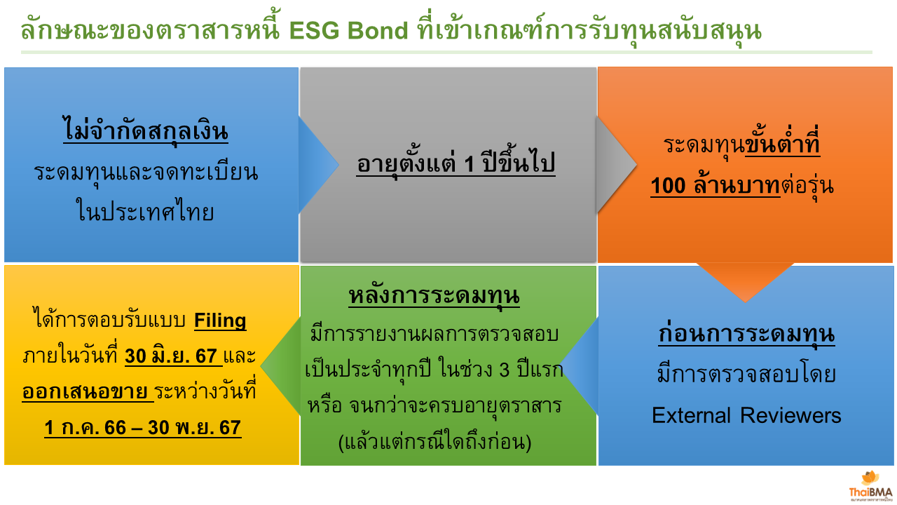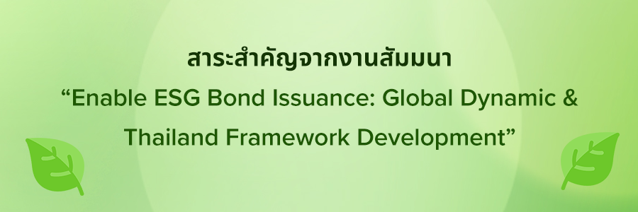 Bond Blogs Posted by:ThaiBMA Posted on:Dec. 7, 2023 Share this post with สาระสำคัญจากงานสัมมนา “Enable ESG Bond Issuance: Global Dynamic & Thailand Framework Development” เมื่อวันที่ 22 พฤศจิกายน 2566 สมาคมตลาดตราสารหนี้ไทย (ThaiBMA) ร่วมกับกองทุนส่งเสริมการพัฒนาตลาดทุน (CMDF) จัดงานสัมมนา “Enable ESG Bond Issuance: Global Dynamic & Thailand Framework Development” โดยงานสัมมนาได้รับความสนใจจากผู้แทนจากองค์กรต่างๆ ทั้งภาครัฐและเอกชนเข้าร่วมงาน ณ สถานที่จัดงานและผ่านออนไลน์รวมกว่า 300 ท่าน ซึ่งสาระสำคัญจากงานสัมมนาสามารถสรุปได้ 3 ส่วนด้วยกัน ส่วนที่หนึ่ง: ความสำคัญของการพัฒนาอย่างยั่งยืน และ Global Dynamic ที่มีผลกระทบต่อการดำเนินการด้านความยั่งยืนของประเทศไทย โดย ดร.สมจินต์ ศรไพศาล กรรมการผู้จัดการ สมาคมตลาดตราสารหนี้ไทย ได้กล่าวถึงการพัฒนาอย่างยั่งยืนควรครอบคลุม E: Environment สภาพแวดล้อม ที่เหมาะสมต่อการอยู่อาศัย S: Social ใส่ใจสังคมโดยรวม G: Governance องค์กรและผู้บริหารมีธรรมาภิบาลในการปฏิบัติหน้าที่เพื่อนำพาทุกองคาพยพไปสู่ความยั่งยืน จำเป็นต้องใช้เงินทุนมหาศาลในการปรับปรุงและดำเนินกิจกรรมเพื่อให้เกิดการเปลี่ยนผ่าน ซึ่งตลาดทุนโดยเฉพาะตลาดตราสารหนี้จะมีบทบาทมากขึ้น ในการเป็นแหล่งระดมทุนที่สำคัญในการช่วยรักษาโลกผ่านเครื่องมือทางการเงินที่เรียกว่าตราสารหนี้กลุ่มความยั่งยืน หรือ ESG Bond ESG Bond ประกอบด้วยตราสารหนี้เพื่ออนุรักษ์สิ่งแวดล้อม (Green Bond) ตราสารหนี้เพื่อพัฒนาสังคม (Social Bond) ตราสารหนี้เพื่อความยั่งยืน (Sustainability Bond) ซึ่งจัดเป็นกลุ่ม Use of Proceeds Bond หรือตราสารหนี้ที่มีการระบุวัตถุประสงค์การใช้เงินกับโครงการเพื่อสิ่งแวดล้อมและสังคม ส่วนตราสารหนี้ส่งเสริมความยั่งยืน (Sustainability-Linked Bond: SLB) จะมีการระบุให้ผลตอบแทนขึ้นอยู่กับตัวชี้วัดหรือเป้าหมายด้านความยั่งยืนโดยรวมของบริษัท และ ตราสารหนี้เปลี่ยนผ่านสู่ความยั่งยืน (Transition Bond) สำหรับผู้ออกที่ยังจำเป็นต้องปล่อยก๊าซเรือนกระจกสูงแต่ต้องการปรับเปลี่ยนธุรกิจสู่การเป็นมิตรกับสิ่งแวดล้อม (ซึ่งสำนักงาน ก.ล.ต. ร่วมกับหน่วยงานที่เกี่ยวข้องอยู่ระหว่างศึกษาการจัดทำคู่มือการออกและเสนอขาย Transition Bond) การเปลี่ยนแปลงสภาพภูมิอากาศที่ทวีความรุนแรงขึ้นที่ผ่านมา ได้ส่งสัญญาณให้ประเทศต่างๆ ตื่นตัวและร่วมมือกันในระดับสากลเป็น “ความตกลงปารีส (Paris Agreement)” ตามกรอบอนุสัญญาสหประชาชาติว่าด้วยการเปลี่ยนแปลงสภาพภูมิอากาศ (United Nations Framework Convention on Climate Change-UNFCCC) เพื่อรับมือกับภาวะโลกร้อนที่ 196 ประเทศทั่วโลกมีเป้าหมายร่วมกันในการปล่อยก๊าซเรือนกระจกสุทธิเป็นศูนย์ (Net Zero Emission) ให้ได้ภายในปี ค.ศ. 2050 ในระดับภูมิภาค เช่น สหภาพยุโรปได้ออกมาตรการปรับราคาคาร์บอนก่อนข้ามพรมแดน หรือ CBAM (Carbon Border Adjustment 