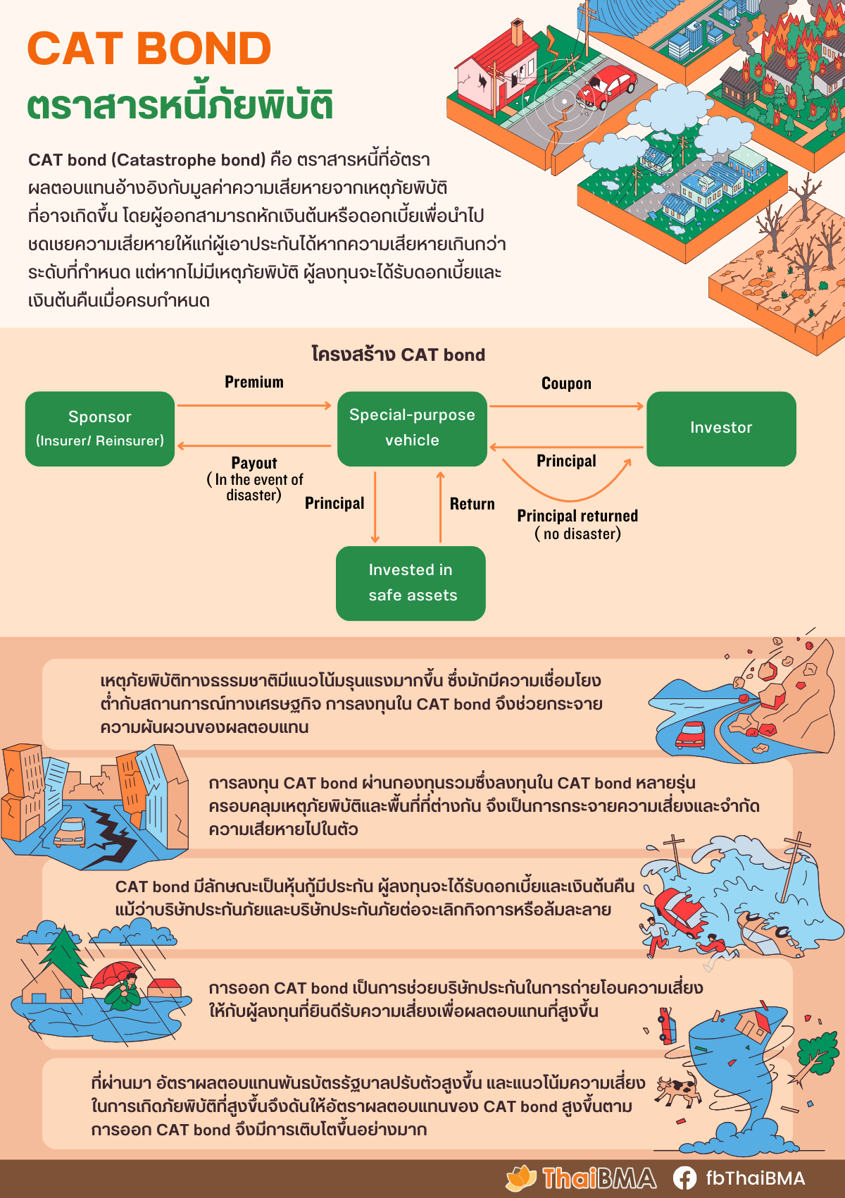Posted by:ThaiBMA Posted on:APR. 9, 2024 Share this post with CAT Bond ตราสารหนี้ภัยพิบัติ ในช่วงหลายปีที่ผ่านมา ภาวะโลกร้อนมีความรุนแรงมากขึ้นส่งผลให้มีการเปลี่ยนแปลงสภาพภูมิอากาศ สุดขั้ว เกิดภัยพิบัติทางธรรมชาติต่างๆ ที่รุนแรง ทั้งไฟป่า พายุฝน และน้ำท่วม บริษัทประกันภัยหรือบริษัทประกันภัยต่อจึงมีความต้องการออก CAT bond มากขึ้นเพื่อลดหรือถ่ายโอนความเสี่ยงของบริษัทให้กับ ผู้ลงทุนที่ยินดีรับความเสี่ยงเพื่อผลตอบแทนที่สูงขึ้น ประกอบกับอัตราผลตอบแทนพันธบัตรรัฐบาลปรับตัวสูงขึ้น และแนวโน้มความเสี่ยงในการเกิดภัยพิบัติที่สูงขึ้นจึงดันให้อัตราผลตอบแทนของ CAT bond สูงขึ้นตาม ในช่วงที่ผ่านมา CAT bond จึงมีการเติบโตขึ้นอย่างมาก CAT bond (Catastrophe bond) หรือตราสารหนี้ภัยพิบัติ คือ ตราสารหนี้ที่อัตราผลตอบแทน อ้างอิงกับมูลค่าความเสียหายของเหตุภัยพิบัติที่จะเกิดขึ้น ซึ่งถ้าเกิดเหตุภัยพิบัติขึ้นจนกระทั่งมูลค่าความเสียหายสูงแตะระดับที่กำหนดไว้ ผู้ออกจะสามารถหักเงินต้นหรือดอกเบี้ยตามขั้นที่กำหนดเพื่อนำไปชดเชยความเสียหายให้แก่ผู้เอาประกัน แต่หากไม่เกิดเหตุภัยพิบัติตามที่ระบุไว้ขึ้น เมื่อครบกำหนดผู้ลงทุนจะได้รับดอกเบี้ยและเงินต้นคืน ดังนั้นอัตราผลตอบแทนหรือ Coupon ของตราสารหนี้ CAT bond จึงสูงกว่าตราสารหนี้ทั่วไปเพื่อชดเชยกับโอกาสที่อาจต้องสูญเงินต้นหรือดอกเบี้ย การเปลี่ยนแปลงสภาพภูมิอากาศที่ทวีความรุนแรง ประกอบกับต้นทุนการบรรเทาและฟื้นฟูความเสียหายที่ปรับตัวสูงขึ้นตามอัตราเงินเฟ้อ ส่งผลให้ในปี 2023 ที่ผ่านมา มูลค่าการออก CAT bond ทั่วโลก ทำสถิติการออกสูงสุดเป็นประวัติการณ์ที่ 15,000 ล้านดอลลาร์สหรัฐ เพิ่มขึ้นเกือบ 2 เท่าจากปีก่อนหน้า เป็นผลให้ ณ สิ้นปี 2023 มูลค่าคงค้าง CAT bond เพิ่มขึ้นมาอยู่ที่ 41,000 ล้านดอลลาร์สหรัฐ โดยที่ CAT bond ส่วนใหญ่เป็นการออกของหน่วยงานเฉพาะกิจ (Special Purpose Vehicle: SPV) ที่จัดตั้งโดยบริษัทประกันภัยและบริษัทประกันภัยต่อซึ่งกว่า 80% เป็นบริษัทจากประเทศสหรัฐอเมริกา ตามมาด้วยยุโรปและญี่ปุ่น นอกจากนี้ ผู้ออก CAT bond ยังรวมถึง Insurance vehicles หรือ กองทุนที่ดำเนินการโดยภาครัฐ เช่น สำนักงานแผ่นดินไหวแห่งแคลิฟอร์เนีย สมาคมประกันวาตภัยแห่งเท็กซัส เป็นต้น และ World bank ที่ระดมทุนให้กับประเทศกำลังพัฒนาสำหรับรับมือภัยพิบัติทางธรรมชาติ ตัวอย่าง CAT bond ที่ออกในปี 2023 • World bank: (มีนาคม) ออก CAT bond อายุ 3 ปี มูลค่า 630 ล้านดอลลาร์สหรัฐ ในนามรัฐบาลชิลีเพื่อรองรับความเสียหายจากแผ่นดินไหวและสึนามิ เป็น CAT bond ที่มีมูลค่าการออกสูงที่สุดของ World bank ในการรับโอนความเสี่ยงจากประเทศเดียว • Nakama Re: (เมษายน) ออก CAT bond อายุ 5 ปี มูลค่า 