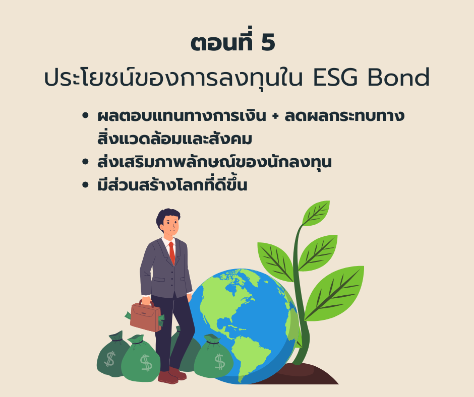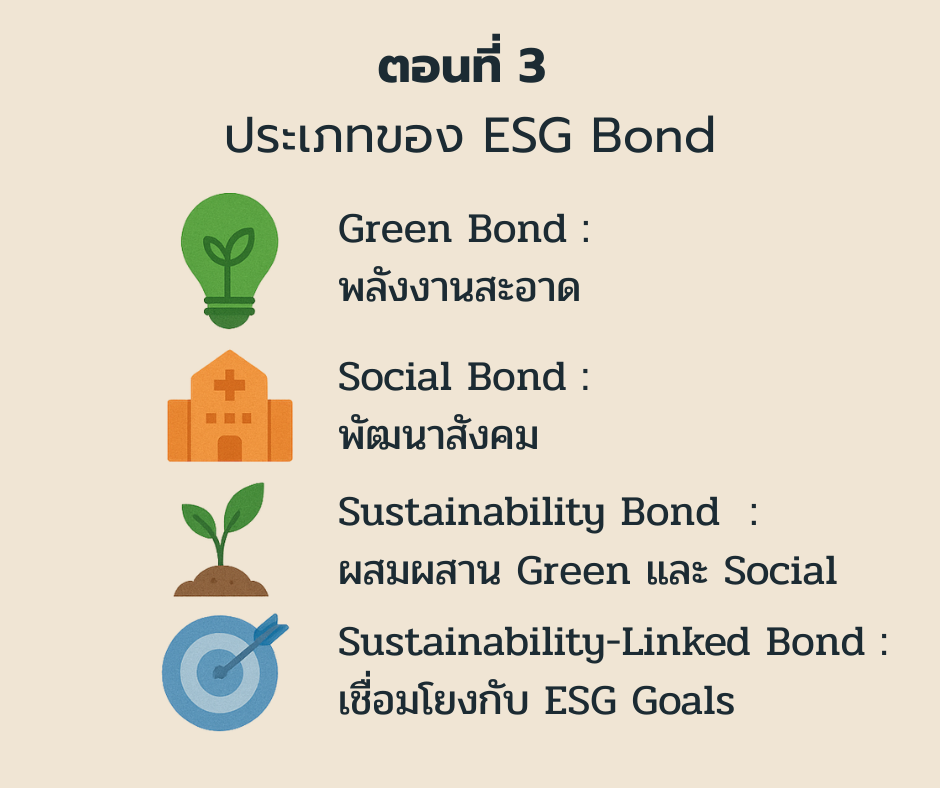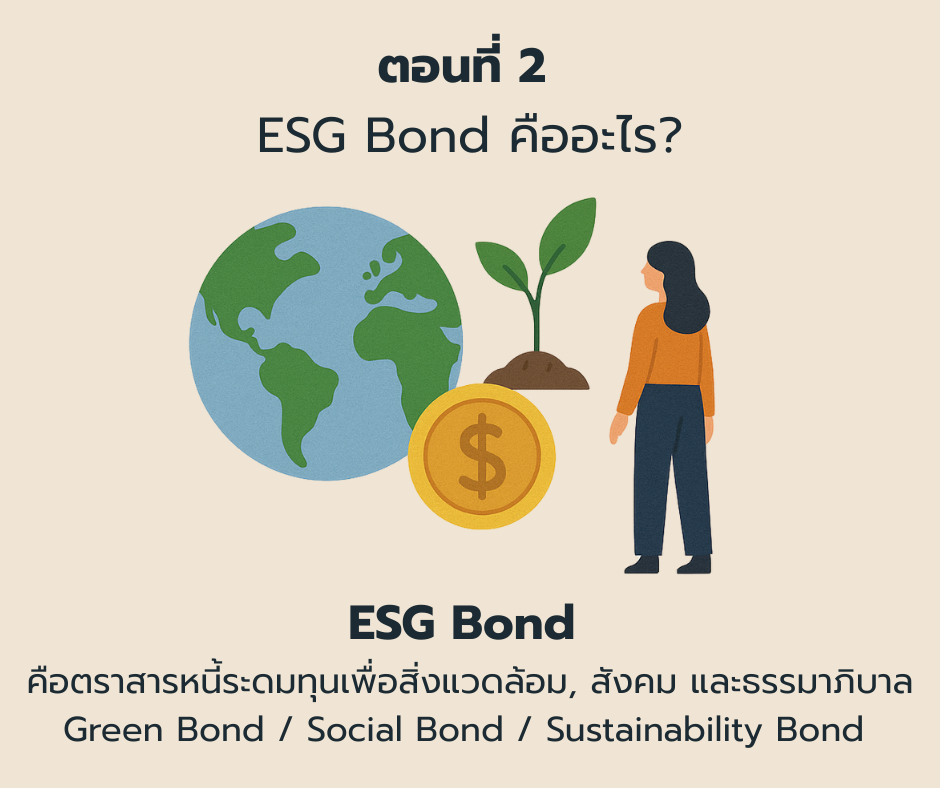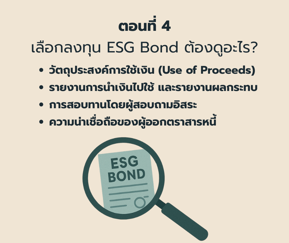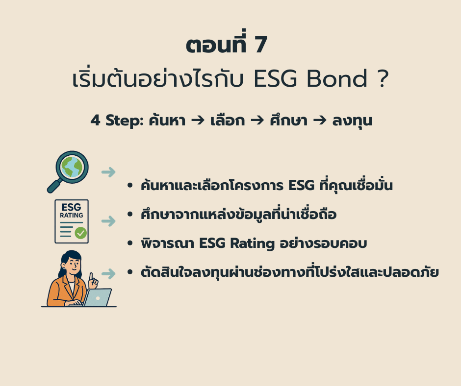 Bond Blogs Posted by:ThaiBMA Posted on:AUG. 13, 2025 Share this post with เริ่มต้นอย่างไรกับ ESG Bond? 🌱 เริ่มต้นอย่างไรกับ ESG Bond? หากคุณกำลังมองหาการลงทุนที่ให้ทั้ง ผลตอบแทนทางการเงิน และ คุณค่าทางสังคมและสิ่งแวดล้อม ESG Bond คือตัวเลือกที่น่าสนใจ และนี่คือขั้นตอนเริ่มต้นง่าย ๆ: 1. ค้นหาและเลือกโครงการ ESG ดูว่าเป็น Green Bond, Social Bond, Sustainability Bond หรือ Sustainability-Linked Bond ทำความเข้าใจว่าเงินที่ได้จากการออก ESG Bond นำไปใช้ในโครงการด้านสิ่งแวดล้อมและสังคมอย่างไร และมีเป้าหมายและตัวชี้วัดผลสำเร็จอย่างไร ควรเลือกโครงการที่สอดคล้องกับ “ค่านิยมด้านความยั่งยืน” ของตนเอง เพื่อให้การลงทุนมีความหมายและน่าติดตาม 📌 แหล่งข้อมูล: รายงานความยั่งยืนของบริษัท / เว็บไซต์บริษัทที่ออกตราสาร / ThaiBMA ESG Platform 2. ศึกษาข้อมูลจากแหล่งที่เชื่อถือได้ เว็บไซต์ของผู้ออกตราสาร (Issuer), รายงานจากองค์กรจัดอันดับความน่าเชื่อถือ (Credit Rating Agencies), รายงาน SPO (Second Party Opinion) จากองค์กรที่ประเมินความยั่งยืน, หน่วยงานกลาง เช่น ThaiBMA, สำนักงาน ก.ล.ต. (SEC), หรือ ICMA ThaiBMA - ESG Information platform เป็น one stop service ซึ่งรวบรวมข้อมูลตราสารหนี้ ESG ที่ออกในไทยพร้อมรายละเอียด เช่น วัตถุประสงค์ของโครงการ วัตถุประสงค์การใช้เงิน อัตราดอกเบี้ย ฯลฯ และสามารถค้นหาและเลือกดูเฉพาะตราสารหนี้ ESG แต่ละประเภทได้ง่าย 📌 แหล่งข้อมูล: https://www.thaibma.or.th/EN/BondInfo/ESG.aspx 3. พิจารณาข้อมูล ESG Rating มองหาผู้ออกตราสารที่ได้รับการจัดอันดับ ESG จากองค์กร เช่น SET ESG rating, FTSE Russell ESG Scores และ ESG Risk Rating เป็นต้น ช่วยประเมินความยั่งยืนของผู้ออกตราสารในมิติต่าง ๆ เช่น ความเสี่ยงด้านสิ่งแวดล้อม การจัดการแรงงาน ความโปร่งใสในการบริหารจัดการ ESG Rating ไม่ได้การันตีผลตอบแทน แต่ช่วยลดความเสี่ยง “เชิงภาพลักษณ์และจริยธรรม” ในระยะยาว 📌 แหล่งข้อมูล: เว็บไซต์ของบริษัทจัดอันดับ ESG, รายงานกองทุนรวมที่เน้น ESG 4. ตัดสินใจลงทุน ติดตาม ปฏิทินหุ้นกู้ออกใหม่ ผ่านช่องทางต่าง ๆ เช่น ThaiBMA Facebook, แอปพลิเคชัน Mebond, เว็บไซต์ ThaiBMA ติดต่อ ตัวแทนจัดจำหน่าย ที่ระบุไว้ในหนังสือชี้ชวน หรือข้อมูลจากแพลตฟอร์มที่กล่าวถึงข้างต้น 📌 แหล่งข้อมูล: https://www.facebook.com/fbthaibma ✨ สรุปสั้น ๆ เริ่มต้นกับ ESG Bond อย่างมั่นใจ 🔍 ค้นหาและเลือกโครงการ ESG ที่คุณเชื่อมั่น 📚 ศึกษาจากแหล่งข้อมูลที่น่าเชื่อถือ 📊 พิจารณา ESG Rating อย่างรอบคอบ 💰 ตัดสินใจลงทุนผ่านช่องทางที่โปร่งใสและปลอดภัย 🔖 แหล่งข้อมูลเพิ่มเติม: ThaiBMA / ICMA Green & Social Bond Principles / Sustainalytics สามารถศึกษาข้อมูล ESG ตอนที่ 1-7 ตามลิ้งด้านล่างได้เพิ่มเติมค่ะ ตอนที่ 1 : ESG Investment คืออะไร? https://www.facebook.com/share/p/1GCM1vyFDX/ ตอนที่ 2 : ESG Bond คืออะไร? https://www.facebook.com/share/p/16sAY9j53e/ ตอนที่ 3 : ประเภทของ ESG Bond https://www.facebook.com/share/p/1C5jZJZ2Td/ ตอนที่ 4 : เลือกลงทุน ESG Bond ต้องดูอะไร? https://www.facebook.com/share/p/18camv3TKv/ ตอน
