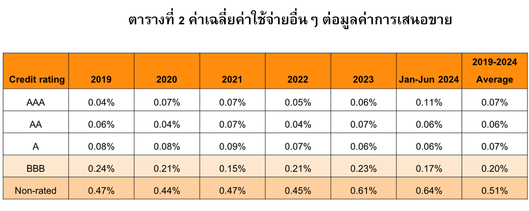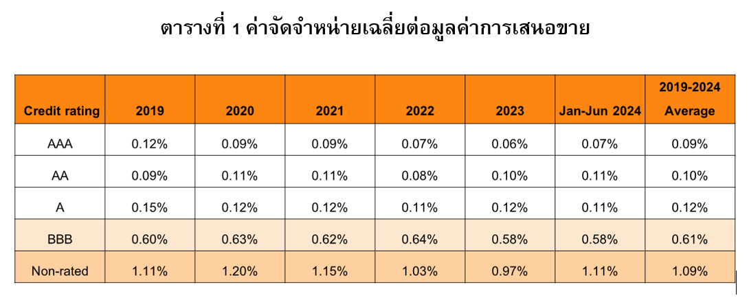 Posted by:ThaiBMA Posted on:JAN. 16, 2025 Share this post with ค่าใช้จ่ายในการออกและเสนอขายหุ้นกู้ในประเทศไทย ในการออกหุ้นกู้ของภาคธุรกิจมีต้นทุนค่าใช้จ่ายหลัก คือ ดอกเบี้ยจ่ายของหุ้นกู้ ซึ่งจะขึ้นอยู่กับเครดิตความน่าเชื่อถือของผู้ออก และภาวะอัตราดอกเบี้ยในตลาดขณะนั้น และยังมีค่าใช้จ่ายที่เกี่ยวข้องในการออกและเสนอขายหุ้นกู้ ซึ่งประกอบด้วย ค่าธรรมเนียมจัดจำหน่าย (Underwriting fee) ค่าธรรมเนียมนายทะเบียน และผู้แทนผู้ถือหุ้นกู้ เป็นต้น ในบทความนี้จะเป็นการศึกษาค่าใช้จ่ายเริ่มแรกที่เกี่ยวข้องกับการออกหุ้นกู้ ซึ่งไม่รวมดอกเบี้ยจ่าย ในหุ้นกู้ที่มีอันดับความน่าเชื่อถือแตกต่างกันว่าอยู่ในระดับใด มีแนวโน้มเป็นอย่างไร สภาวะตลาดที่ผันผวนและปัญหาการชำระหนี้ที่เพิ่มขึ้นในช่วง 2-3 ปีที่ผ่านมาส่งผลกระทบถึงค่าใช้จ่ายดังกล่าวหรือไม่อย่างไร ค่าใช้จ่ายเริ่มแรกในการออกและเสนอขายหุ้นกู้ จากการเก็บรวบรวมข้อมูลจากหนังสือชี้ชวนการเสนอขายหุ้นกู้ สามารถจำแนกค่าใช้จ่ายเริ่มแรกในกระบวนการออกและเสนอขายหุ้นกู้ได้เป็น 2 กลุ่ม ไม่รวมถึงดอกเบี้ยจ่ายและค่าใช้จ่ายที่เกิดขึ้นภายหลังการเสนอขาย ดังนี้ 1. ค่าใช้จ่ายผันแปร: เป็นส่วนของค่าใช้จ่ายที่ผันแปรตามระดับความซับซ้อนของการออกหุ้นกู้ และสภาวะตลาดในช่วงเวลาที่ออกหุ้นกู้ ประกอบด้วย • ค่าธรรมเนียมการจัดจำหน่าย (Underwriting fee) เป็นค่าธรรมเนียมที่ผู้ออกหุ้นกู้ต้องจ่ายให้แก่ผู้จัดการการจัดจำหน่าย (Underwriter) ซึ่งสะท้อนถึงความพยายามในการขายที่อาจแตกต่างกันตามความซับซ้อนของตราสารหนี้ กลุ่มผู้ลงทุน อายุการออก ขนาดการเสนอขาย รวมถึงสภาวะตลาดในช่วงที่ออกและเสนอขาย • ค่าใช้จ่ายอื่น (Other expenses) ที่รวมถึงค่านายทะเบียน, ค่าผู้แทนผู้ถือหุ้นกู้, ค่าโฆษณาประชาสัมพันธ์ และค่าจัดเตรียมเอกสารต่างๆ เป็นต้น ทั้งนี้ ข้อมูลในหนังสือชี้ชวนไม่ได้แยกแต่ละองค์ประกอบอย่างชัดเจน ในการวิเคราะห์จึงนำเสนอเป็นภาพรวมของค่าใช้จ่ายอื่นๆ 2. ค่าใช้จ่ายคงที่ ซึ่งจะไม่ขึ้นอยู่กับสภาวะตลาด ได้แก่ ค่าธรรมเนียมขึ้นทะเบียนตราสารหนี้ ซึ่งมีอัตราไม่เกิน 0.02% ของมูลค่าการออกหุ้นกู้ และค่าธรรมเนียมยื่น Filing กับสำนักงานคณะกรรมการกำกับหลักทรัพย์และตลาดหลักทรัพย์ (ก.ล.ต.) มีอัตราค่าธรรมเนียมระหว่าง 50,000–1,000,000 บาทต่อครั้ง ขึ้นอยู่กับประเภทการเสนอขาย เนื่องจากค่าใช้จ่ายคงที่ในข้อ 2 ไม่มีการเปลี่ยนแปลงในช่วงที่ผ่านมา บทความนี้จึงจะพิจารณาเฉพาะค่าใช้จ่ายผันแปรในข้อ 1 ว่าอยู่ในระดับใดสำหรับหุ้นกู้แต่ละกลุ่มเรทติ้ง และมีแนวโน้มการเปลี่ยนแปลงในช่วงที่ผ