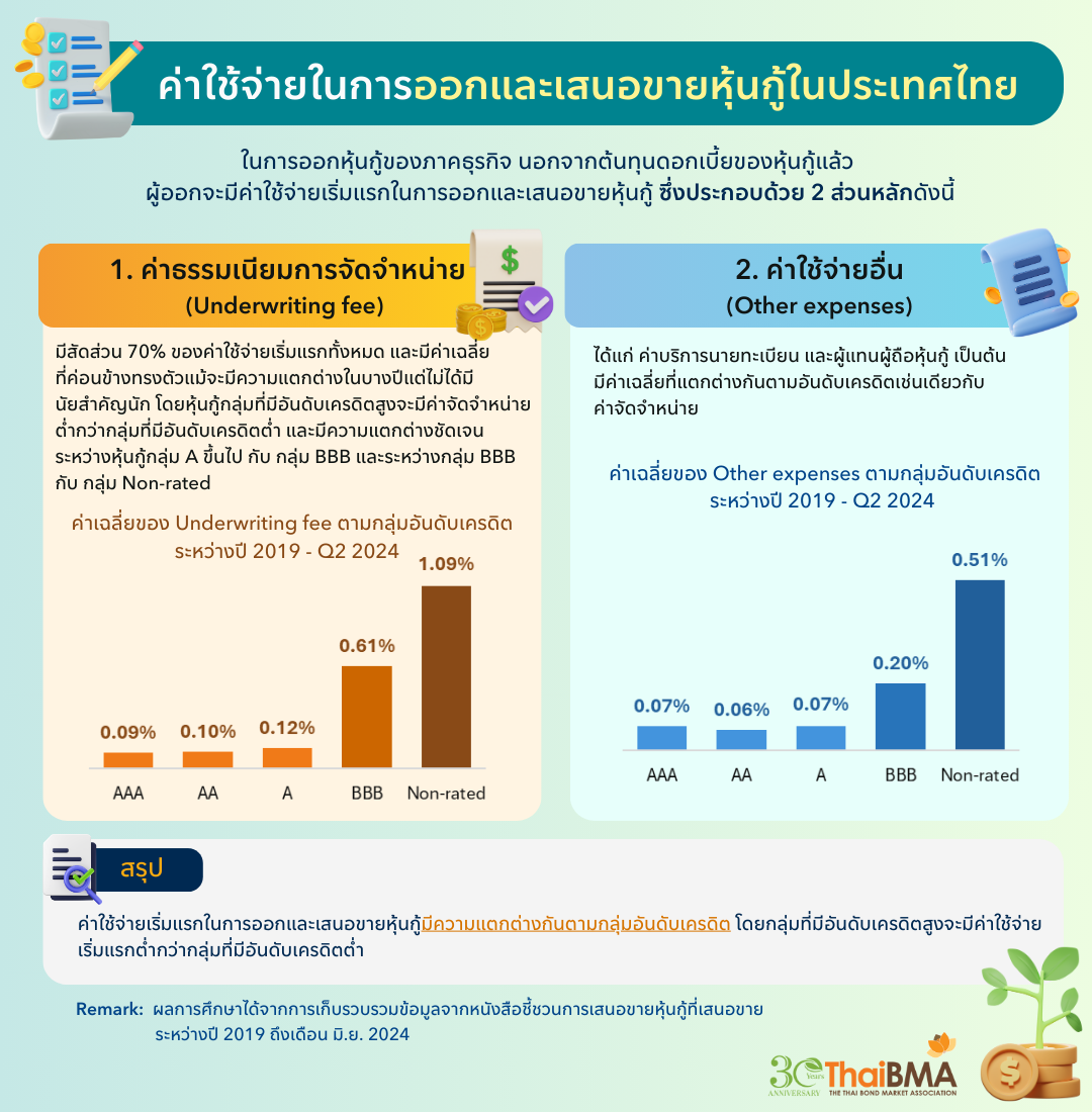 Bond Blogs Posted by:ThaiBMA Posted on:JAN. 16, 2025 Share this post with ค่าใช้จ่ายในการออกและเสนอขายหุ้นกู้ในประเทศไทย ในการออกหุ้นกู้ของภาคธุรกิจมีต้นทุนค่าใช้จ่ายหลัก คือ ดอกเบี้ยจ่ายของหุ้นกู้ ซึ่งจะขึ้นอยู่กับเครดิตความน่าเชื่อถือของผู้ออก และภาวะอัตราดอกเบี้ยในตลาดขณะนั้น และยังมีค่าใช้จ่ายที่เกี่ยวข้องในการออกและเสนอขายหุ้นกู้ ซึ่งประกอบด้วย ค่าธรรมเนียมจัดจำหน่าย (Underwriting fee) ค่าธรรมเนียมนายทะเบียน และผู้แทนผู้ถือหุ้นกู้ เป็นต้น ในบทความนี้จะเป็นการศึกษาค่าใช้จ่ายเริ่มแรกที่เกี่ยวข้องกับการออกหุ้นกู้ ซึ่งไม่รวมดอกเบี้ยจ่าย ในหุ้นกู้ที่มีอันดับความน่าเชื่อถือแตกต่างกันว่าอยู่ในระดับใด มีแนวโน้มเป็นอย่างไร สภาวะตลาดที่ผันผวนและปัญหาการชำระหนี้ที่เพิ่มขึ้นในช่วง 2-3 ปีที่ผ่านมาส่งผลกระทบถึงค่าใช้จ่ายดังกล่าวหรือไม่อย่างไร ค่าใช้จ่ายเริ่มแรกในการออกและเสนอขายหุ้นกู้ จากการเก็บรวบรวมข้อมูลจากหนังสือชี้ชวนการเสนอขายหุ้นกู้ สามารถจำแนกค่าใช้จ่ายเริ่มแรกในกระบวนการออกและเสนอขายหุ้นกู้ได้เป็น 2 กลุ่ม ไม่รวมถึงดอกเบี้ยจ่ายและค่าใช้จ่ายที่เกิดขึ้นภายหลังการเสนอขาย ดังนี้ 1. ค่าใช้จ่ายผันแปร: เป็นส่วนของค่าใช้จ่ายที่ผันแปรตามระดับความซับซ้อนของการออกหุ้นกู้ และสภาวะตลาดในช่วงเวลาที่ออกหุ้นกู้ ประกอบด้วย • ค่าธรรมเนียมการจัดจำหน่าย (Underwriting fee) เป็นค่าธรรมเนียมที่ผู้ออกหุ้นกู้ต้องจ่ายให้แก่ผู้จัดการการจัดจำหน่าย (Underwriter) ซึ่งสะท้อนถึงความพยายามในการขายที่อาจแตกต่างกันตามความซับซ้อนของตราสารหนี้ กลุ่มผู้ลงทุน อายุการออก ขนาดการเสนอขาย รวมถึงสภาวะตลาดในช่วงที่ออกและเสนอขาย • ค่าใช้จ่ายอื่น (Other expenses) ที่รวมถึงค่านายทะเบียน, ค่าผู้แทนผู้ถือหุ้นกู้, ค่าโฆษณาประชาสัมพันธ์ และค่าจัดเตรียมเอกสารต่างๆ เป็นต้น ทั้งนี้ ข้อมูลในหนังสือชี้ชวนไม่ได้แยกแต่ละองค์ประกอบอย่างชัดเจน ในการวิเคราะห์จึงนำเสนอเป็นภาพรวมของค่าใช้จ่ายอื่นๆ 2. ค่าใช้จ่ายคงที่ ซึ่งจะไม่ขึ้นอยู่กับสภาวะตลาด ได้แก่ ค่าธรรมเนียมขึ้นทะเบียนตราสารหนี้ ซึ่งมีอัตราไม่เกิน 0.02% ของมูลค่าการออกหุ้นกู้ และค่าธรรมเนียมยื่น Filing กับสำนักงานคณะกรรมการกำกับหลักทรัพย์และตลาดหลักทรัพย์ (ก.ล.ต.) มีอัตราค่าธรรมเนียมระหว่าง 50,000–1,000,000 บาทต่อครั้ง ขึ้นอยู่กับประเภทการเสนอขาย เนื่องจากค่าใช้จ่ายคงที่ในข้อ 2 ไม่มีการเปลี่ยนแปลงในช่วงที่ผ่านมา บทความนี้จึงจะพิจารณาเฉพาะค่าใช้จ่ายผันแปรในข้อ 1 ว่าอยู่ในระดับใดสำหรับหุ้นกู้แต่ละกลุ่มเรทติ้ง และมีแนวโน้มการเปลี่ยนแปลงในช่วงท