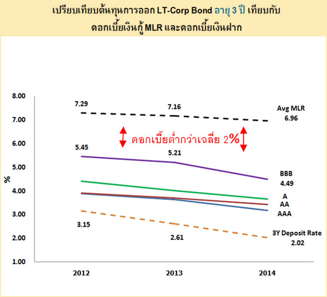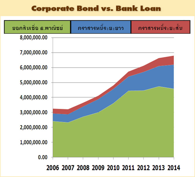 Posted by:ThaiBMA Posted on: Jul 29, 2015 Share this post with ตราสารหนี้ภาคเอกชนไทยกับการเติบโตอย่างมั่นคง ตอนที่ 2 กลุ่มไหนน่าจับตา ? หากมองที่กลุ่มอุตสาหกรรมที่เติบโตในตลาดตราสารหนี้ภาคเอกชน พลังงานคือกลุ่มที่มีการเติบโตครองตลาดมานับสิบปี นำโดยกลุ่ม ปตท. ขณะที่กลุ่มที่น่าจับตามองเป็นพิเศษ คือ กลุ่มอสังหาริมทรัพย์และรับเหมาก่อสร้าง ที่มีมูลค่าคงค้างเพิ่มขึ้นอย่างต่อเนื่องตลอดช่วง 3-4 ปีที่ผ่านมานี้ ซึ่งมาจากการขยายตัวเพื่อรองรับนโยบายของภาครัฐในการพัฒนาโครงสร้างพื้นฐานต่างๆ ในประเทศ และถ้าแผนงบประมาณเบิกจ่ายของรัฐเป็นไปตามแผน กลุ่มคมนาคมขนส่งก็เป็นอีกกลุ่มที่น่าจับตามองเพิ่มว่าอาจจะมีการเติบโตเช่นกัน เติบโตเร็วกว่า “GDP” ในส่วนของภาพรวมจีดีพีไทยปี 2014 จะเห็นว่ามีการเติบโตเพียงแค่ 1.84% (ใช้การคำนวน GDP แบบใหม่) แต่มูลค่าตลาดตราสารหนี้ภาคเอกชนโดยรวมกลับโตถึง 17.16% จะเห็นว่าเติบโตมากกว่า GDP ถึงกว่า 9 เท่า แสดงให้เห็นถึงการตื่นตัวและให้ความสำคัญกับการระดมทุนผ่านตราสารหนี้มากขึ้นในภาคธุรกิจ โดยในปี 2014 ที่ผ่านมา สัดส่วนตราสารหนี้ภาคเอกชนต่อ GDP เท่ากับ 16.81% เติบโตจากปี 2006 ที่มีสัดส่วนเพียงแค่ 9.94 % ต่อ GDP กู้ธนาคาร vs. ออกตราสารหนี้ จากสัดส่วนหนี้สินของภาคธุรกิจ จะเห็นว่าการกู้ยืมผ่านธนาคารยังคงเป็นช่องทางหลักในการระดมทุน แต่เริ่มมีแนวโน้มชะลอตัวลง ขณะที่ตราสารหนี้ภาคเอกชนทั้งระยะยาวและระยะสั้นเริ่มจะมีสัดส่วนเพิ่มขึ้นเรื่อยๆ โดยเฉพาะในตราสารหนี้ภาคเอกชนระยะยาว นั่นหมายความว่าบริษัทเอกชนต่างๆ ในไทยกำลังหันไปให้ความสนใจในการออกตราสารหนี้กันมากขึ้น ถูกกว่ากู้ธนาคาร เมื่อเปรียบทียบต้นทุนการกู้เงินธนาคารกับต้นทุนดอกเบี้ยจากการออกตราสารหนี้นั้น ต้นทุนการจ่ายดอกเบี้ยของการออกตราสารหนี้ต่ำกว่าการกู้เงินธนาคารอย่างชัดเจน แม้ว่าผู้ออกจะมีเรตติ้งในระดับล่างสุดของ Investment Grade (BBB) ก็ยังมีส่วนต่างที่ประหยัดได้โดยเฉลี่ยแล้วอยู่ที่ประมาณ 2% ด้วยเหตุนี้บริษัทต่างๆ จึงนิยมหันมาออกตราสารหนี้เพิ่มขึ้นแทนการกู้เงินธนาคาร สรุป จากที่กล่าวไปทั้งหมดจะเห็นได้ว่าอนาคตของตลาดตราสารหนี้นั้นยังมีโอกาสในการเติบโตอีกมาก ซึ่งเอื้อประโยชน์กับทั้งผู้ที่ต้องการออมเงินและผู้กู้เงิน เมื่อบริษัทต่างๆ หันมาใช้ตราสารหนี้กันมากขึ้นก็จะช่วยประหยัดต้นทุนทางการเงินและนำไปสู่ผลกำไรของบริษัทที่เพิ่มขึ้น ในส่วนของนักลงทุนที่เปลี่ยนจากการฝากเงินมาเป็นการลงทุนในตราสารหนี้เองก็จะได้ดอกเบี้ยที่สูงขึ้น นอกจากนี้ ตลาดตราสารหนี้มีส่วนสำคัญในการขับเค