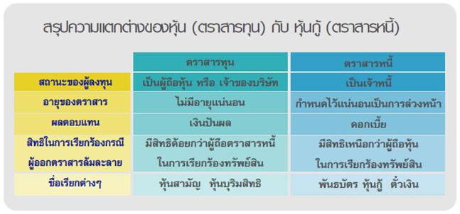Posted by:ThaiBMA Posted on: Dec 8, 2015 Share this post with “หุ้น” กับ “หุ้นกู้” แฝดคนละฝา “หุ้นกู้” จัดเป็นตราสารหนี้ ผู้ถือตราสารหรือนักลงทุนมีสถานะเป็นเจ้าหนี้ ผลตอบแทนที่ได้จะมีความสม่ำเสมอและแน่นอนโดยอยู่ในรูปของดอกเบี้ย (Interest) ตลอดอายุตามเงื่อนไขที่ระบุไว้ โดยความเสี่ยงจะขึ้นอยู่กับเครดิตหรือความน่าเชื่อถือของผู้ออกตราสารหนี้ (Issuer rating) ว่ามีความเป็นได้ที่จะผิดนัดชำระดอกเบี้ยหรือเงินต้นหรือไม่ “หุ้น” จัดเป็นตราสารทุน ผู้ถือตราสารหรือนักลงทุนมีสถานะเป็นผู้ถือหุ้นหรือเป็นเจ้าของร่วมในบริษัท ผลตอบแทนที่ได้จะไม่แน่นอน โดยจะมีทั้งส่วนต่างราคาหุ้น (Capital gain) ซึ่งมีความเสี่ยงจากการเปลี่ยนแปลงผันผวนของราคาได้ทุกวัน (อาจจะกำไรหรือขาดทุนก็ได้) และมีเงินปันผล (Dividend Yield) ซึ่งจะมากหรือน้อยก็ขึ้นอยู่กับผลกำไรของบริษัท ความแตกต่างที่สำคัญอีกอย่างระหว่าง ตราสารหนี้ กับ ตราสารทุน ก็คือ ในกรณีที่ผู้ออกตราสารไม่สามารถดำเนินกิจการต่อไปได้และอยู่ในสภาพล้มละลาย สิทธิการเรียกร้องในสินทรัพย์ของบริษัทผู้ออกตราสารจะแตกต่างกัน โดยผู้ถือตราสารหนี้ซึ่งมีสถานะเป็นเจ้าหนี้จะมีสิทธิเรียกร้องได้ก่อนผู้ถือตราสารทุนที่มีสถานะเป็นผู้ถือหุ้น ไม่ว่าจะเป็นหุ้นสามัญหรือหุ้นบุริมสิทธิก็ตาม สรุปอีกครั้งนะครับ “หุ้น” คือ การลงทุนในรูปแบบ “ร่วมเป็นผู้ถือหุ้น” ผลตอบแทนไม่แน่นอน “หุ้นกู้” คือ การลงทุนในรูปแบบ “ให้ยืมเงิน (เราเป็นเจ้าหนี้)” ผลตอบแทนค่อนข้างแน่นอน