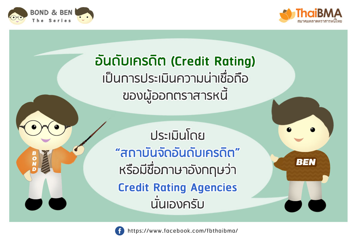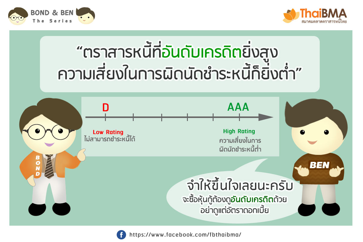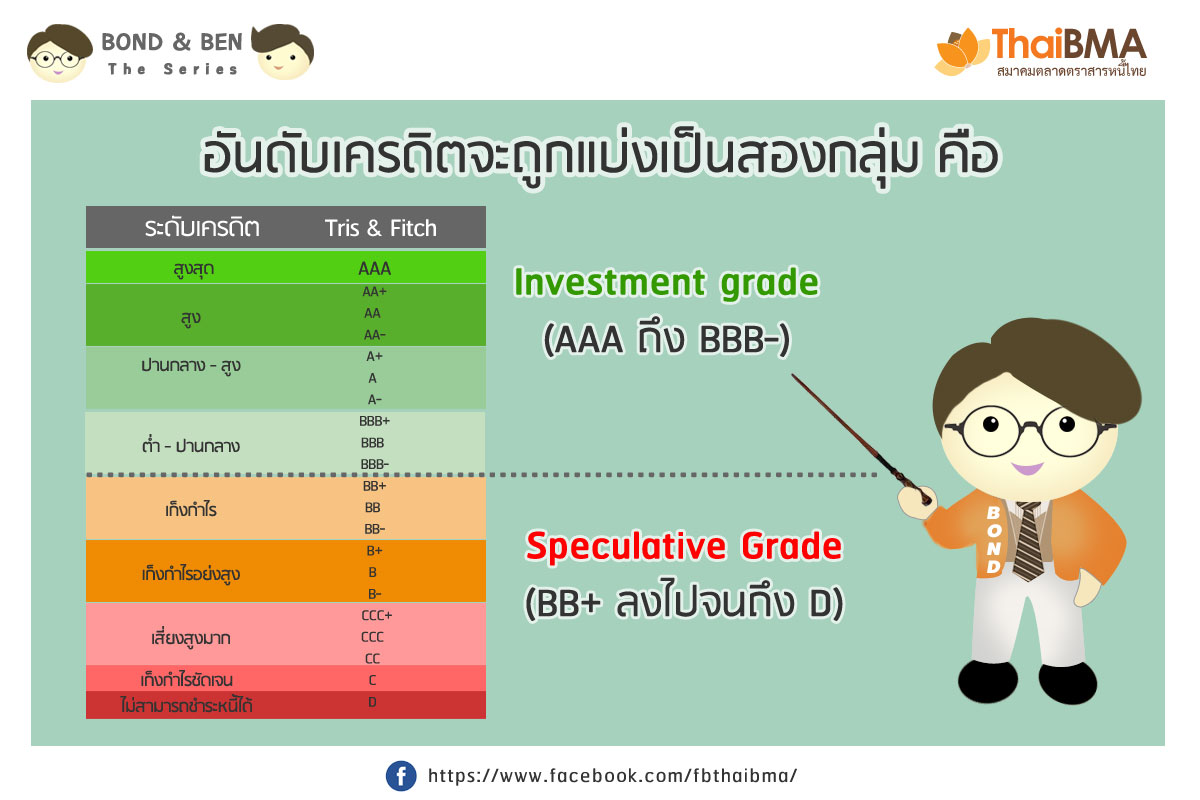 Posted by:ThaiBMA Posted on: Mar 31, 2017 Share this post with อันดับความน่าเชื่อถือ (Credit Rating) อันดับความน่าเชื่อถือ (Credit Rating) เป็นการประเมินความน่าเชื่อถือของผู้ออกตราสารหนี้ โดย “สถาบันจัดอันดับความน่าเชื่อถือ (Credit Rating Agencies)” ที่ได้รับการรับรองจากสำนักงานกำกับหลักทรัพย์และตลาดหลักทรัพย์ (กลต.) ในประเทศไทยมี 2 แห่งคือ บริษัท ทริสเรทติ้ง จำกัด และ บริษัท ฟิทช์ เรทติ้งส์ (ประเทศไทย) จำกัด สถาบันจัดอันดับความน่าเชื่อถือเปรียบเสมือนนักชิมหรือผู้ตรวจสอบคุณภาพของอาหารก่อนจะถึงมือผู้บริโภค (นักลงทุน) ถ้าอาหารชนิดนั้นมีคุณภาพดีและปลอดภัยจะให้เกรด AAA จนไปถึงคุณภาพต่ำจะให้เกรด D กล่าวคือตราสารหนี้ที่อันดับเครดิตยิ่งสูง ความเสี่ยงในการผิดนัดชำระหนี้ก็ยิ่งต่ำ (ดังรูป) อันดับความน่าเชื่อถือจะถูกแบ่งเป็นสองกลุ่ม คือ Investment Grade หรือ กลุ่มน่าลงทุน (AAA ถึง BBB-) และ Speculative Grade หรือกลุ่มเก็งกำไร (BB+- ลงไปจนถึง D) โดยบริษัทจัดอันดับเครดิตจะวิเคราะห์จากผลการดำเนินงานและความเสี่ยงต่างๆที่มีผลกระทบต่อบริษัท ซึ่งนักลงทุนจะต้องติดตามการเปลี่ยนแปลงอันดับเครดิตตลอดระยะเวลาการลงทุน อันดับความน่าเชื่อถือเป็นลักษณะที่สำคัญของตราสารหนี้ภาคเอกชน ซึ่งแตกต่างจากพันธบัตรรัฐบาล (Government Bond) ที่ถือเป็นตราสารหนี้ที่ปราศจากความเสี่ยงด้านเครดิตเนื่องจากรัฐบาลมีความน่าเชื่อถือมากที่สุดในประเทศ จากการที่รัฐบาลมีอำนาจในการเก็บภาษีเพื่อมาใช้คืนหนี้นั่นเอง ดังนั้นพันธบัตรรัฐบาลจึงถือเป็นตราสารหนี้ที่ไม่มีความเสี่ยงด้านเครดิต (Credit risk free) หากรัฐบาลต้องการออกตราสารไปขายต่างประเทศก็จะจัดอันดับเครดิตเช่นกัน ดังนั้นสำหรับตราสารหนี้ภาคเอกชน การจัดอันดับเครดิตจึงเป็นข้อมูลหนึ่งที่สำคัญในการพิจารณาว่าผู้ออกตราสาร ซึ่งมีสถานะเป็นลูกหนี้จะมีความสามารถในการจ่ายคืนมากน้อยแค่ไหน แล้วถ้าหากนักลงทุนได้ตัดสินใจซื้อตราสารหนี้ไปแล้ว ผู้ออกเกิดล้มละลาย! ท่านจะได้รับเงินคืนหรือไม่? ติดตามได้ในครั้งต่อไป สำหรับวันนี้ขอบคุณคร๊าบ!