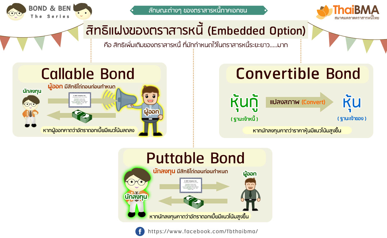 Posted by:ThaiBMA Posted on: Mar 16, 2017 Share this post with สิทธิแฝงของตราสารหนี้ (Embedded Option) Bond & Ben the series ตอน ลักษณะต่างๆ ของตราสารหนี้ภาคเอกชน จากตอนที่แล้วได้พูดถึงลักษณะต่าง ๆ ของตราสารหนี้ภาคเอกชนไปบ้าง ในตอนนี้จะพูดเกี่ยวกับลักษณะอื่นๆ ของตราสารหนี้ภาคเอกชนกันต่อนะครับ สิทธิแฝงของตราสารหนี้ (Embedded Option) คือ สิทธิเพิ่มเติมของตราสารหนี้ ได้แก่ สิทธิผู้ออกไถ่ถอนก่อนกำหนด (Callable) : ให้สิทธิผู้ออกในการไถ่ถอนตราสาร (call) ได้ก่อนกำหนดครบอายุ ซึ่งผู้ออกจะต้องกำหนดเงื่อนไขไว้ตั้งแต่ต้น เช่น ช่วงเวลาในการใช้สิทธิไถ่ถอน และราคาในการไถ่ถอนโดยนักลงทุนควรทราบเงื่อนไขเหล่านี้ก่อนการตัดสินใจลงทุนเนื่องจากมีผลต่อราคาของตราสารหนี้ เช่นตราสารหนี้ A อายุ 10 ปี มี call option ที่กำหนดให้ผู้ออกสามารถไถ่ถอนได้ตั้งแต่ปีที่ 5 เป็นต้นไป ณ ทุกงวดการจ่ายดอกเบี้ย โดยในช่วงที่อัตราดอกเบี้ยต่ำ ผู้ออกมักจะใช้สิทธิไถ่ถอนก่อนกำหนดเพื่อออกตราสารหนี้ใหม่ในต้นทุนที่ต่ำกว่า ทำให้นักลงทุนเสียโอกาสการได้รับดอกเบี้ยในอัตราที่สูงตามที่กำหนดไว้ของตราสาร เป็นต้น สิทธิผู้ถือไถ่ถอนก่อนกำหนด (Puttable): ให้สิทธิผู้ถือตราสารในการขอไถ่ถอนก่อนครบกำหนด โดยรายละเอียดของเงื่อนไขและวิธีการจะกำหนดล่วงหน้าตั้งแต่วันออกหุ้นกู้ โดยในช่วงที่อัตราดอกเบี้ยมีแนวโน้มจะสูงขึ้น ผู้ถือตราสารมักจะใช้สิทธิขอไถ่ถอนคืนก่อนกำหนด เพื่อที่จะนำเงินไปลงทุนในตราสารหนี้ที่เพิ่งเสนอขายที่ให้อัตราดอกเบี้ยที่สูงกว่า การแปลงสภาพ (Convertible): ให้สิทธิแก่ผู้ถือตราสารหนี้ในการแปลงสภาพจากการถือตราสารหนี้ไปเป็นหุ้นสามัญในอัตราราคาแปลงสภาพ และช่วงเวลาที่กำหนดไว้ ตราสารหนี้ที่มีสิทธิแฝงประเภทนี้จะได้รับความนิยมในช่วงที่ตลาดหุ้นมีแนวโน้มที่ดี เช่น ราคาหุ้นมีแนวโน้มสูงขึ้นมากกว่าราคาแปลงสภาพ นักลงทุนสามารถแปลงสภาพตราสารหนี้ที่ถืออยู่ให้เป็นหุ้นสามัญได้ ทำให้นักลงทุนได้กำไรจากส่วนต่างจากการขายหุ้น (Capital Gain) สิทธิแฝงเหล่านี้เป็นคุณสมบัติพื้นฐานของตราสารหนี้ภาคเอกชนระยะยาว ซึ่งนักลงทุนควรทราบและเข้าใจก่อนทำการลงทุน เพื่อให้การลงทุนของท่านเกิดประโยชน์สูงสุด ในตอนต่อไปจะกล่าวถึงอันดับความน่าเชื่อถือ (Credit Rating)ของตราสารหนี้ภาคเอกชน ที่สะท้อนถึงโอกาสการผิดนัดชำระหนี้ของผู้ออกตราสารหนี้...แล้วเจอกันเร็วๆ นี้นะคร๊าบ