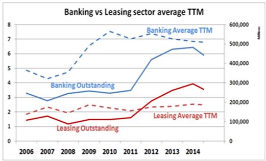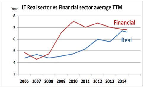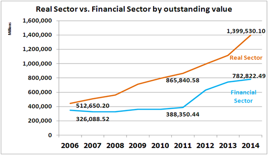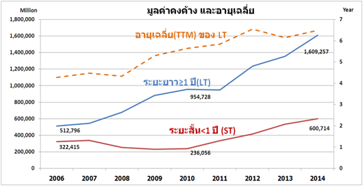 Posted by:ThaiBMA Posted on: Mar 21, 2015 Share this post with แนวโน้มและพัฒนาการตลาดตราสารหนี้ภาคเอกชน ตอน 1 ตราสารหนี้ระยะยาวภาคเอกชน ภาพรวมตลาดตราสารหนี้ภาคเอกชน ตลาดตราสารหนี้ระยะยาวภาคเอกชนของไทยมีการขยายตัวอย่างต่อเนื่อง เห็นได้จากมูลค่าคงค้างที่เพิ่มขึ้นจาก 835,211 ล้านบาทในปี 2006 เป็น 2,209,971 ล้านบาทในปี 2014 คิดเป็นอัตราการเติบโตกว่า 165% ในช่วงเวลา 8 ปีที่ผ่านมา (คิดเป็นอัตราเติบโตเฉลี่ย 13% ต่อปี) นอกจากนี้อายุเฉลี่ยของตราสารหนี้ยังมีแนวโน้มยาวขึ้นจากประมาณ 4 ปี ในปี 2006 เพิ่มขึ้นเป็น 6 ปี ในปี 2014 สำหรับตราสารหนี้ระยะสั้นก็มีการเติบโตมาอย่างต่อเนื่องเช่นเดียวกัน จากมูลค่าคงค้าง 322,415 ล้านบาทในปี 2006 เพิ่มขึ้นเป็น 600,714 ล้านบาทในปี 2014 คิดเป็นอัตราการขยายตัวกว่า 86% ในเวลาเพียง 8 ปี (คิดเป็นอัตราเติบโตเฉลี่ย 8% ต่อปี) นี่ย่อมแสดงให้เห็นถึงบทบาทที่เพิ่มขึ้นของตลาดตราสารหนี้ในการเป็นแหล่งระดมทุนของภาคเอกชน สัดส่วนมูลค่าคงค้างตราสารหนี้ต่อ GDP เมื่อเทียบสัดส่วนของหนี้ภาคเอกชนในภาคเศรษฐกิจจริงทั้งระบบต่อ GDP จะเห็นการเติบโตอย่างต่อเนื่องตั้งแต่ปี 2011-2014 โดยในปี 2014 หนี้ภาคเอกชนในภาคเศรษฐกิจจริงคิดเป็นสัดส่วน 52.18% ของ GDP เพิ่มขึ้นจาก 46.84% ในปี 2006 โดยพบว่าการออกตราสารหนี้เป็นเครื่องมือสำคัญอย่างหนึ่งในการระดมทุน โดยเฉพาะการใช้ตราสารหนี้ระยะยาว (LT) ที่เติบโตจาก 6.01% ในปี2006 เป็น 12.24% ในปี 2014 ในขณะที่ตราสารหนี้ระยะสั้นแม้จะมีแนวโน้มขยายตัวอย่างต่อเนื่อง แต่ก็ยังมีสัดส่วนค่อนข้างต่ำที่ 4.57% ของ GDP ในปี 2014 แนวโน้มมูลค่าคงค้างตราสารหนี้ระยะยาวภาคเศรษฐกิจจริงและภาคการเงิน เมื่อแบ่งตราสารหนี้ภาคเอกชนเป็น 2 ส่วน คือภาคเศรษฐกิจจริง(Real sector) และภาคการเงิน (Financial sector) จะพบว่าตราสารหนี้ระยะยาวในภาคเศรษฐกิจจริงมีมูลค่าคงค้างสูงกว่าภาคการเงินประมาณ 2 เท่า อย่างไรก็ตาม ทั้ง 2 ภาคธุรกิจมีการเติบโตของมูลค่าคงค้างอย่างต่อเนื่อง โดยภาคการเงินมีการเติบโตเฉลี่ยอยู่ที่ประมาณ 11% ต่อปีนับจากปี 2006-2014 มีมูลค่าคงค้างแตะจุดสูงสุดที่ 782,822.49 ล้านบาทในปี 2014 ในขณะที่ภาคเศรษฐกิจจริง มีการเติบโตเฉลี่ยที่ประมาณ 13% ต่อปี มูลค่าคงค้างจุดสูงสุดที่ 1,399,530 ล้านบาทในปี 2014 เทียบมูลค่าคงค้างตราสารหนี้กับการกู้เงินผ่านธนาคารพาณิชย์ของภาคธุรกิจ ตั้งแต่ปี 2011 เป็นต้นมา การระดมทุนของภาคธุรกิจโดยการกู้เงินจากธนาคารพาณิชย์เริ่มมีแนวโน้มชะลอตัวลงเมื่อเทียบกับการเติบโตของการระดมทุนผ่านตราสารหนี้ทั้งระยะยาวและระยะสั้น แสดงให้เห็นว่าภาคเอกชนเริ่มเห็นความสำคัญของการออกตราสารหนี้เพื่อลดต้นทุนของการระดมทุนมากขึ้น อายุเฉลี่