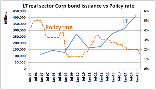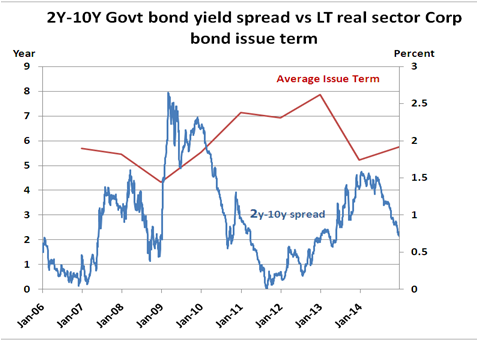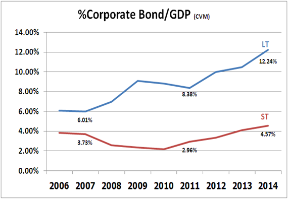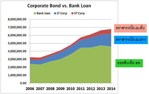 Bond Blogs Posted by:ThaiBMA Posted on: Mar 21, 2015 Share this post with แนวโน้มและพัฒนาการตลาดตราสารหนี้ภาคเอกชน ตอน 1 ตราสารหนี้ระยะยาวภาคเอกชน ภาพรวมตลาดตราสารหนี้ภาคเอกชน ตลาดตราสารหนี้ระยะยาวภาคเอกชนของไทยมีการขยายตัวอย่างต่อเนื่อง เห็นได้จากมูลค่าคงค้างที่เพิ่มขึ้นจาก 835,211 ล้านบาทในปี 2006 เป็น 2,209,971 ล้านบาทในปี 2014 คิดเป็นอัตราการเติบโตกว่า 165% ในช่วงเวลา 8 ปีที่ผ่านมา (คิดเป็นอัตราเติบโตเฉลี่ย 13% ต่อปี) นอกจากนี้อายุเฉลี่ยของตราสารหนี้ยังมีแนวโน้มยาวขึ้นจากประมาณ 4 ปี ในปี 2006 เพิ่มขึ้นเป็น 6 ปี ในปี 2014 สำหรับตราสารหนี้ระยะสั้นก็มีการเติบโตมาอย่างต่อเนื่องเช่นเดียวกัน จากมูลค่าคงค้าง 322,415 ล้านบาทในปี 2006 เพิ่มขึ้นเป็น 600,714 ล้านบาทในปี 2014 คิดเป็นอัตราการขยายตัวกว่า 86% ในเวลาเพียง 8 ปี (คิดเป็นอัตราเติบโตเฉลี่ย 8% ต่อปี) นี่ย่อมแสดงให้เห็นถึงบทบาทที่เพิ่มขึ้นของตลาดตราสารหนี้ในการเป็นแหล่งระดมทุนของภาคเอกชน สัดส่วนมูลค่าคงค้างตราสารหนี้ต่อ GDP เมื่อเทียบสัดส่วนของหนี้ภาคเอกชนในภาคเศรษฐกิจจริงทั้งระบบต่อ GDP จะเห็นการเติบโตอย่างต่อเนื่องตั้งแต่ปี 2011-2014 โดยในปี 2014 หนี้ภาคเอกชนในภาคเศรษฐกิจจริงคิดเป็นสัดส่วน 52.18% ของ GDP เพิ่มขึ้นจาก 46.84% ในปี 2006 โดยพบว่าการออกตราสารหนี้เป็นเครื่องมือสำคัญอย่างหนึ่งในการระดมทุน โดยเฉพาะการใช้ตราสารหนี้ระยะยาว (LT) ที่เติบโตจาก 6.01% ในปี2006 เป็น 12.24% ในปี 2014 ในขณะที่ตราสารหนี้ระยะสั้นแม้จะมีแนวโน้มขยายตัวอย่างต่อเนื่อง แต่ก็ยังมีสัดส่วนค่อนข้างต่ำที่ 4.57% ของ GDP ในปี 2014 แนวโน้มมูลค่าคงค้างตราสารหนี้ระยะยาวภาคเศรษฐกิจจริงและภาคการเงิน เมื่อแบ่งตราสารหนี้ภาคเอกชนเป็น 2 ส่วน คือภาคเศรษฐกิจจริง(Real sector) และภาคการเงิน (Financial sector) จะพบว่าตราสารหนี้ระยะยาวในภาคเศรษฐกิจจริงมีมูลค่าคงค้างสูงกว่าภาคการเงินประมาณ 2 เท่า อย่างไรก็ตาม ทั้ง 2 ภาคธุรกิจมีการเติบโตของมูลค่าคงค้างอย่างต่อเนื่อง โดยภาคการเงินมีการเติบโตเฉลี่ยอยู่ที่ประมาณ 11% ต่อปีนับจากปี 2006-2014 มีมูลค่าคงค้างแตะจุดสูงสุดที่ 782,822.49 ล้านบาทในปี 2014 ในขณะที่ภาคเศรษฐกิจจริง มีการเติบโตเฉลี่ยที่ประมาณ 13% ต่อปี มูลค่าคงค้างจุดสูงสุดที่ 1,399,530 ล้านบาทในปี 2014 เทียบมูลค่าคงค้างตราสารหนี้กับการกู้เงินผ่านธนาคารพาณิชย์ของภาคธุรกิจ ตั้งแต่ปี 2011 เป็นต้นมา การระดมทุนของภาคธุรกิจโดยการกู้เงินจากธนาคารพาณิชย์เริ่มมีแนวโน้มชะลอตัวลงเมื่อเทียบกับการเติบโตของการระดมทุนผ่านตราสารหนี้ทั้งระยะยาวและระยะสั้น แสดงให้เห็นว่าภาคเอกชนเริ่มเห็นความสำคัญของการออกตราสารหนี้เพื่อลดต้นทุนของการระดมทุนมากขึ้น อายุเ