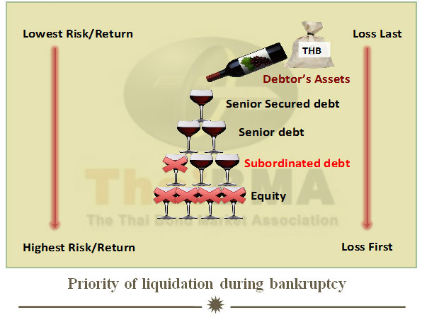 Bond Blogs Posted by:ThaiBMA Posted on: May 12 2016 Share this post with “หุ้นกู้ด้อยสิทธิ” เรามารู้จักกับ “หุ้นกู้ด้อยสิทธิ” หรือ SUBORDINATED BOND กัน!! หุ้นกู้ด้อยสิทธิ หรือ Subordinated Bond คือ หุ้นกู้ประเภทหนึ่งที่มีลักษณะ เช่น การจ่ายดอกเบี้ย และอายุ เหมือนหุ้นกู้ทั่วไป จะแตกต่างกันตรงที่สิทธิในการเรียกร้อง (Priority claim) เมื่อผู้ออกตราสารเกิดล้มละลาย ผู้ถือหุ้นกู้ประเภทนี้จะมีสิทธิเรียกร้องการชำระหนี้ในอันดับที่ด้อยกว่าเจ้าหนี้สามัญรายอื่นในการเรียกร้องสินทรัพย์จากผู้ออก แต่จะมีสิทธิเรียกร้องสูงกว่าผู้ถือหุ้นบุริมสิทธิ และหุ้นสามัญซึ่งมีสิทธิเรียกร้องเป็นอันดับสุดท้าย ในกรณีที่ผู้ออกตราสารล้มละลาย ผู้ออกหุ้นกู้ไม่สามารถชำระเงิน และต้องเฉลี่ยเงินให้กับเจ้าหนี้ทุกราย ผู้ถือหุ้นกู้ด้อยสิทธิ จะได้รับการชำระหนี้ภายหลังเจ้าหนี้อื่นๆที่มีสิทธิเรียกร้องสูงกว่า ดังเช่นในภาพ ไวน์ในขวดเปรียบเหมือนทรัพย์สินที่มีอยู่ของผู้ออกหุ้นกู้ แก้วแต่ละชั้นคืออันดับการชำระหนี้ เมื่อเริ่มเทไวน์ แก้วด้านบนจะทะยอยเต็มก่อน หากไวน์หมดขวดก่อน แก้วระดับล่างก็จะว่างเปล่า หรือกล่าวได้ว่า เจ้าหนี้จะไม่ได้รับการชำระหนี้ ทำให้โดยทั่วไปแล้ว หุ้นกู้ด้อยสิทธิจะมีอันดับเครดิตต่ำกว่าหุ้นกู้ไม่ด้อยสิทธิ (Senior Debt) และหุ้นกู้มีประกัน (Secured Debt) หุ้นกู้ประเภทนี้จึงเสนอผลตอบแทนที่สูงกว่า หรือ High risk high return นั่นเอง สำหรับประเทศไทย หุ้นกู้ด้อยสิทธิเพิ่งจะเริ่มมีการออกในปี 2554 มูลค่าคงค้างทั้งหมดในปัจจุบัน (10 พ.ค. 59) อยู่ที่ 239,080 ล้านบาท บริษัทที่ออกตราสารหนี้ประเภทนี้ส่วนใหญ่จะเป็นสถาบันการเงินเพื่อใช้เป็นเงินกองทุนของสถาบันการเงินโดยที่ผ่านมาหุ้นกู้ด้อยสิทธิที่ออกมักจะมีคุณลักษณะ (Feature) อื่นเพิ่มขึ้นมา เช่น ผู้ออกตราสารสามารถไถ่ถอนได้ก่อนกำหนด (Call option) ผู้ออกตราสารสามารถแปลงสภาพตราสารหนี้ประเภทนี้เป็นตราสารทุนได้หากผู้ออกมีผลการดำเนินงานที่ไม่สามารถดำเนินกิจการต่อไปได้ ผู้ออกตราสารสามารถตัดเป็นหนี้สูญ (ทั้งจำนวนหรือบางส่วน) เมื่อทางการตัดสินใจเข้าช่วยเหลือทางการเงินแก่ผู้ออกตราสาร ผู้ออกตราสารสามารถเลื่อนชำระดอกเบี้ยได้ในปีที่ไม่มีกำไร หรือไถ่ถอนเมื่อเลิกบริษัท ดังนั้นนักลงทุนที่ต้องการลงทุนในตราสารหนี้ประเภทนี้ควรศึกษาถึงคุณลักษณะอื่นๆ และความเสี่ยงที่สัมพันธ์กัน เพื่อวิเคราะห์ถึงผลตอบแทนที่จะได้รับว่าคุ้มค่าแล้วหรือยัง นอกเหนือไปจากความเสี่ยงที่นักลงทุนอาจไม่ได้รับเงินต้นและดอกเบี้ยคืนหากผู้ออกตราสารเกิดล้มละลายและมีสินทรัพย์ไม่เพียงพอที่จะชำระคืน ซึ่งถือเป