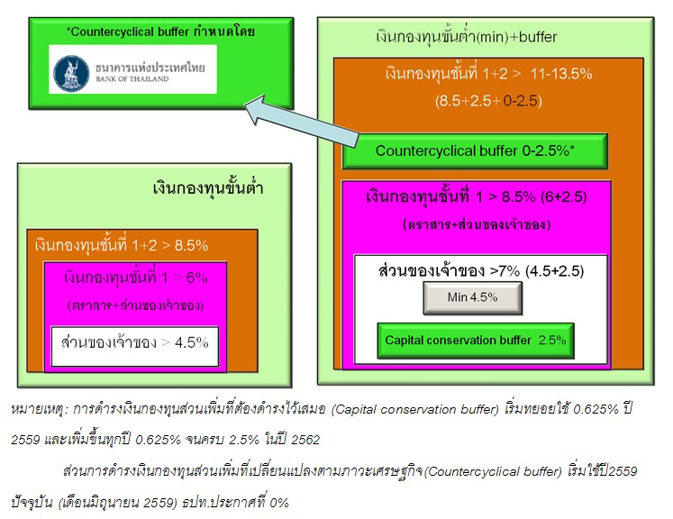 Posted by:ThaiBMA Posted on: Aug 04 2016 Share this post with ทำความรู้จักกับหลักเกณฑ์ Basel III และผลกระทบต่อตลาดตราสารหนี้ ที่มาของหลักเกณฑ์ Basel การเกิดวิกฤตการเงินโลกที่ผ่านมาโดยเฉพาะ Hamburger crisis หรือ Subprime crisis ราวปี 2008 ที่เกิดขึ้นในสหรัฐอเมริกาและมีผลกระทบเป็นวงกว้างไปยังภูมิภาคอื่นๆ ทั่วโลก ทำให้หน่วยงานกำกับดูแลด้านการเงินเพิ่มความเข้มงวดในการกำกับดูแลสถาบันการเงินมากขึ้น ซึ่งเป็นที่มาของการพัฒนาหลักเกณฑ์สากลในการกำกับดูแลระบบการเงิน เพื่อสร้างเสถียรภาพและความมั่นคงในระบบการเงินและสถาบันการเงิน ป้องกันมิให้เกิดวิกฤตการเงินซ้ำรอยขึ้นอีก หลักเกณฑ์สากลซึ่งเป็นที่ยอมรับในการกำกับดูแลสถาบันการเงิน เรียกว่า หลักเกณฑ์ Basel ซึ่งธนาคารกลางของแต่ละประเทศจะทยอยนำหลักเกณฑ์นี้มาบังคับใช้ในประเทศของตน เพื่อสร้างเสริมความมั่นคงของระบบการเงิน ทำให้สถาบันการเงินมีระบบการบริหารความเสี่ยงที่มีมาตรฐาน และเป็นการสร้างภูมิคุ้มกันให้สถาบันการเงินสามารถรองรับความผันผวนในยามเกิดวิกฤติได้ จาก Basel I สู่ Basel II ในช่วงแรกของการพัฒนา เริ่มจากหลักเกณฑ์ Basel I ที่เน้นไปที่การดำรงเงินกองทุนของธนาคาร เพื่อให้ธนาคารสามารถรองรับการขาดทุนจากการปล่อยสินเชื่อ และความผันผวนจากการลงทุนของธนาคารได้ โดยกำหนดให้ธนาคารดำรงเงินกองทุนเป็นสัดส่วนต่อสินทรัพย์เสี่ยง ยิ่งธนาคารมีสินทรัพย์เสี่ยงมากก็ต้องดำรงเงินกองทุนมากขึ้นตามทั้งนี้ การคำนวณสินทรัพย์เสี่ยงจะประเมินความเสี่ยงทั้ง “ด้านเครดิต” ที่เป็นความเสี่ยงจากการไม่ได้รับเงินคืนจากการปล่อยสินเชื่อ อันเป็นความเสี่ยงหลักในการปล่อยสินเชื่อ และความเสี่ยง “ด้านตลาด” ซึ่งเกิดจากความผันผวนของราคาสินทรัพย์ อันเป็นความเสี่ยงหลักของการลงทุน หลักเกณฑ์ Basel I กำหนดให้ธนาคารต้องดำรงเงินกองทุนให้เพียงพอต่อการรองรับความเสี่ยงดังกล่าว ต่อมา คณะกรรมการ Basel เห็นว่ายังมีความเสี่ยงด้านอื่นๆ ที่สำคัญที่มีผลกระทบต่อธุรกิจของสถาบันการเงิน เช่น ความเสี่ยงในการทุจริต การโกง การเกิดเหตุการณ์ต่างๆ ซึ่งสามารถสร้างความเสียหายที่รุนแรงต่อธุรกิจของธนาคาร ความเสี่ยงกลุ่มนี้จัดเป็นความเสี่ยงด้านปฏิบัติการ ดังนั้น จึงกำหนดหลักเกณฑ์เพิ่มเติมให้สถาบันการเงินต้องคำนวณสินทรัพย์เสี่ยงด้านปฏิบัติการด้วย ทำให้มีการปรับปรุงหลักเกณฑ์จาก Basel I เป็น Basel II โดยกำหนดให้สถาบันการเงินต้องดำรงเงินกองทุนต่อสินทรัพย์เสี่ยงทั้งด้านเครดิต ด้านตลาด และ ด้านปฏิบัติการ นอกจากนี้ Basel II ยังกำหนดให้ธนาคารต้องมีความโปร่งใส โดยให้มีการเปิดเผยข้อมู