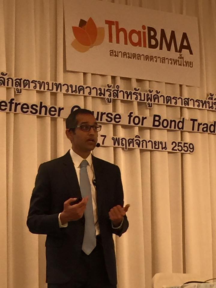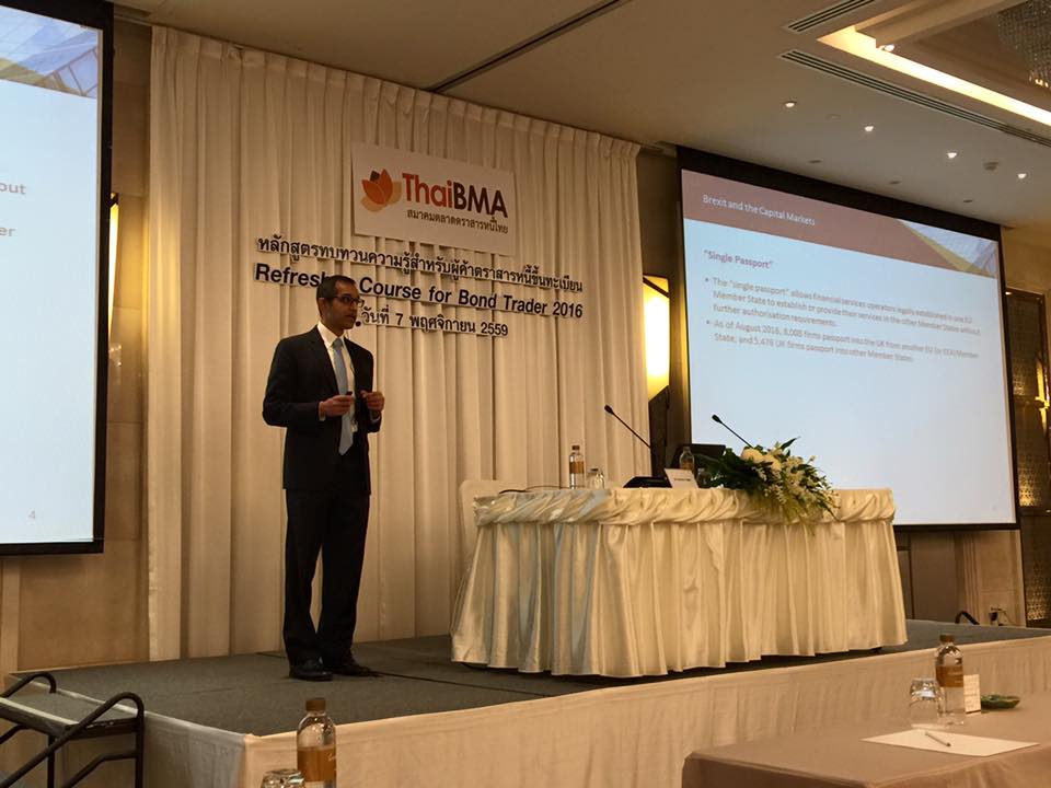 ThaiBMA Gallery ThaiBMA Refresher course for bond traders 2016 วันที่ 7 พฤศจิกายน 2559 เวลา08.30-17.00 น. สถานที่ ณ โรงแรมแกรนด์ เซ็นเตอร์พอยต์ เทอร์มินอล 21 รายละเอียด ThaiBMA Refresher course for bond traders 2016 เช้านี้เริ่มหัวข้อแรกกับ BREXIT: What does it mean for the bond market โดย Mr. Mushtaq Kapasi, Chief representative Asia-Pacific, International Capital Market Association (ICMA) Back to Main Gallery