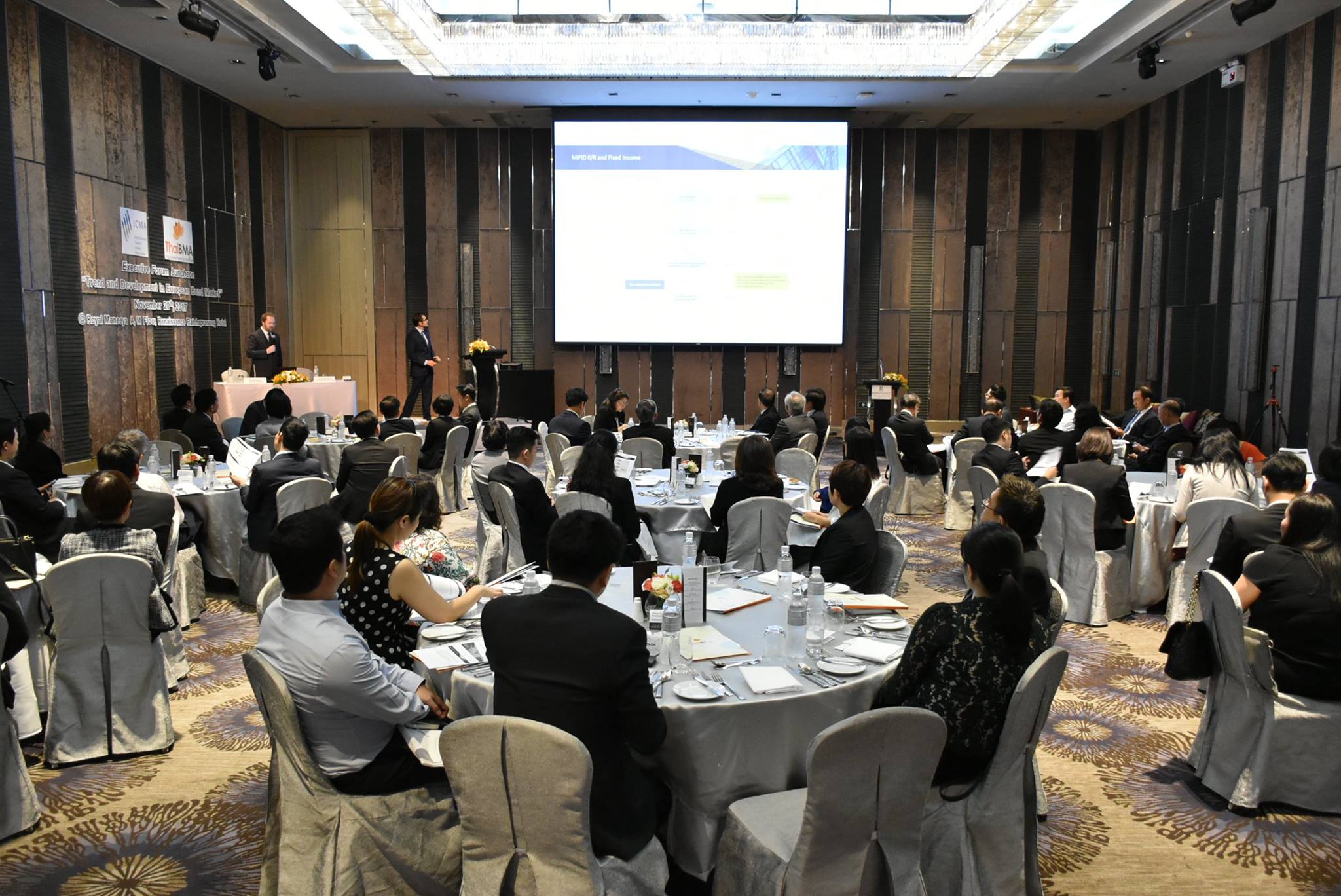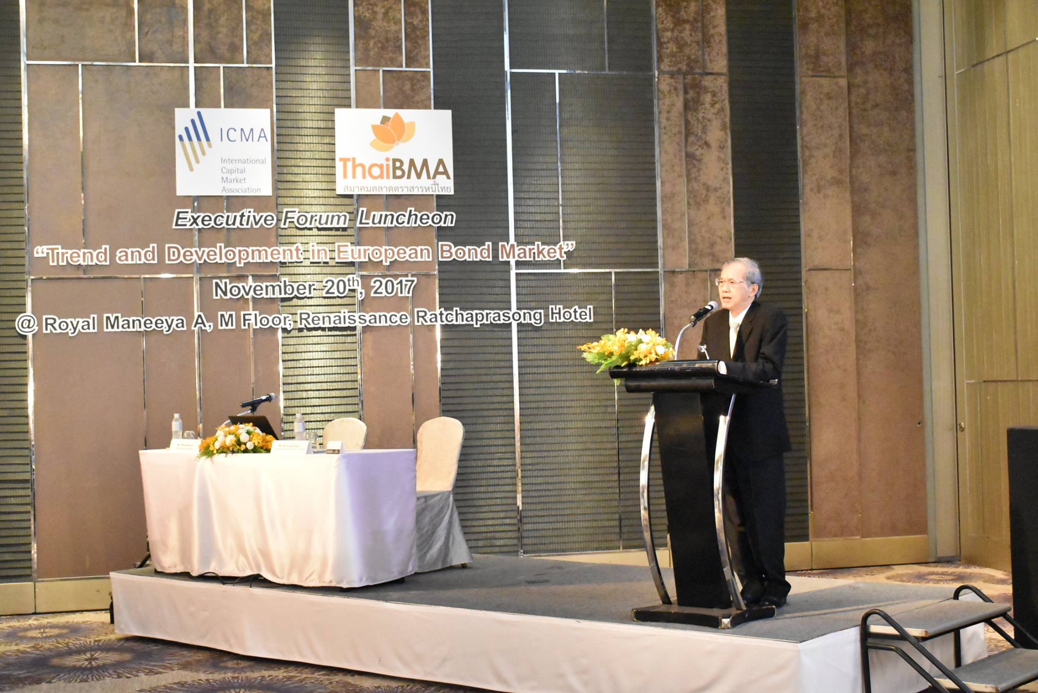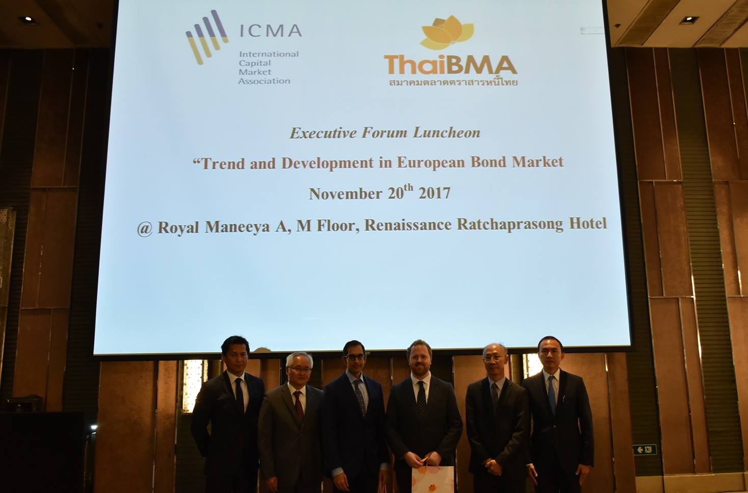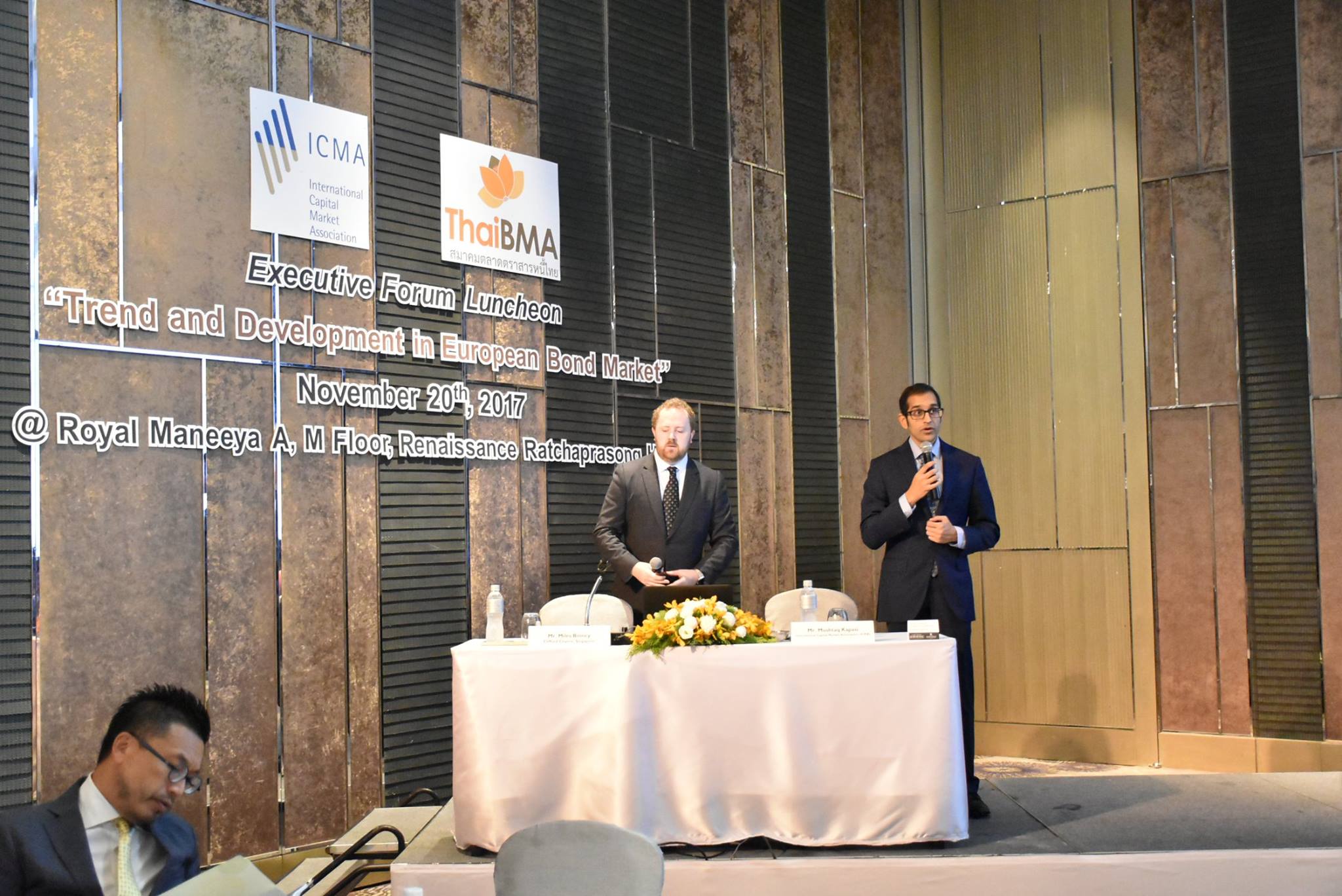 ThaiBMA Gallery Executive Forum Luncheon "Trend and Development in European Bond Market" วันที่20 พฤศจิกายน 2560 เวลา สถานที่Royal Maneeya A, M Floor, Renaissance Ratchaprasong Hotel รายละเอียด Executive Forum Luncheon "Trend and Development in European Bond Market" Welcome Speech by Dr.Pisit LeeahtamChairman, The Thai Bond Market Association Speakers: Mr.Mushtaq Kapasi - Chief Representative, Asia-Pacific International Capital Market Association (ICMA) Mr.Miles Binney - Senior AssociateClifford Chance, Singapore Back to Main Gallery