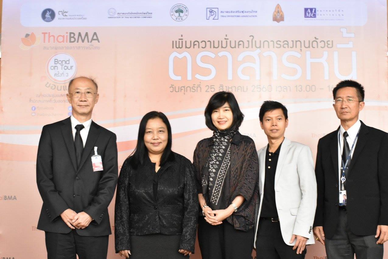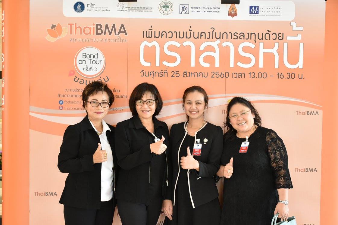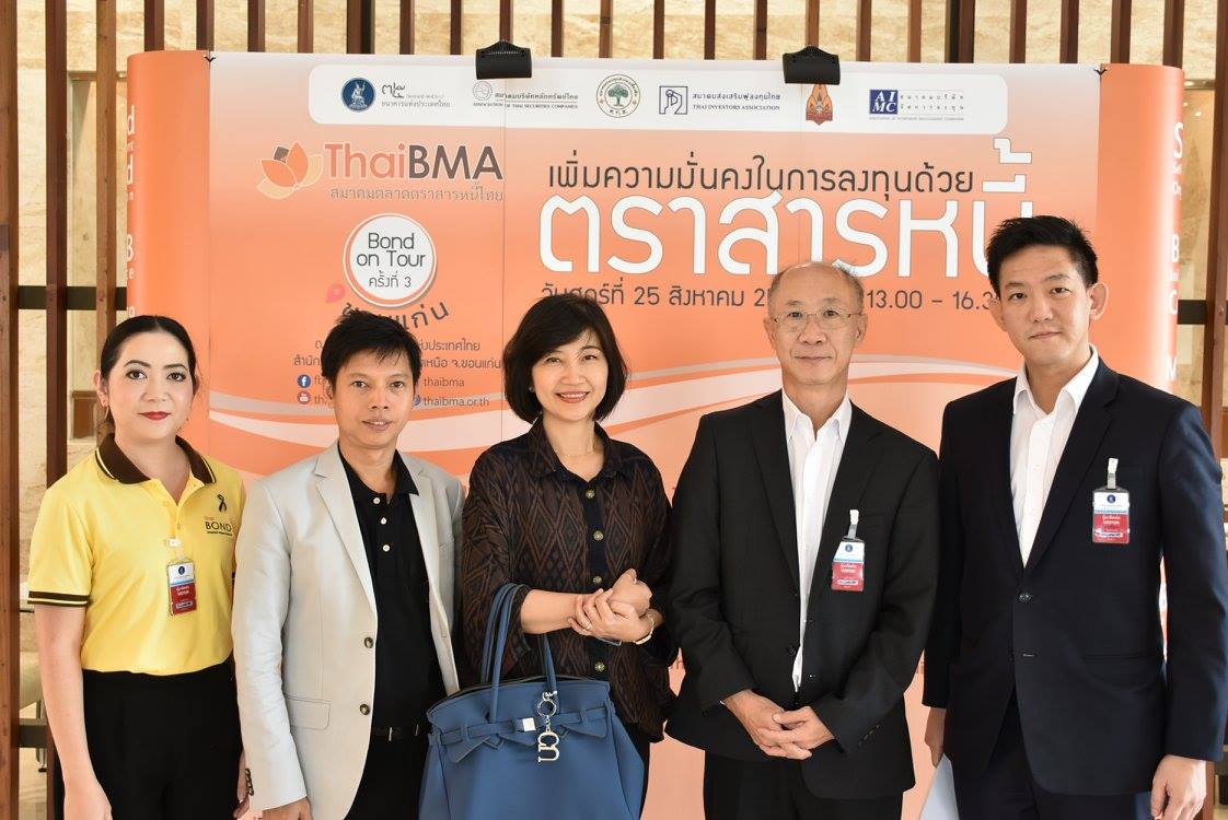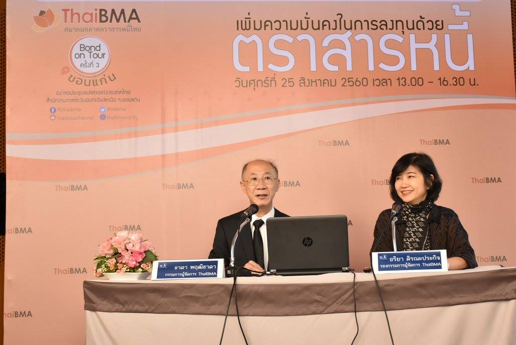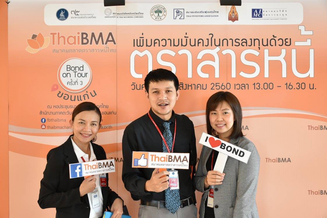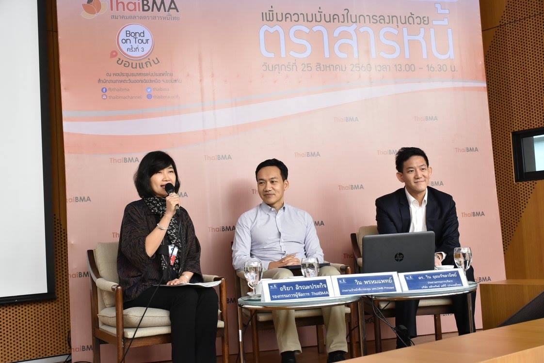 ThaiBMA Gallery เสวนา "เพิ่มความมั่นคงของผลตอบแทนด้วยการลงทุนหุ้นกู้" วันที่ 25 สิงหาคม 2560 เวลา สถานที่ หอประชุมปัญญาวิจิตร ธนาคารแห่งประเทศไทย สำนักงานภาคตะวันออกเฉียงเหนือ จังหวัดขอนแก่น รายละเอียด ThaiBMA ร่วมกับธนาคารแห่งประเทศไทย สำนักงานภาคตะวันออกเฉียงเหนือ จังหวัดขอนแก่น จัดงานสัมมนา Session 1 ออมใน (ตราสาร) หนี้ ก็มีดอกเบี้ยงอกเงยได้ โดย คุณธาดา พฤฒิธาดา กรรมการผู้จัดการ ThaiBMA และ คุณอริยา ติรณะประกิจ รองกรรมการผู้จัดการ ThaiBMA Session 2 เพิ่มความมั่นคงของผลตอบแทนด้วยการลงทุนหุ้นกู้ (ลงทุนอย่างวิน&วิน) โดยดร.วิน อุดมรัชตวนิชย์ ประธานกรรมการบริหาร บริษัทหลักทรัพย์ เคทีบี (ประเทศไทย) จำกัด และ คุณวิน พรหมแพทย์ ประธานเจ้าหน้าที่การลงทุน บริษัทหลักทรัพย์จัดการกองทุนซีไอเอ็มบี พรินซิเพิล จำกัด ดำเนินการเสวนาโดย คุณอริยา ติรณะประกิจ รองกรรมการผู้จัดการ ThaiBMA Back to Main Gallery