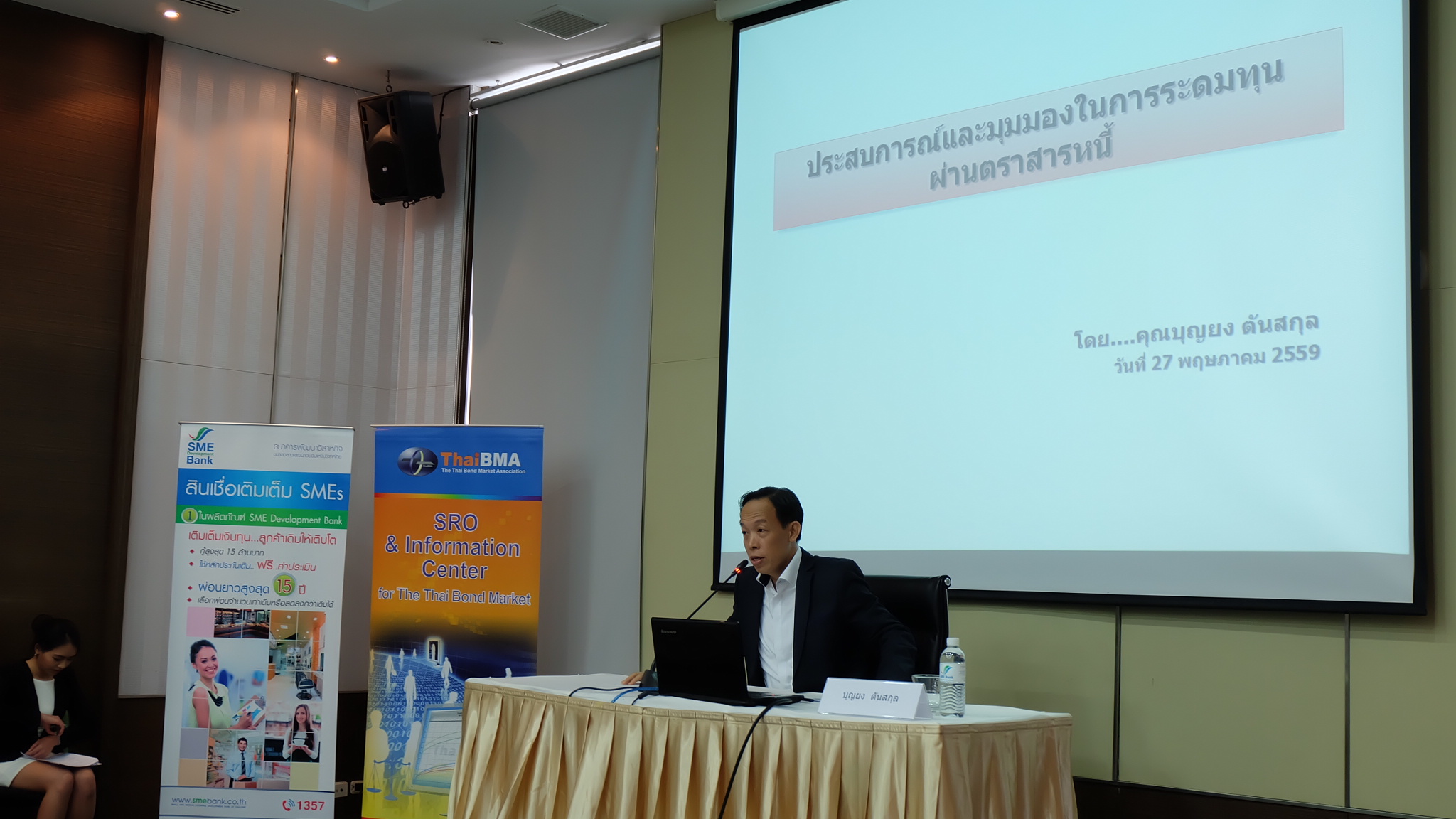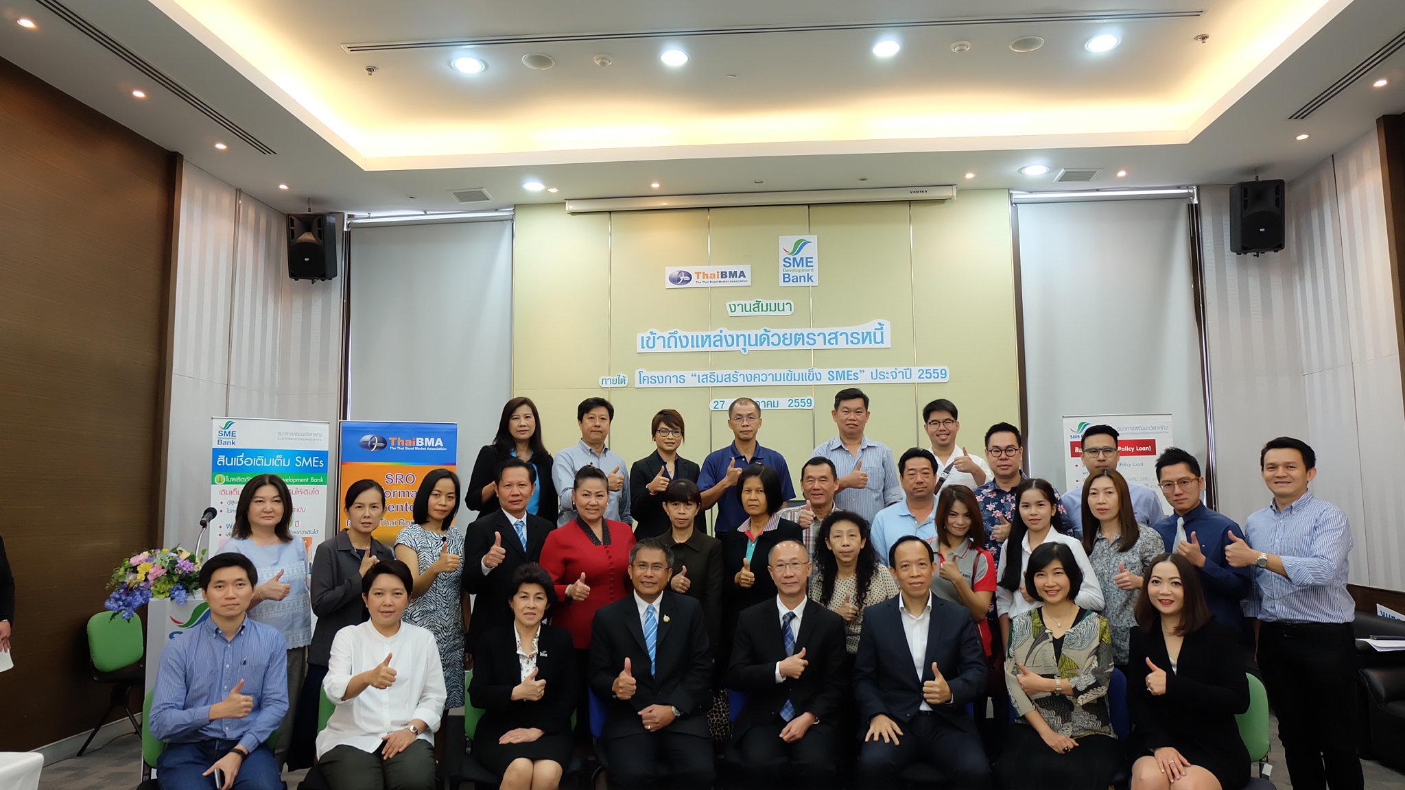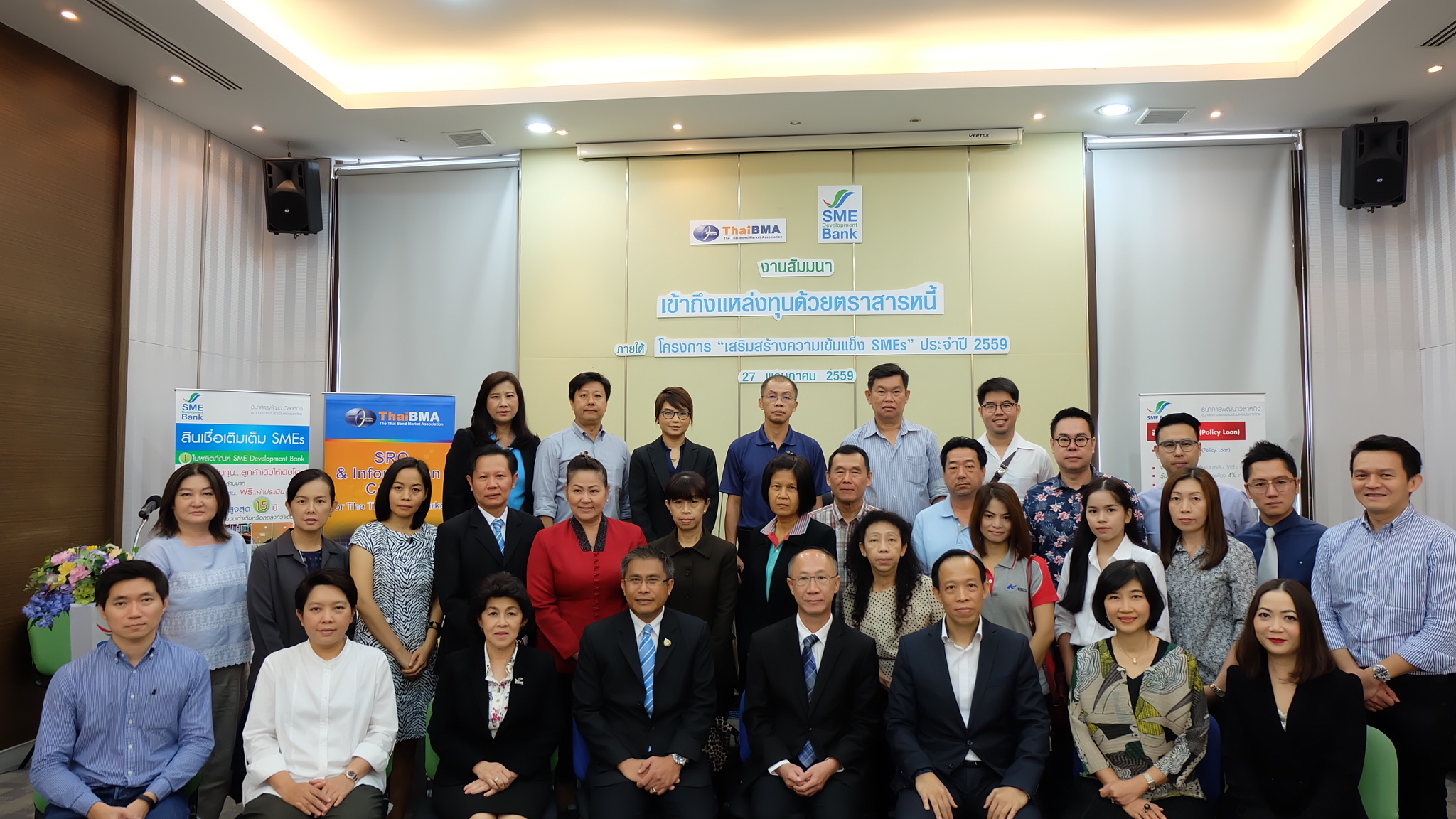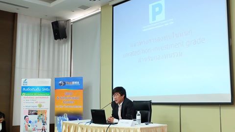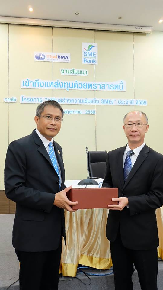 ThaiBMA Gallery สัมมนา "เข้าถึงแหล่งทุนด้วยตราสารหนี้" วันศุกร์ที่ 27 พฤษภาคม 2559 เวลา- สถานที่ณ ห้องประชุมทับทิม ชั้น 11 อาคาร SME Bank Tower รายละเอียด งานสัมมนา "เข้าถึงแหล่งทุนด้วยตราสารหนี้" ภายใต้โครงการ "เสริมสร้่างความเข้มแข็ง SMEs" ประจำปี 2559 วันศุกร์ที่ 27 พฤษภาคม 2559 ณ ห้องประชุมทับทิม ชั้น 11 อาคาร SME Bank Tower - กล่าวเปิดงานสัมมนา "เข้าถึงแหล่งทุนด้วยตราสารหนี้" โดยคุณวรมิตร ครุฑโต รองกรรมการผู้จัดการ SME Bank - สัมมนา "เข้าถึงแหล่งทุนด้วยตราสารหนี้" หัวข้อ "ประสบการณ์และมุมมองในการระดมทุนผ่านตราสารหนี้" โดย คุณบุญยง ตันสกุล อดีตกรรมการผู้จัดการใหญ่ บริษัท ซิงเกอร์ประเทศไทย จำกัด (มหาชน) - สัมมนา "เข้าถึงแหล่งทุนด้วยตราสารหนี้" หัวข้อ "เปรียบเทียบการออกตราสารหนี้กับการระดมทุนรูปแบบต่างๆ" โดย คุณวรรณ์พิมล ขอประเสริฐ Director บริษัท พีเจเคแคปิตอล จำกัด - สัมมนา "เข้าถึงแหล่งทุนด้วยตราสารหนี้" หัวข้อ "การเตรียมความพร้อม และขั้นตอนการระดมทุนผ่านตราสารหนี้" โดย คุณยอดฤดี สันตติกุล - สัมมนา "เข้าถึงแหล่งทุนด้วยตราสารหนี้" หัวข้อ "แนวทางการลงทุนในหุ้นกู้ Unrated / Non-investment grade สำหรับกองทุนรวม" โดย คุณวรรธนะ วงศ์สีนิล ประธานเจ้าหน้าที่บริหาร บริษัทหลักทรัพย์จัดการกองทุนรวม ฟิลลิปจำกัด Back to Main Gallery