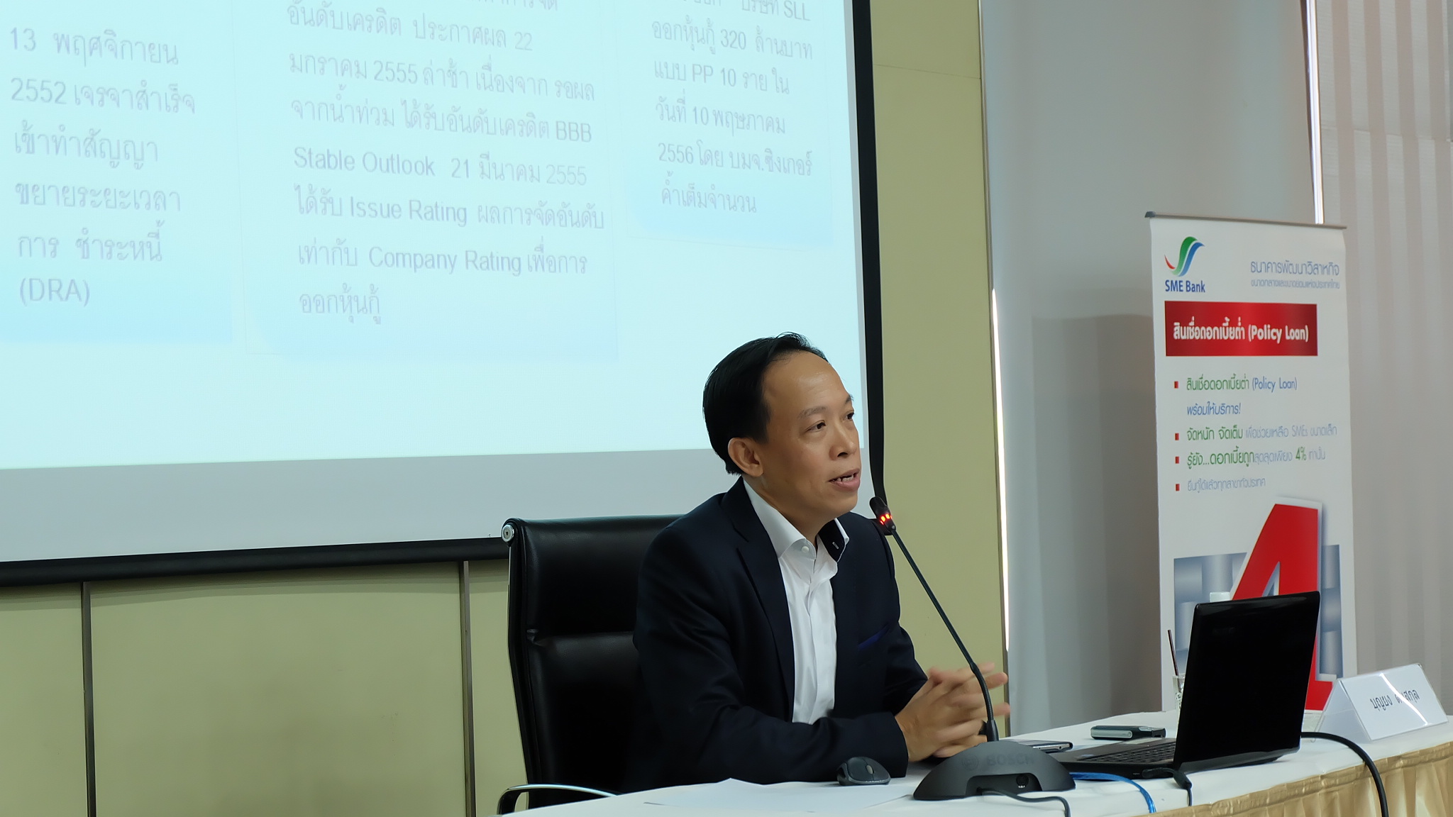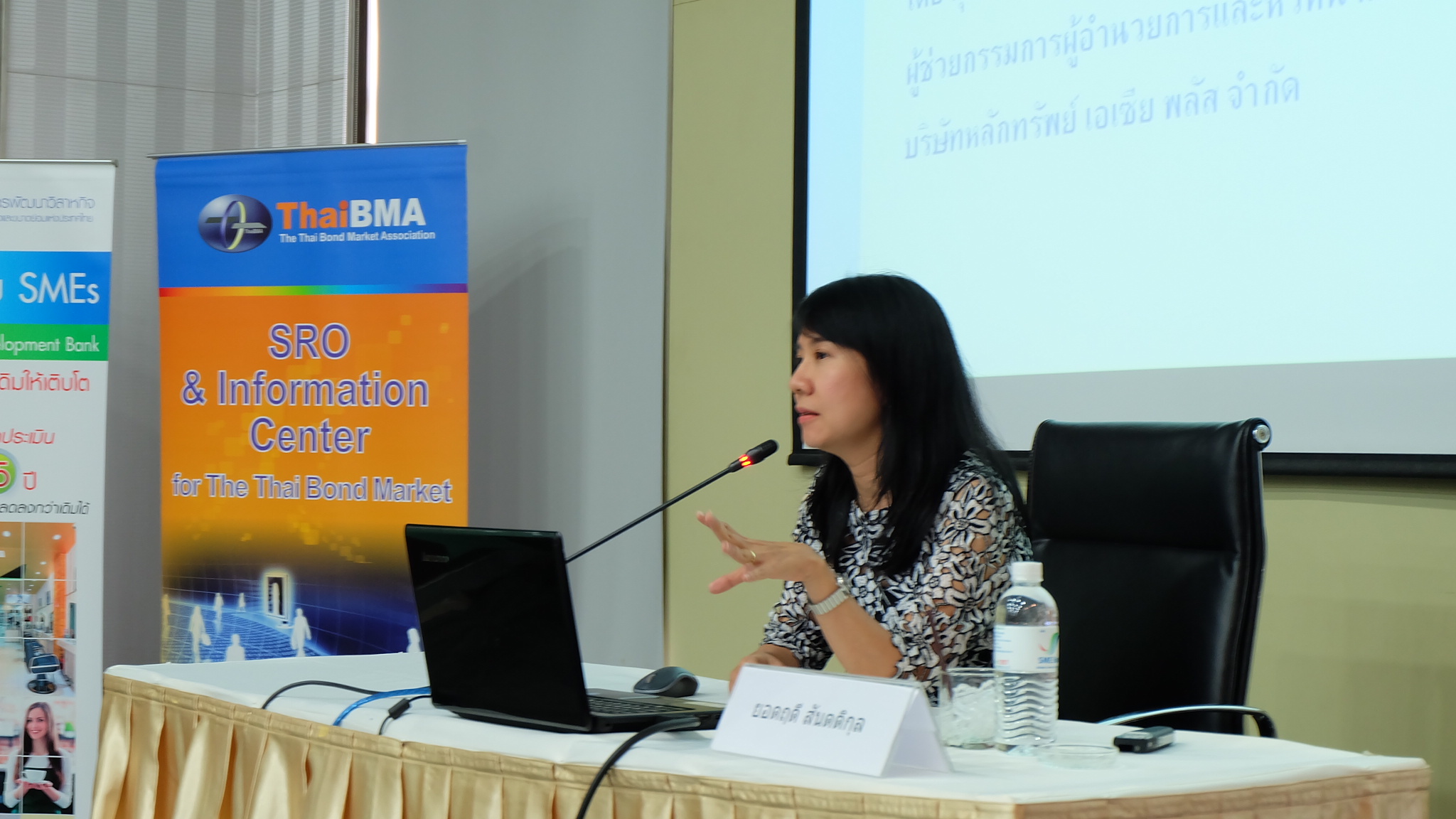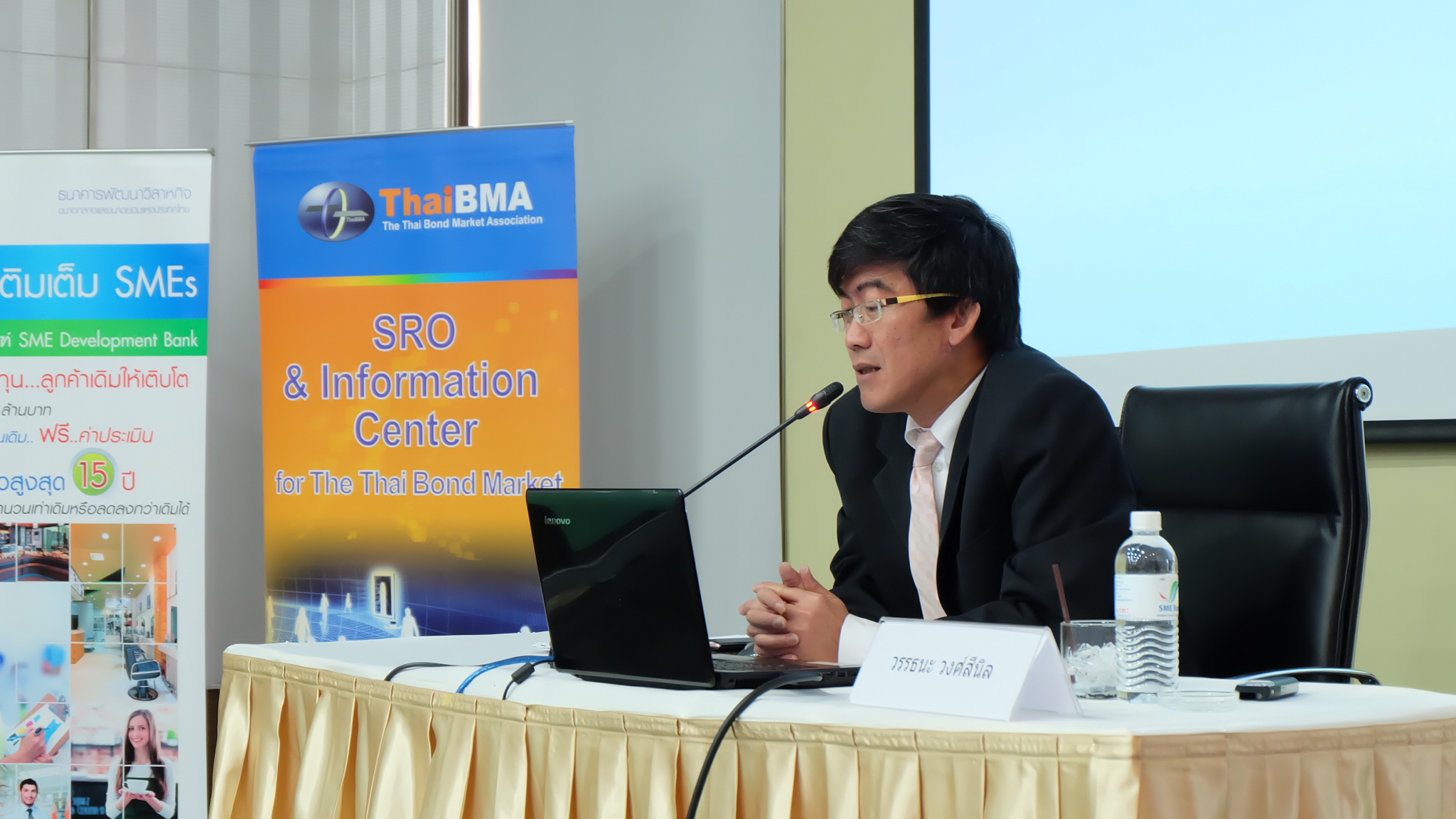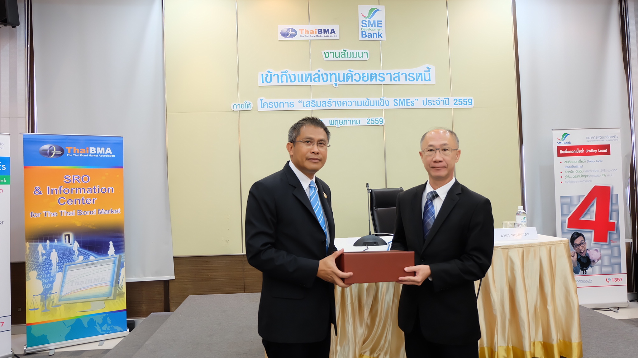 ThaiBMA Gallery สัมมนา "เข้าถึงแหล่งทุนด้วยตราสารหนี้" วันศุกร์ที่ 27 พฤษภาคม 2559 เวลา- สถานที่ณ ห้องประชุมทับทิม ชั้น 11 อาคาร SME Bank Tower รายละเอียด งานสัมมนา "เข้าถึงแหล่งทุนด้วยตราสารหนี้" ภายใต้โครงการ "เสริมสร้่างความเข้มแข็ง SMEs" ประจำปี 2559 วันศุกร์ที่ 27 พฤษภาคม 2559 ณ ห้องประชุมทับทิม ชั้น 11 อาคาร SME Bank Tower - กล่าวเปิดงานสัมมนา "เข้าถึงแหล่งทุนด้วยตราสารหนี้" โดยคุณวรมิตร ครุฑโต รองกรรมการผู้จัดการ SME Bank - สัมมนา "เข้าถึงแหล่งทุนด้วยตราสารหนี้" หัวข้อ "ประสบการณ์และมุมมองในการระดมทุนผ่านตราสารหนี้" โดย คุณบุญยง ตันสกุล อดีตกรรมการผู้จัดการใหญ่ บริษัท ซิงเกอร์ประเทศไทย จำกัด (มหาชน) - สัมมนา "เข้าถึงแหล่งทุนด้วยตราสารหนี้" หัวข้อ "เปรียบเทียบการออกตราสารหนี้กับการระดมทุนรูปแบบต่างๆ" โดย คุณวรรณ์พิมล ขอประเสริฐ Director บริษัท พีเจเคแคปิตอล จำกัด - สัมมนา "เข้าถึงแหล่งทุนด้วยตราสารหนี้" หัวข้อ "การเตรียมความพร้อม และขั้นตอนการระดมทุนผ่านตราสารหนี้" โดย คุณยอดฤดี สันตติกุล - สัมมนา "เข้าถึงแหล่งทุนด้วยตราสารหนี้" หัวข้อ "แนวทางการลงทุนในหุ้นกู้ Unrated / Non-investment grade สำหรับกองทุนรวม" โดย คุณวรรธนะ วงศ์สีนิล ประธานเจ้าหน้าที่บริหาร บริษัทหลักทรัพย์จัดการกองทุนรวม ฟิลลิปจำกัด Back to Main Gallery