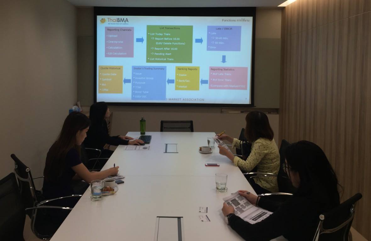 ThaiBMA Gallery ThaiBMA จัดอบรมวิธีการใช้งานระบบการรายงานข้อมูลการซื้อขาย (ORS) ให้กับสมาชิก วันอังคารที่ 27 กันยายน 2559 เวลา- สถานที่ณ สมาคมตลาดตราสารหนี้ไทย ชั้น 10 อาคารต้นสนทาวเวอร์ รายละเอียด ThaiBMAจัดอบรมวิธีการใช้งานระบบการรายงานข้อมูลการซื้อขาย (ORS) ให้กับสมาชิกเพื่อให้สามารถใช้งานได้อย่างถูกต้องครบถ้วน ระบบ One-Stop Reporting & Self-Monitoring System (ORS) นอกจากจะเป็นระบบที่ใช้การรายงานการซื้อขายแล้ว ยังรวบรวมสิ่งที่เกี่ยวข้องกับรายการซื้อขายมาไว้ในที่เดียว อาทิ การจัดอันดับผู้ค้าตราสารหนี้ ข้อมูลเชิงสถิติต่างๆ เพื่อให้สมาชิกสามารถนำข้อมูลไปใช้ในการวิเคราะห์้ต่อไป Back to Main Gallery