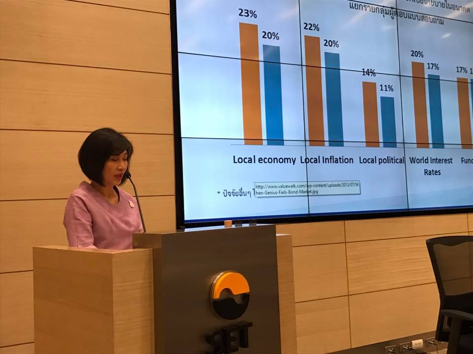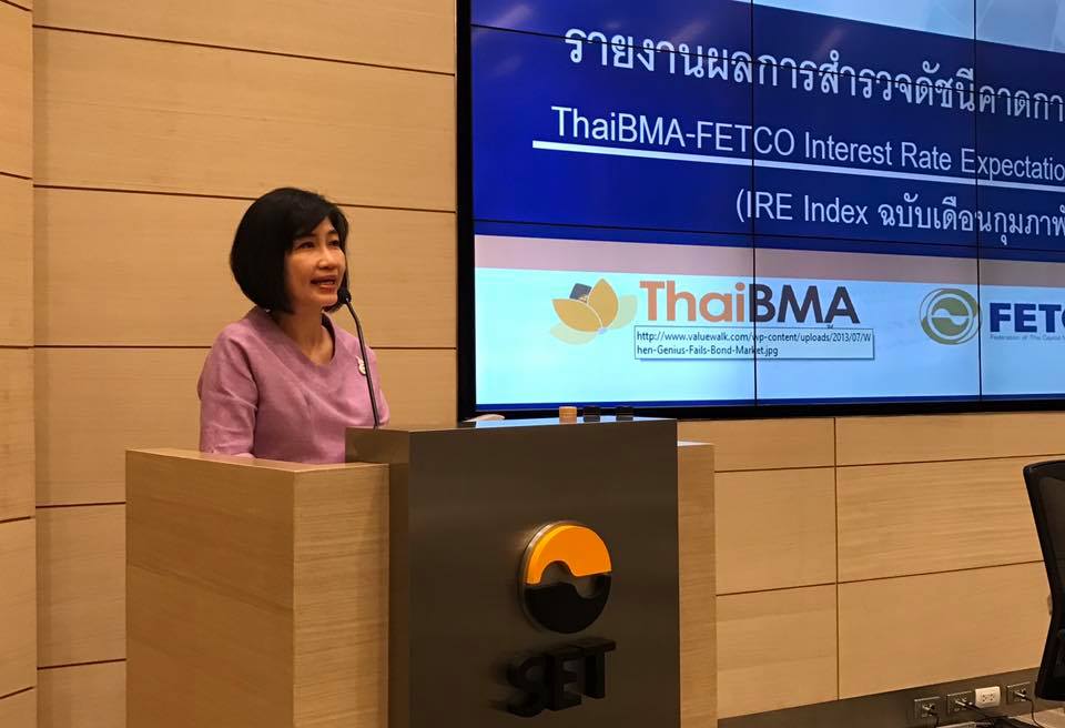 ThaiBMA Gallery รายงานผลการสำรวจดัชนีคาดการณ์อัตราดอกเบี้ย ฉบับเดือนกุมภาพันธ์ 2561 วันที่7 กุมภาพันธ์ 2561 เวลา สถานที่ ณ ตลาดหลักทรัพย์แห่งประเทศไทย รายละเอียด นางสาวอริยา ติรณะประกิจ รองกรรมการผู้จัดการ สมาคมตลาดตราสารหนี้ไทย ได้แถลงรายงานผลการสำรวจดัชนีคาดการณ์อัตราดอกเบี้ย (ThaiBMA-FETCO Interest Rate Expectation Index Survey) ฉบับเดือนกุมภาพันธ์ 2561 โดยดัชนีคาดการณ์อัตราดอกเบี้ยนโยบายในการประชุมกนง. ที่จะถึงนี้ (14 ก.พ. 61) อยู่ในเกณฑ์“ไม่เปลี่ยนแปลงไปจากปัจจุบัน (Unchanged)" ณ ตลาดหลักทรัพย์แห่งประเทศไทย ในวันที่ 7 กุมภาพันธ์ 2561 Back to Main Gallery