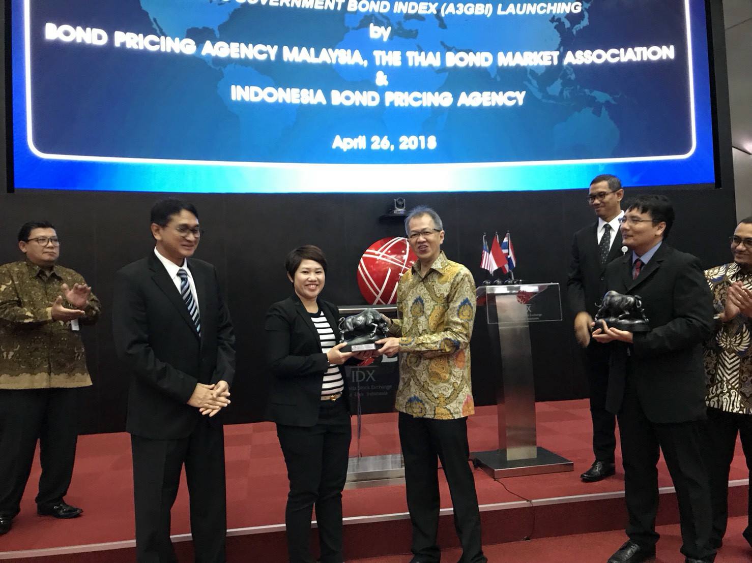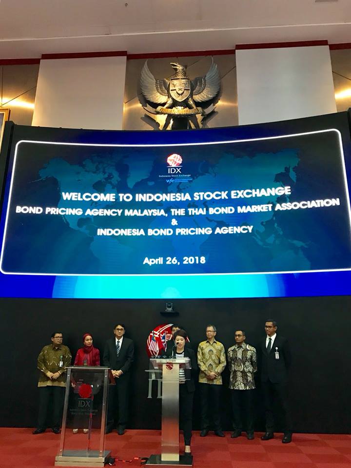ThaiBMA Gallery งานแถลงข่าวความร่วมมือการจัดทำ A3GBI วันที่ 26 เมษายน 2561 เวลา สถานที่ณ ตลาดหลักทรัพย์แห่งประเทศอินโดนีเซีย ณ กรุงจาการ์ตา รายละเอียด ภายหลังจากงานแถลงข่าวเปิดตัว Asean3 Government Bond Index (A3GBI) ที่ประเทศมาเลเซีย ที่ผ่านมา ในวันที่ 26 เมษายน 2561 นี้ ดร.กุลกัลยา พระยาราช ผู้อำนวยการอาวุโส ฝ่ายบริการราคาตราสารหนี้และพัฒนาผลิตภัณฑ์ สมาคมตลาดตราสารหนี้ไทย (ThaiBMA) ได้เป็นตัวแทนของสมาคมตลาดตราสารหนี้ไทยในงานแถลงข่าวความร่วมมือการจัดทำ A3GBI ที่ตลาดหลักทรัพย์แห่งประเทศอินโดนีเซีย ณ กรุงจาการ์ตา พร้อมทั้งบรรยายภาพรวมของตลาดตราสารหนี้ไทยและความสำเร็จในความร่วมมือการจัดทำ A3GBI ในครั้งนี้ Back to Main Gallery