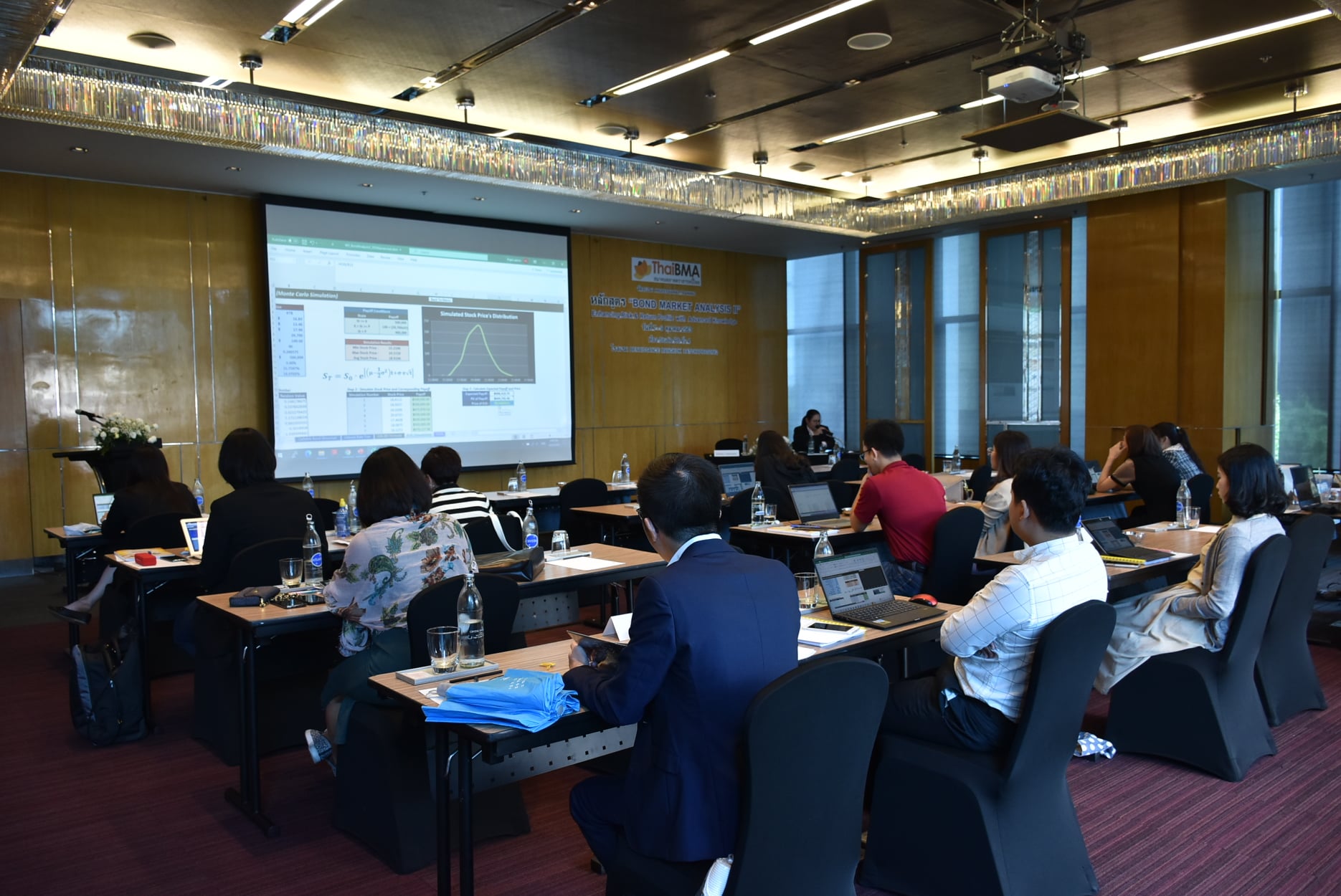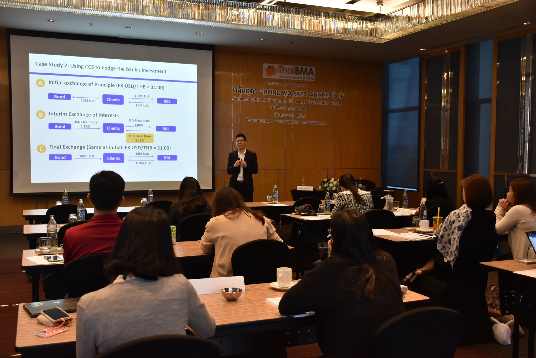 ThaiBMA Gallery การอบรมหลักสูตร "Bond Market Analysis II" ภาพบรรยากาศวันที่สามของการอบรม หลักสูตร "Bond Market Analysis II" ในรูปแบบ Hybrid Classroom ซึ่งจัดขึ้นในวันที่ 9 ตุลาคม 2563 เวลา 08.30-17.00 น. ณ โรงแรมเรเนซองส์ กรุงเทพฯ ราชประสงค์ หัวข้ออบรมในวันนี้ ช่วงที่ 1 Practical Use of Interest Rate Swaps in Commercial Banks โดย คุณสกุล บุญดีสกุลโชค, VP, ธนาคารกรุงเทพ จำกัด (มหาชน) ช่วงที่ 2 Fixed Income Derivatives & Structured Products โดย คุณวรงค์ วงศ์สินอุดม, FVP, Product Solution Group, ธนาคารกรุงไทย จำกัด (มหาชน) ช่วงที่ 3 Computer-based Workshop with Excel โดย คุณปวีณา รุ่งรัตนพงษ์พร และคุณกรกวิน พิชญโยธิน, ฝ่ายบริการราคาและพัฒนาตลาด, สมาคมตลาดตราสารหนี้ไทย หลักสูตรทั้งหมดของ ThaiBMA www.thaibma.or.th/EN/Training/SeminarCourse.aspx Back to Main Gallery